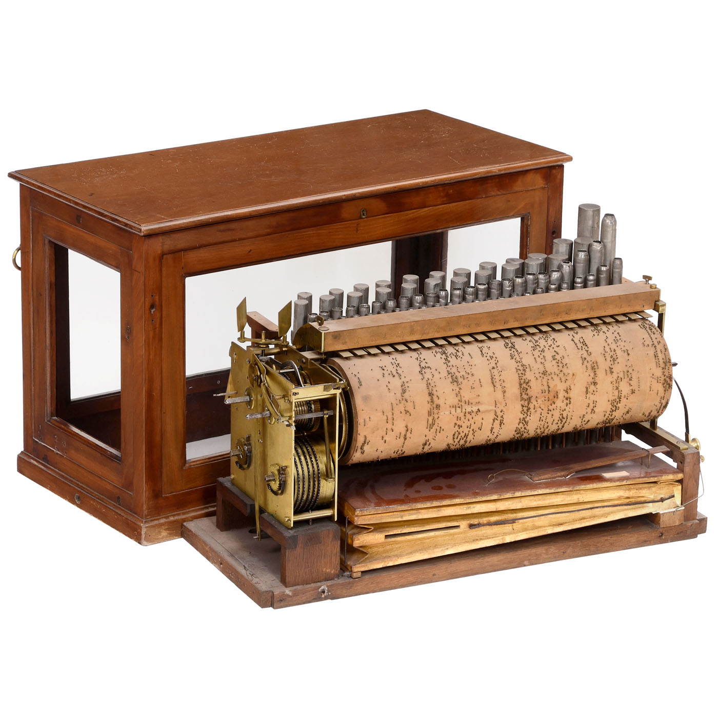 Jean-Honore Davrainville, Quai Pelletier 10, Paris. Brass movement, double-spring fusee movement, large centrifugal governor, pinned wood barrel with 13 melodies, 24 tone steps, 72 tin pipes in 3 switchable stops, formerly built into a secretary or clock base, now housed in a four-sided glazed walnut case, 28 x 13 x 17 in., good playing condition, needs a little more air when all 3 stops are pulled. - Note: Davrainville was one of the most renowned makers of musical instruments and organs in the first half of the 19th century. He built around 500 instruments in his Paris workshop, of which only a few are known today, most to be found in museums or private collections.