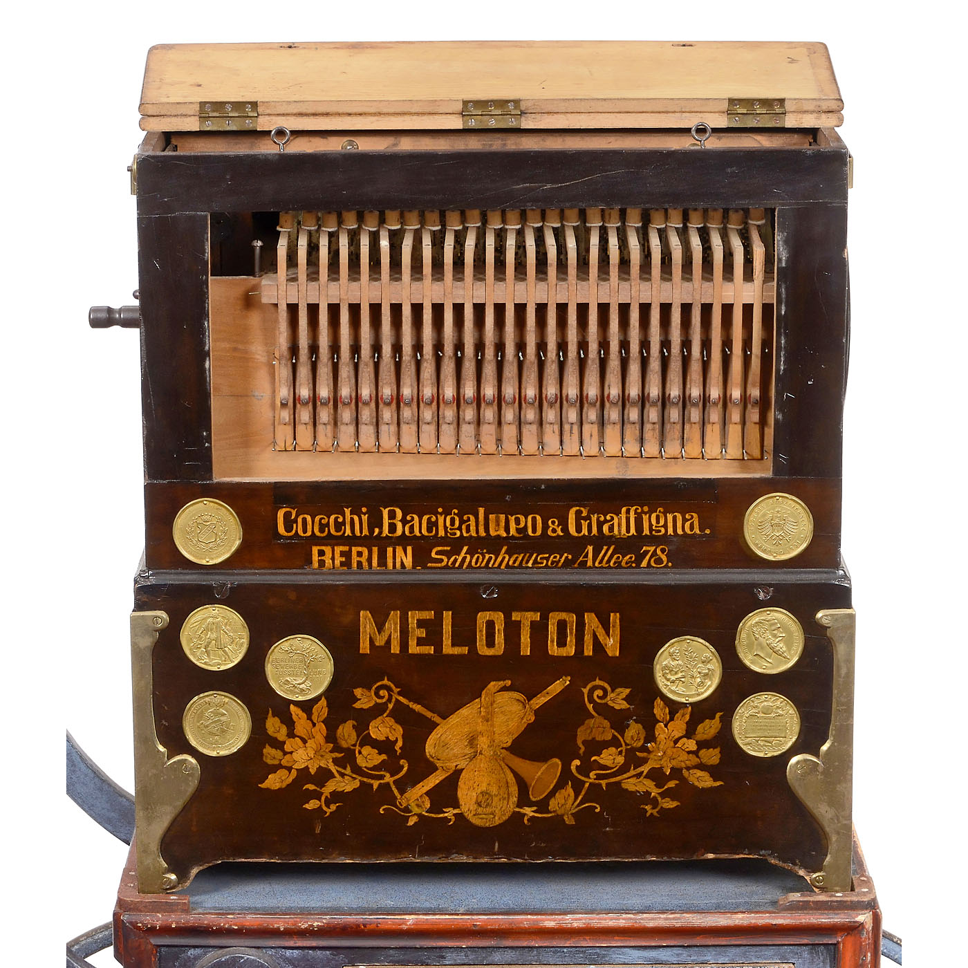 Meloton, marked "Cocchi, Bacigalupo & Graffigna, Berlin, Schönhauser Allee 78", 24 keys, 9 airs, reed organ, front with inlay and medals, tune-sheet, good original playing condition, 17 ¾ x 11 ¾ x 20 in., on later cart.
