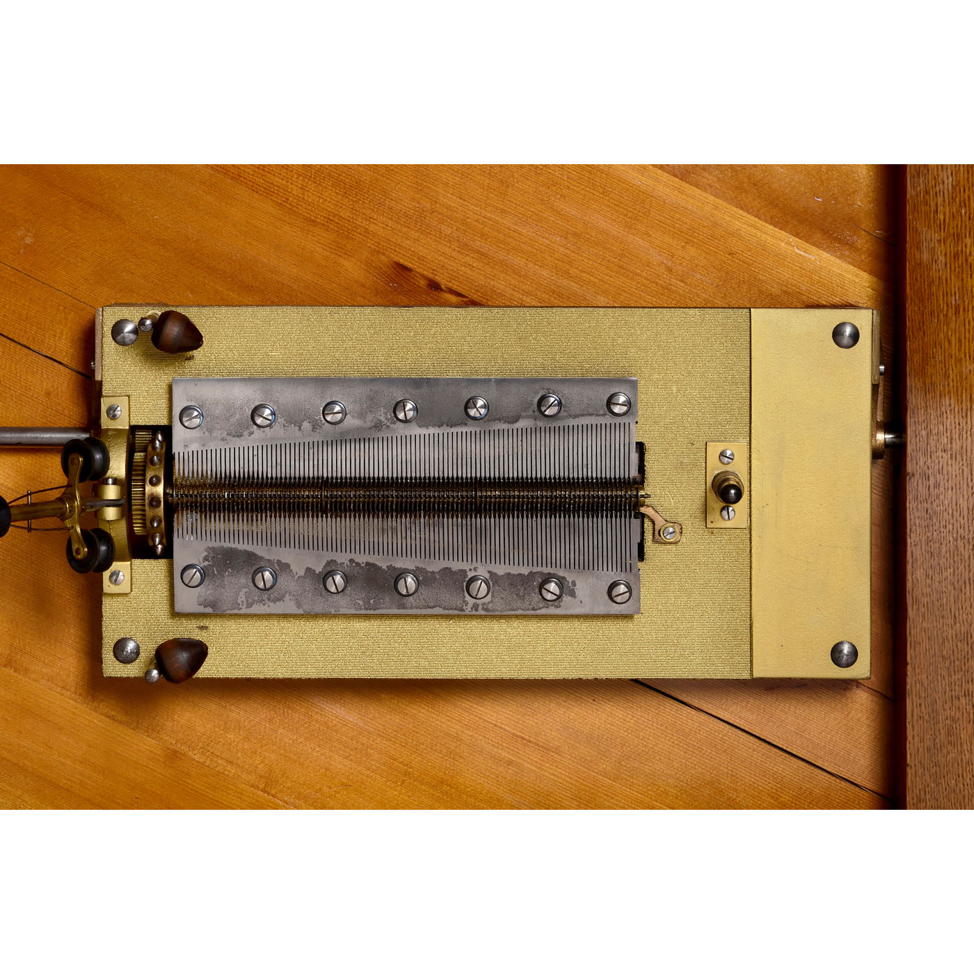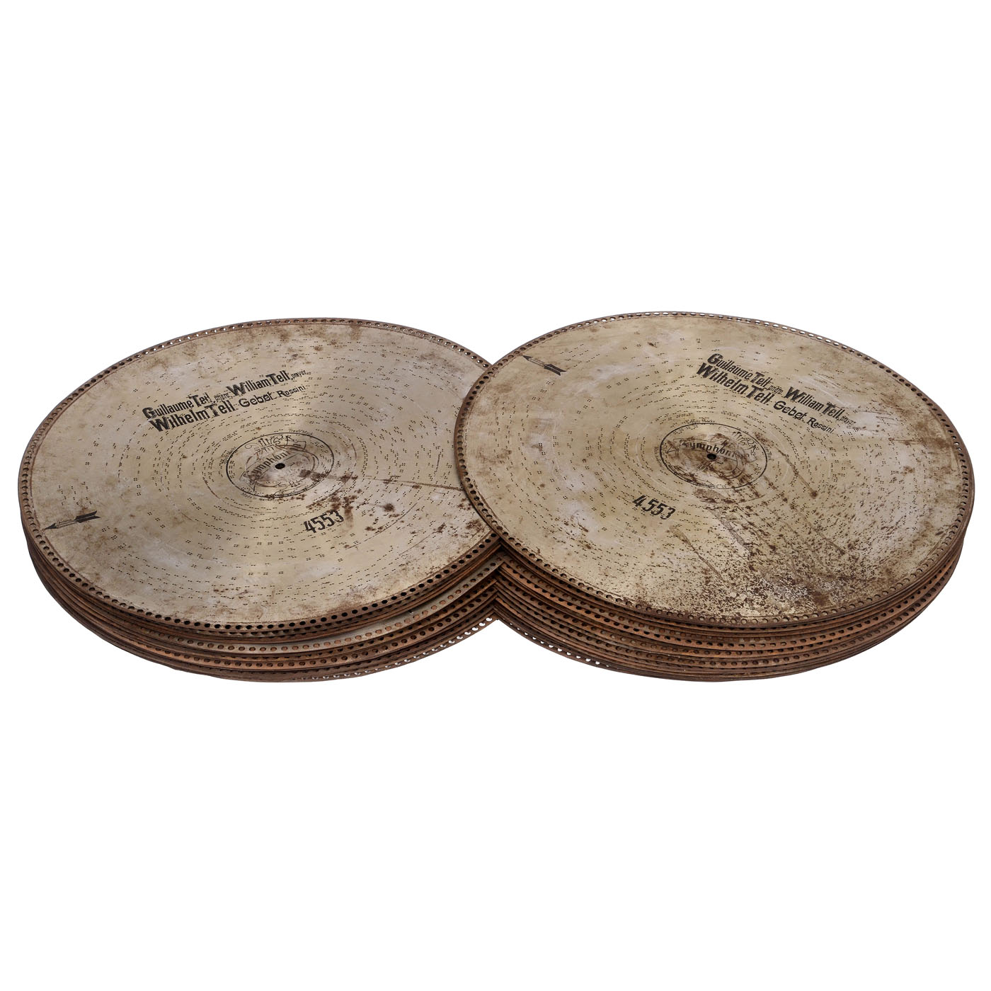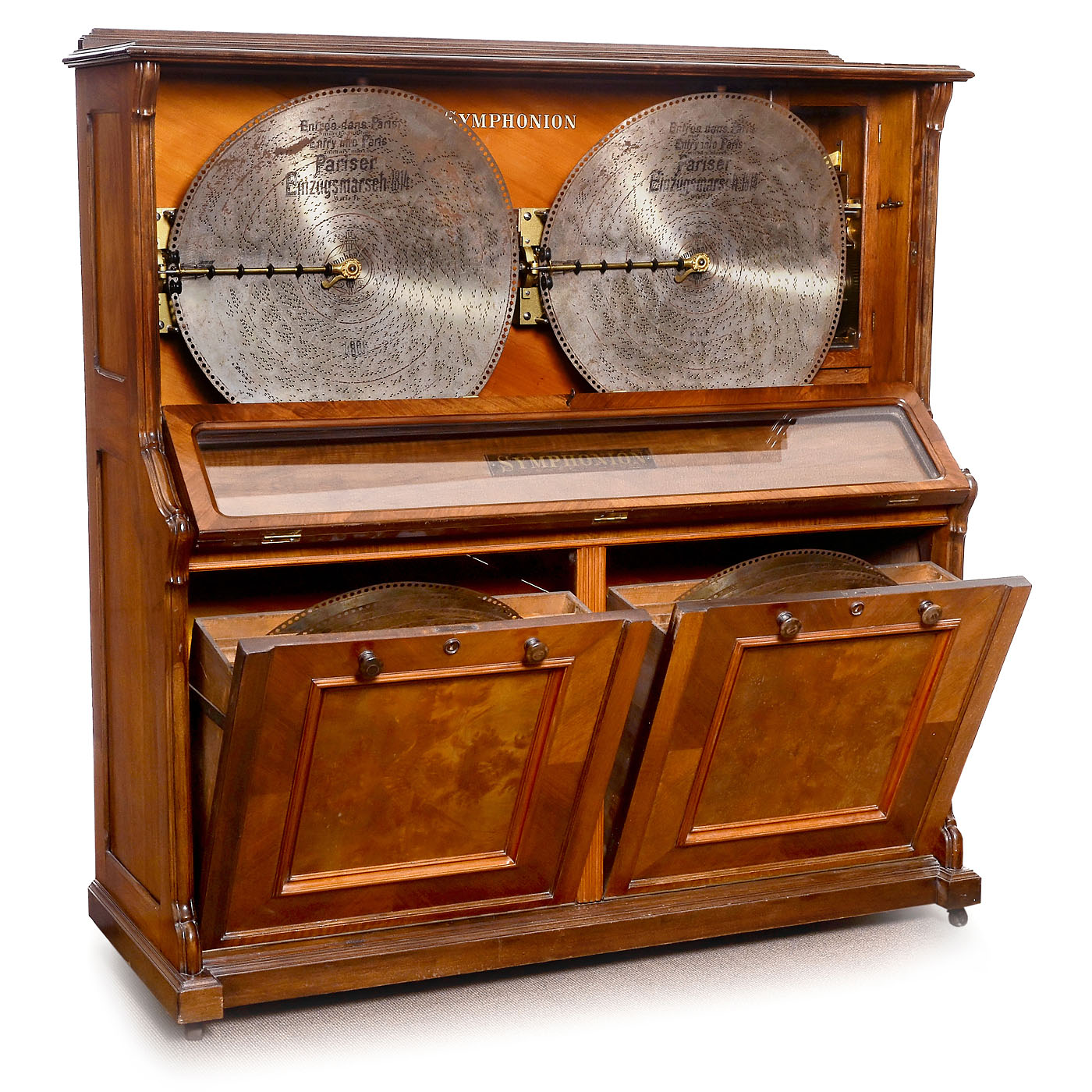 Symphonion Musikwerke, Leipzig. With twin 25 1/4-inch double-comb movements with 192 teeth in each comb (all complete), powerful double-spring motor, coin-activated mechanism, walnut piano-form cabinet, folding glazed movement cover, front and rear motor doors and coin-drawer, two compatments for discs, overall size 62 x 22 x 64 ½ in., excellent original playing condition, an instrument with glorious tone effect and magnificent richness of sound. - With twenty pairs of discs (forty in total): Rosen aus dem Süden, Die Gigerlkönigin; Die Heimatsglocken; Das Bienenhaus; Das Wandern ist des Müllers Lust; Der Rixdorfer; Parademarsch im Schritt; An der schönen blauen Donau; Pariser Einzugsmarsch; Torgauer Marsch; Wenn die Blätter leise rauschen; Der Obersteiger; Wilhelm Tell (Gebet); Am wunderschönen Rhein; Mai Walzer; Weisst du Muatterln was I träumt hab?; Hipp Hipp, Hurra; Silberfischchen; Die Grasmücken and Daisy Bell.