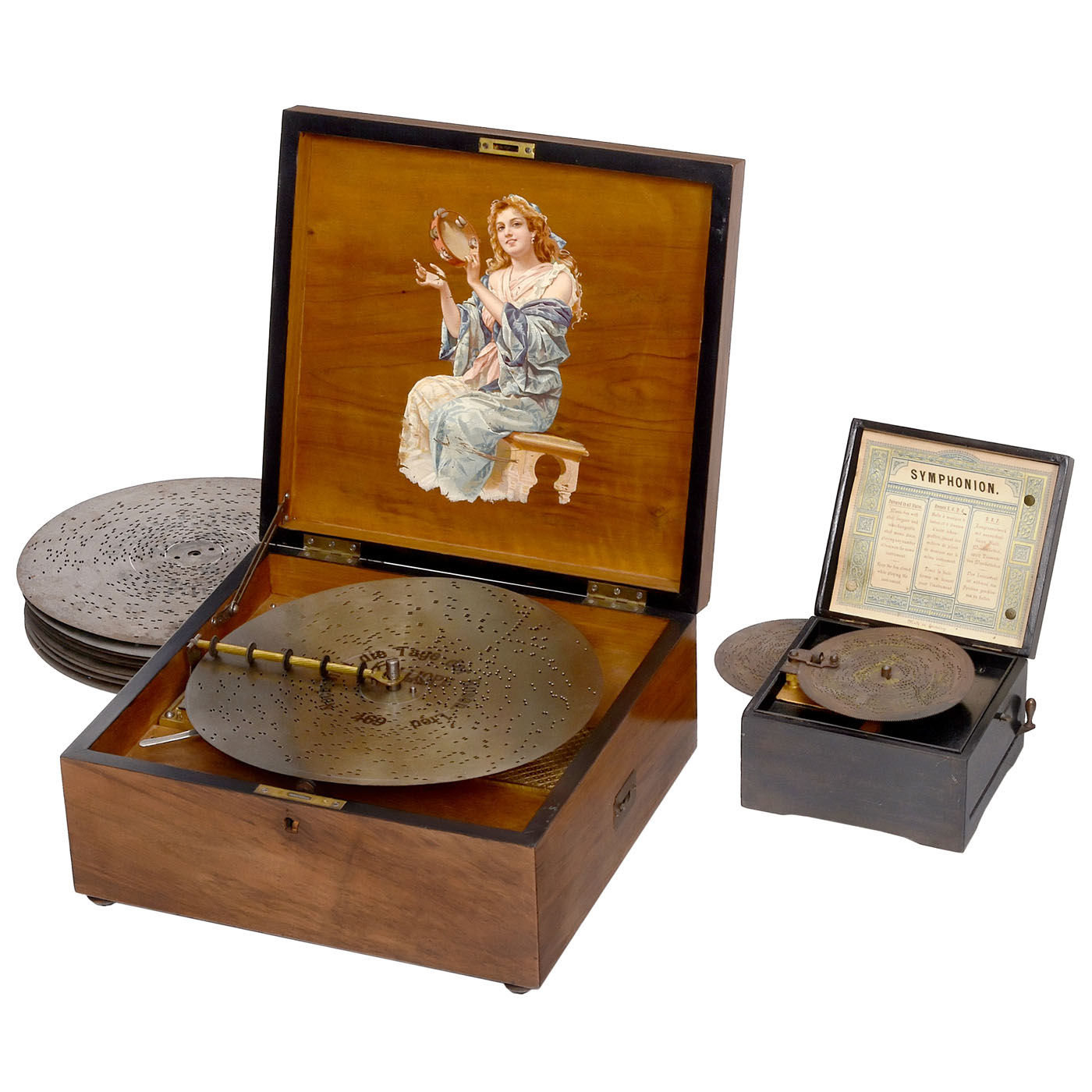 1) Kalliope No. 60, Kalliope Musikwerke, Leipzig, for 13 1/3 in. discs, 61 teeth in steel comb (complete), very good playing condition, missing crank, with 13 discs. - 2) Symphonion No. 29, Symphonion Musikwerke, Leipzig, for 5 ¾ in. discs, 40 teeth in steel comb (complete), very good playing condition, with 2 discs. - And: 3) 3 Books: "Encyclopedia of Automatic Musical Instruments", "Musikautomaten und mechanische Musikinstrumente" and "Mechanische Musikinstrumente früherer Zeiten und ihre Musik".