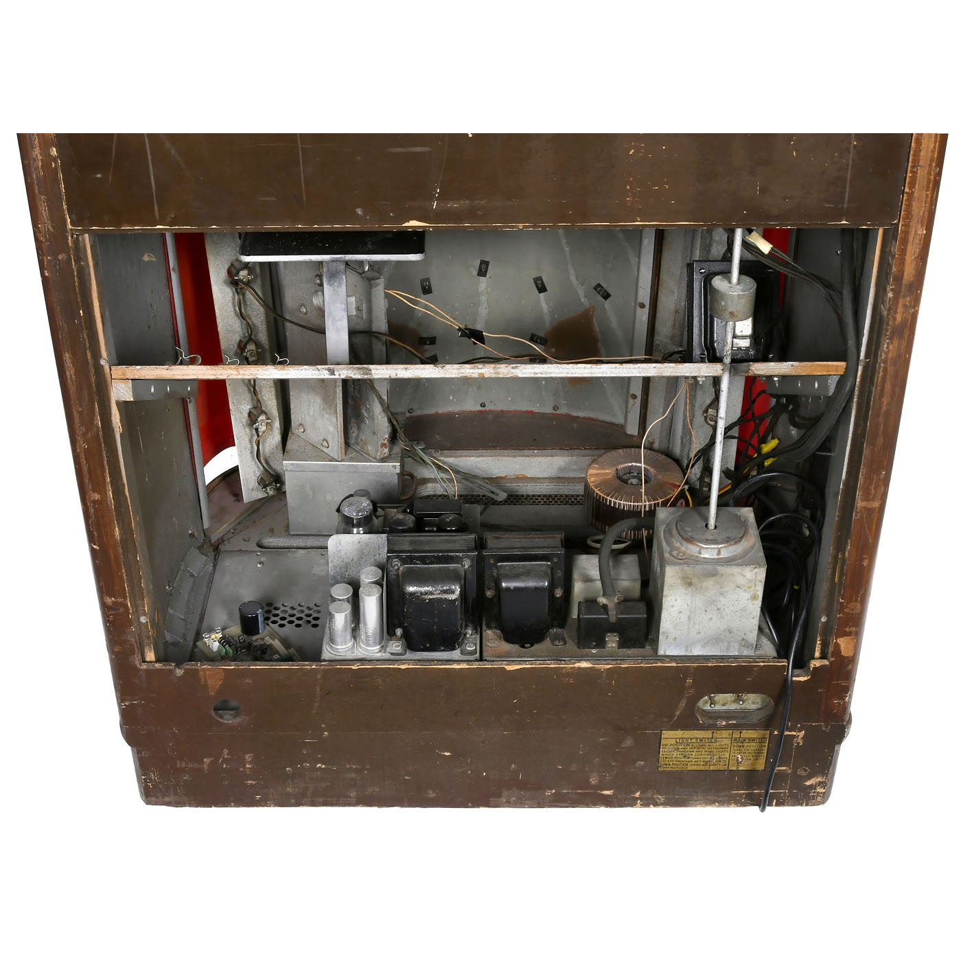 J.P. Seeburg, Chicago. For 20 78-rpm records, 20 selections, 220 volts, wood cabinet, size 36 x 26 x 45 in., good optical condition, in need of minor repairs.