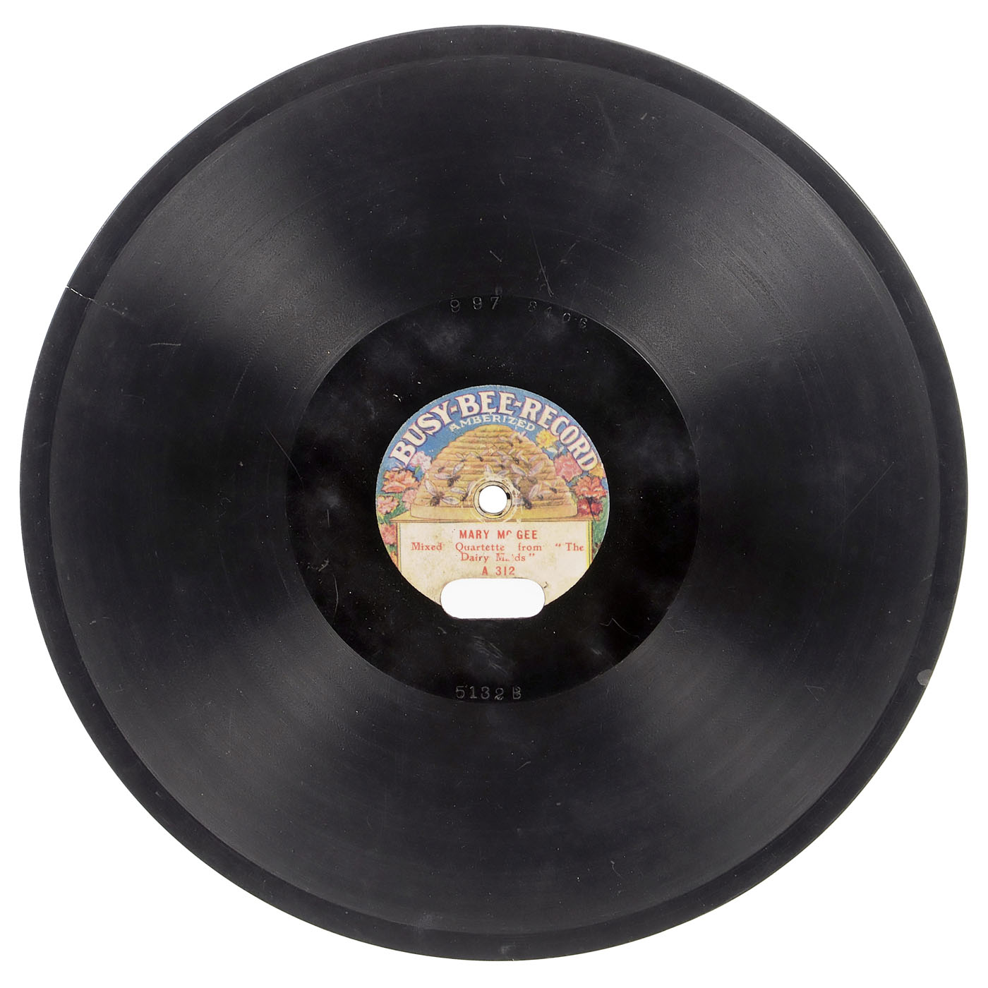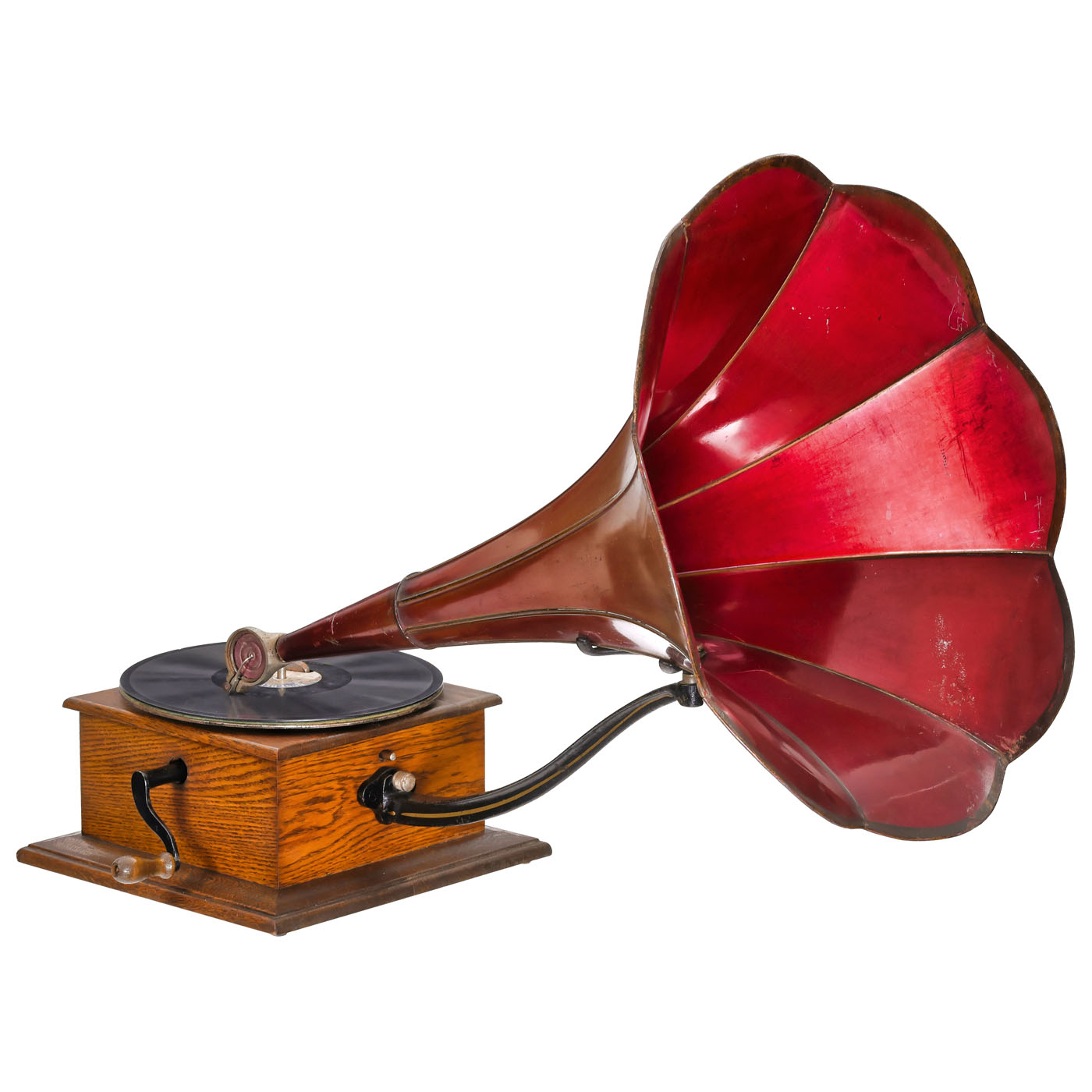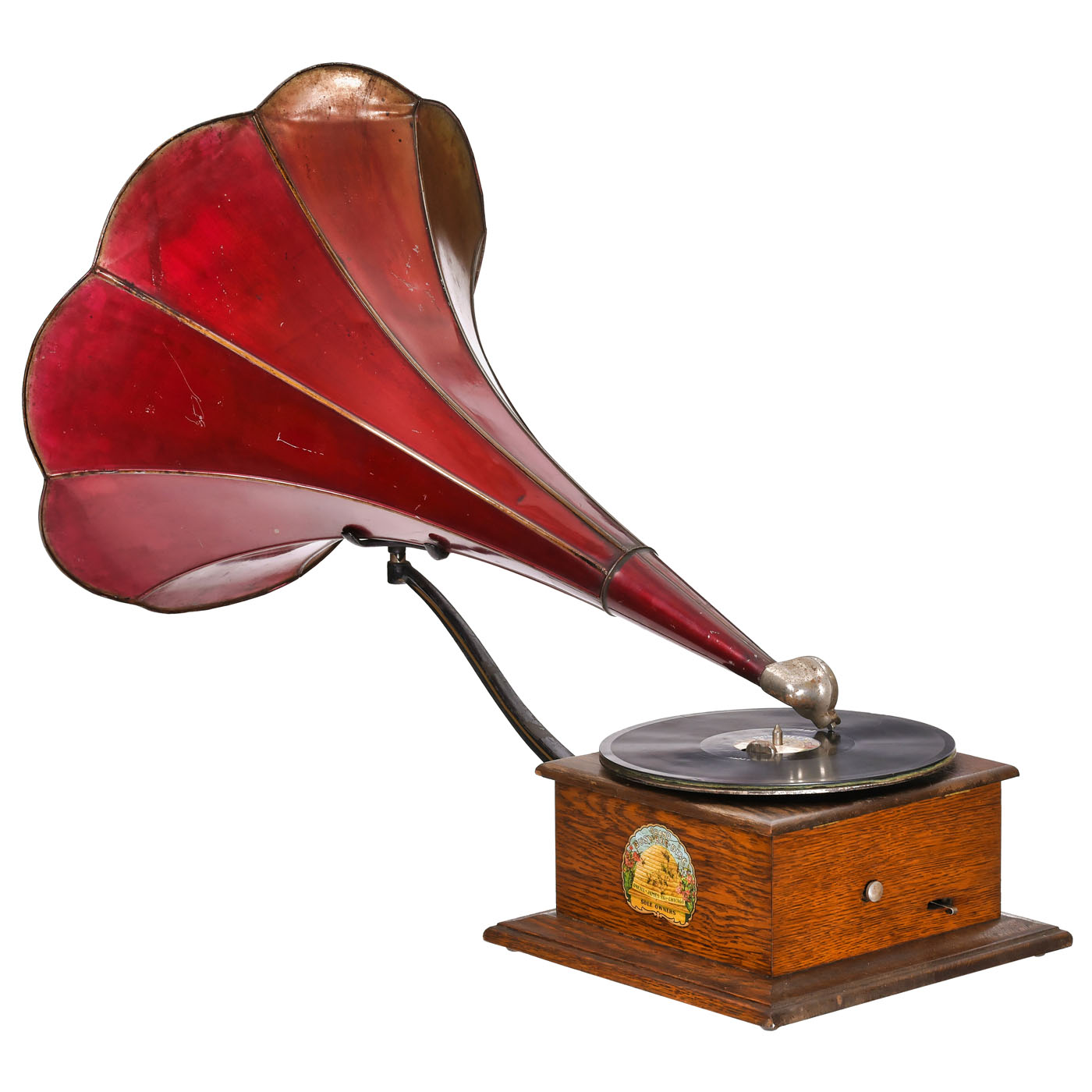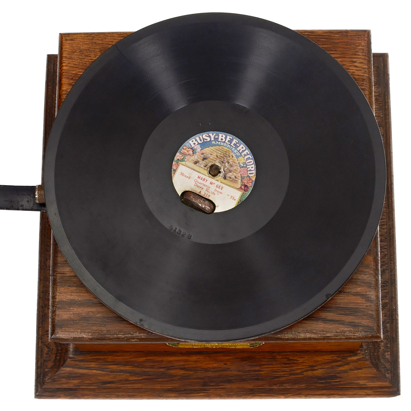 Distributed by the O'Neill-James company of Chicago, unusual model with an extra projection on the turntable (ensuring loyalty by compelling owners to buy Busy Bee records), oak case with maker's transfer, typical Hawthorne and Sheble single-spring motor, oversize support arm with bracket, original large painted metal horn, length 25 in., reproducer with aluminum diaphragm, unrestored original condition, works well, with 2 rare Busy-Bee records.