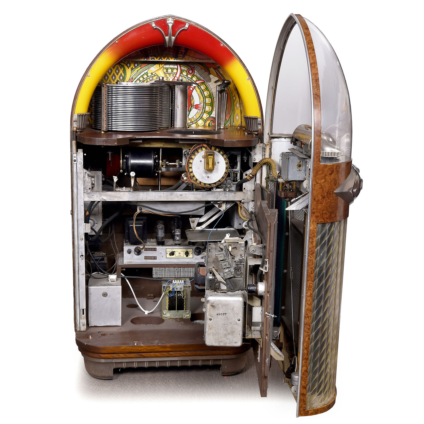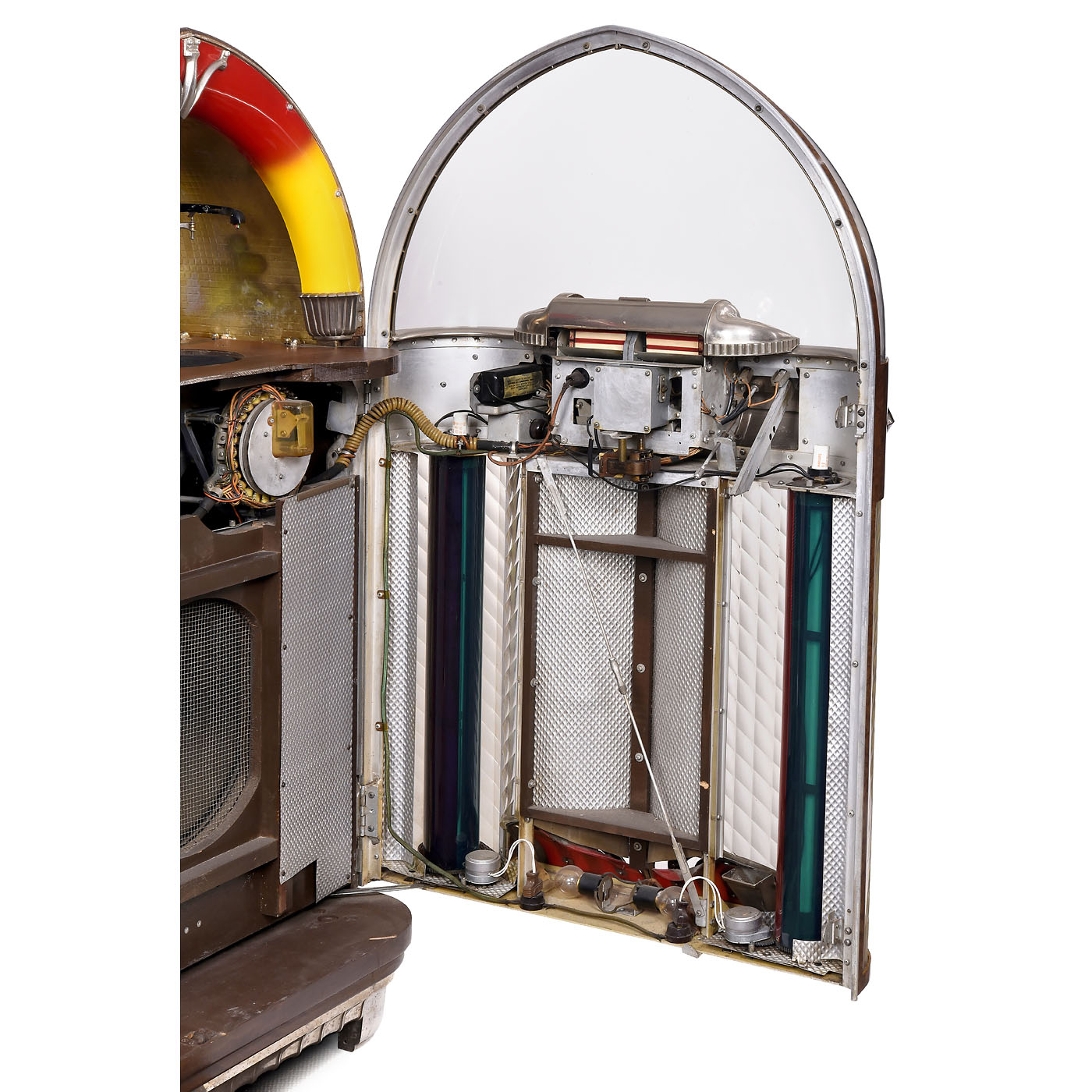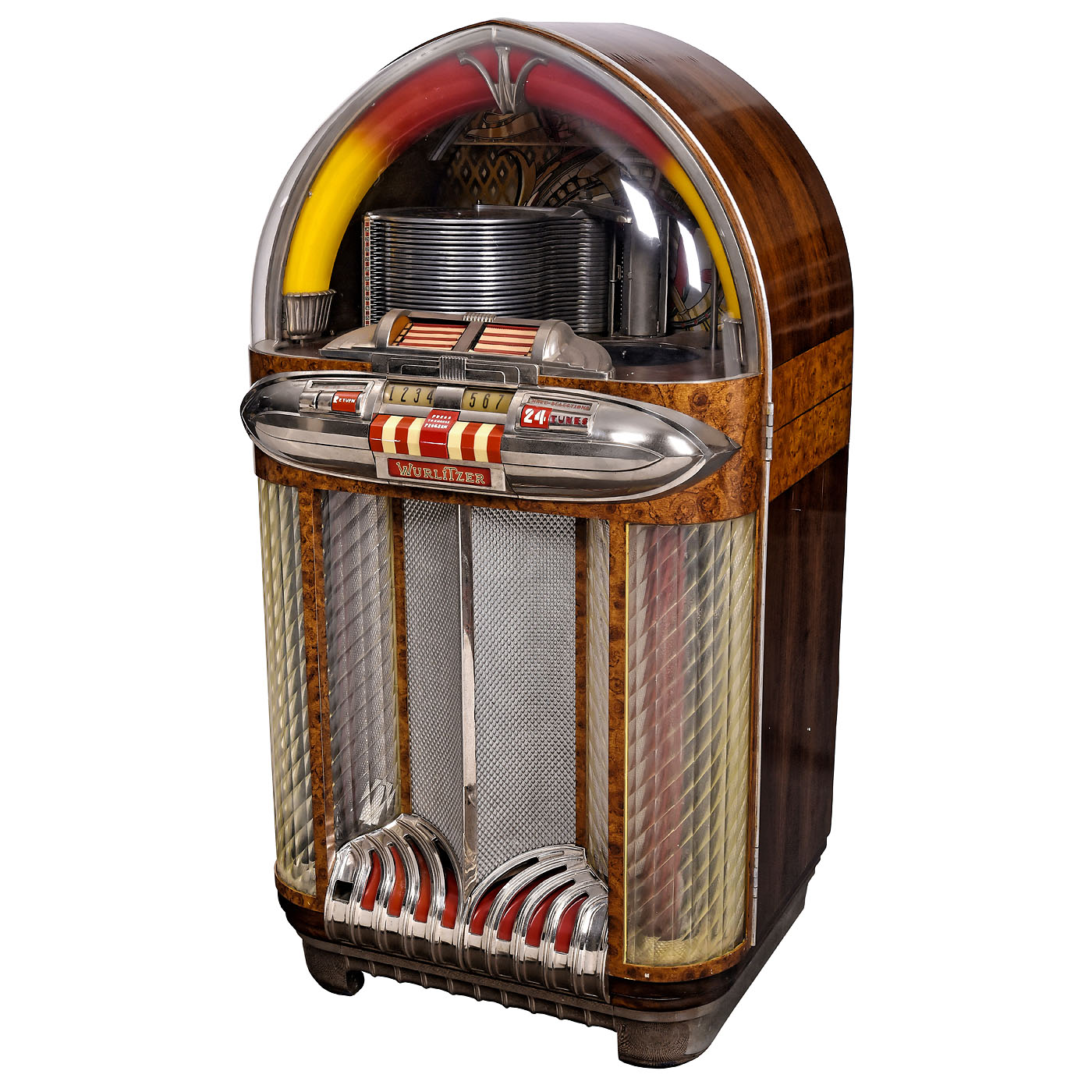 Rudolf Wurlitzer Co., North Tonawanda, New York. With 24 selections, for 78 rpm shellac discs, coin-activated motor, domed walnut case with flared chrome base, grille and illuminated perspex columns, 29 ½ x 26 1/3 x 61 4/5 in., 230 V, 500 W, restored, mechanism in need of minor repair. - Note: The visible record-changer in combination with the illumination makes this one of the most desirable of the classic jukebox designs. - Literature: 1) Ladwig, "Jukebox", 1993, p. 30. - 2) Krivine, "Juke Box Saturday Night", 1977, p. 100. - 3) Lynch/Henkin, "Jukeboxes", 1981, p. 82. - 4) Lynch, "American Jukebox", 1990, p. 54. - 5) Boelens, "The Jukebox", 1988, p. 14.