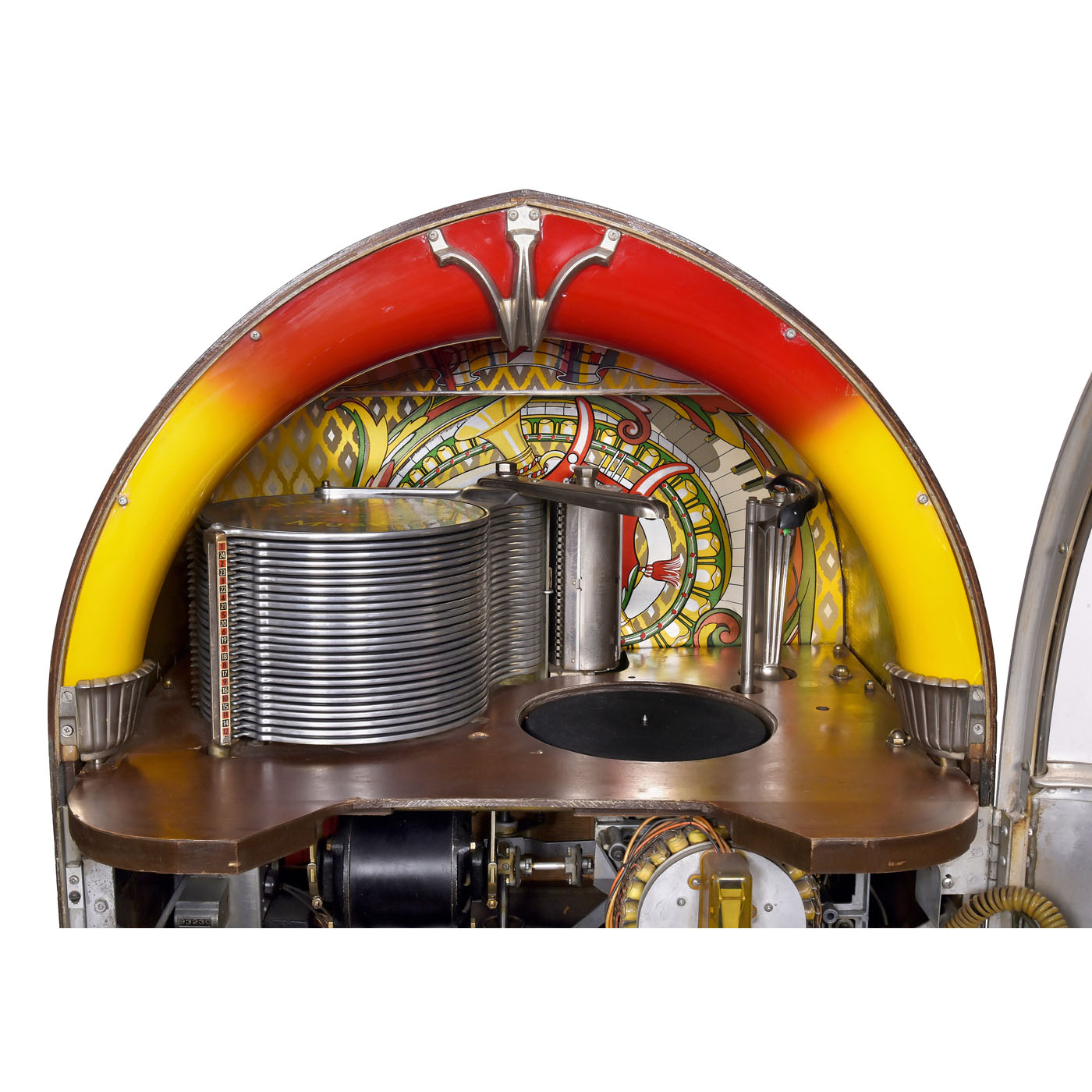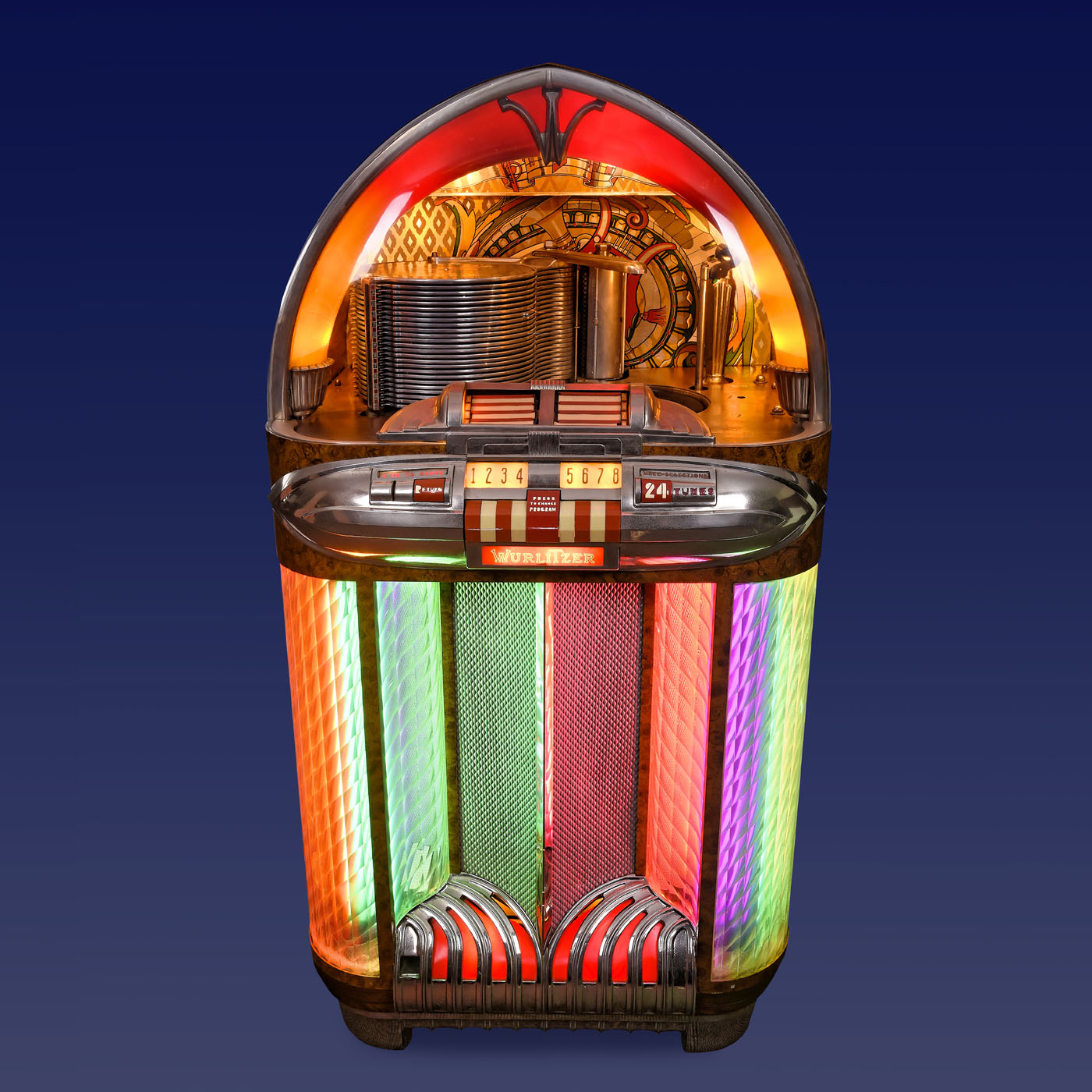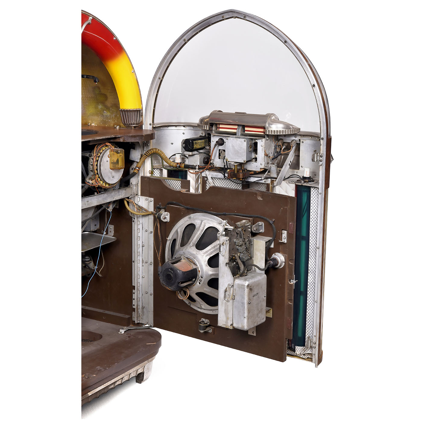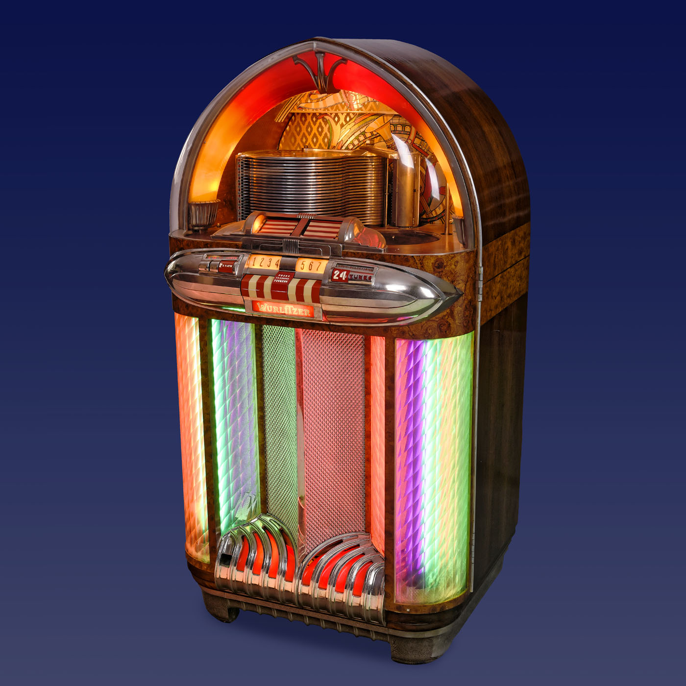 Rudolf Wurlitzer Co., North Tonawanda, New York. With 24 selections, for 78 rpm shellac discs, coin-activated motor, domed walnut case with flared chrome base, grille and illuminated perspex columns, 29 ½ x 26 1/3 x 61 4/5 in., 230 V, 500 W, restored, mechanism in need of minor repair. - Note: The visible record-changer in combination with the illumination makes this one of the most desirable of the classic jukebox designs. - Literature: 1) Ladwig, "Jukebox", 1993, p. 30. - 2) Krivine, "Juke Box Saturday Night", 1977, p. 100. - 3) Lynch/Henkin, "Jukeboxes", 1981, p. 82. - 4) Lynch, "American Jukebox", 1990, p. 54. - 5) Boelens, "The Jukebox", 1988, p. 14.