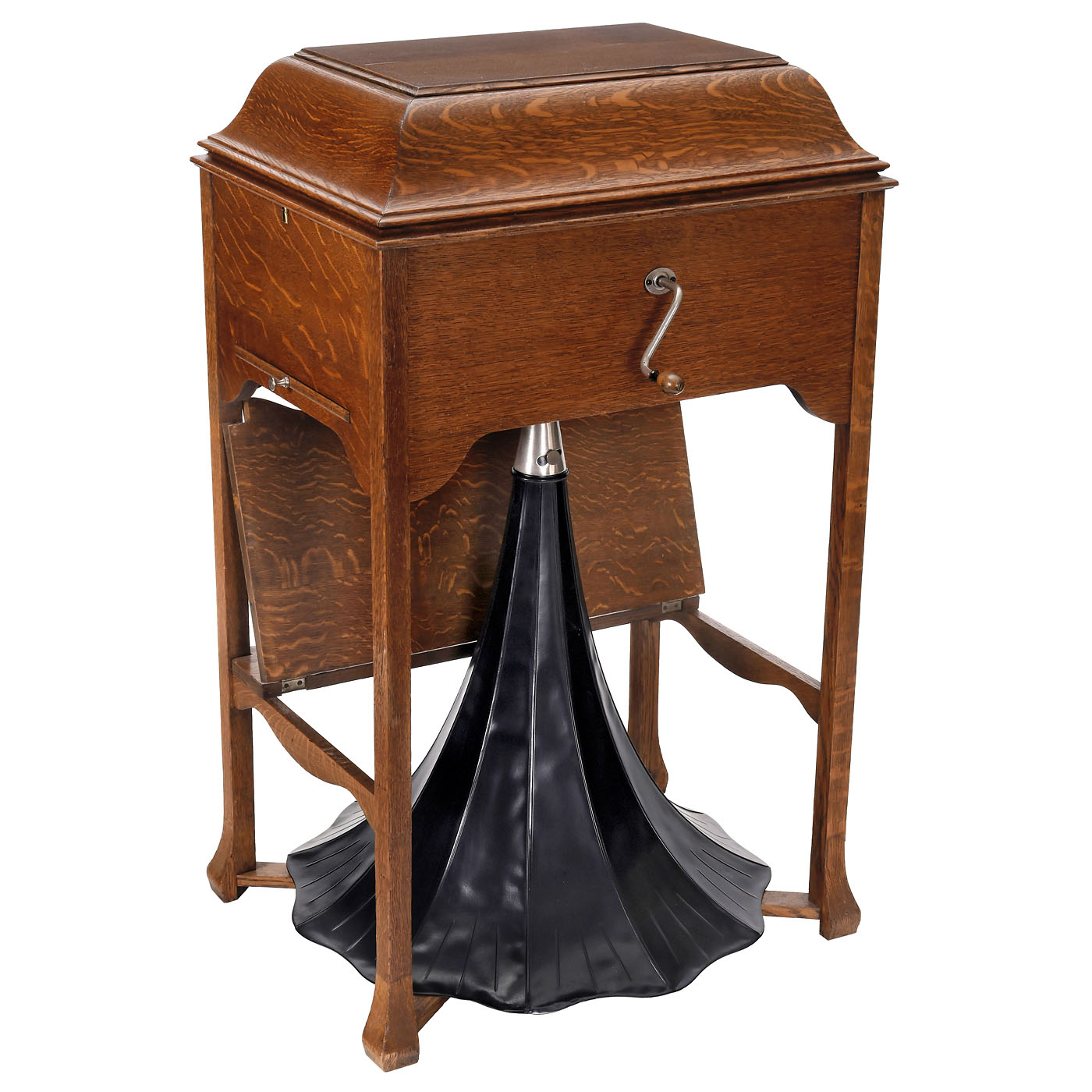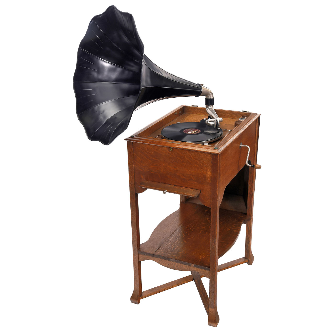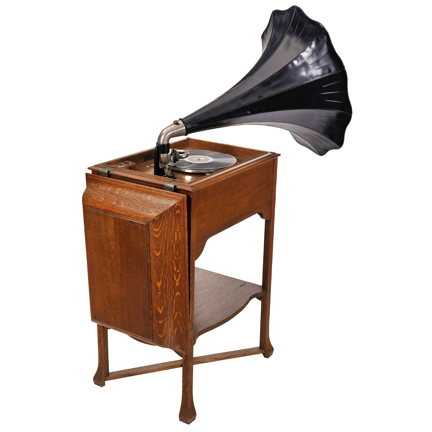 His Master's Voice, London. Cabinet gramophone with external horn, for schools and other public institutions, oak cabinet, removable lid that can be hooked onto the back, pull-out tray for storing records or teaching materials, stand to hold the horn, 12-inch turntable, HMV Exhibition soundbox, large metal horn, Ø 23 3/5 in., overall dimensions without horn 25 2/5 x 18 ½ x 42 ½ in., good working condition.