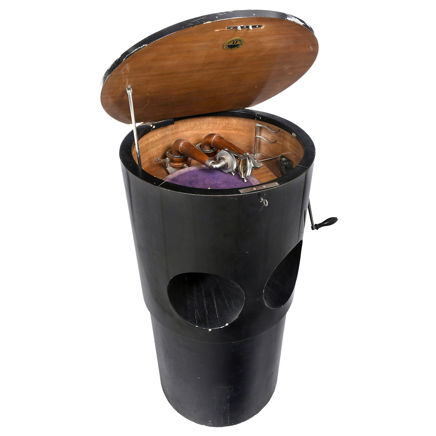 Invented by Heinrich J. Küchenmeister, manufactured by Deutsche Ultraphon Gesellschaft, No. 7418, double-horn gramophone with the two horns set at 90 degrees to each other, 2 soundboxes, the second playing 1/100 of a second behind the first one, spring motor, automatic-stop function, circular wood case, Ø 19 5/8 x 42 ¾ in., working condition. - Note: The gramophone creates a "spatial" sound effect by playing on two pick-ups simultaneously. Size Ø 19 5/8 x 42 ¾ in. - A gramophone which set new standards both in technology and in design.