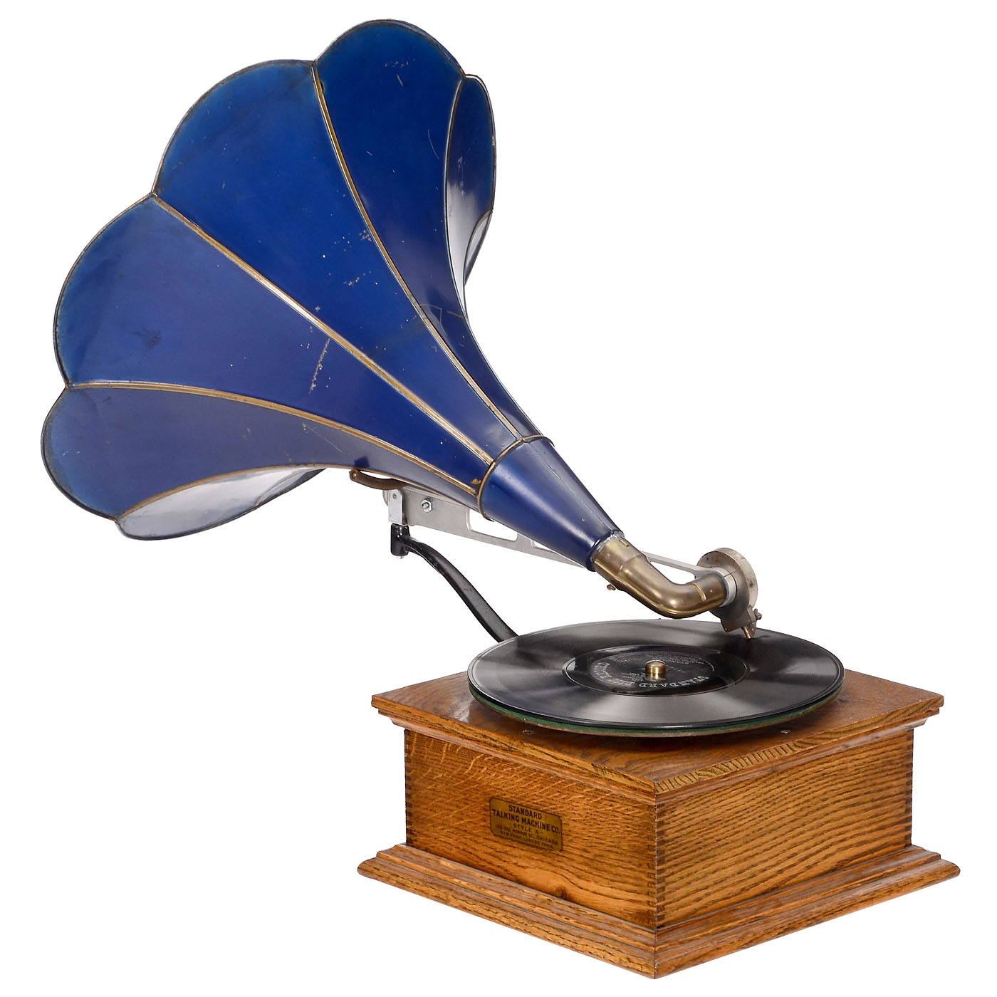 Chicago/New York, with turntable for 78-rpm discs with large-diameter hole, traveling arm, mica reproducer, oak case with original transfer, flower horn with original finish, good working condition, horn 17 in. diameter, with 3 discs.