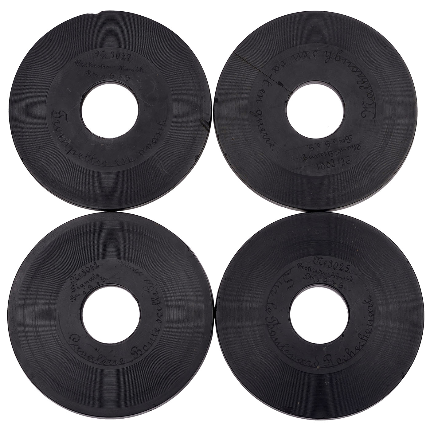 For Ø 3 1/6 in. chocolate discs, with Junghans spring motor, tin case with original green lithographed finish and gilt highlights, turntable doubles as disc-storage compartment for 6 discs, in good condition (tone arm refixed), glass needle, with 4 original carbine discs (one broken). - Working well. Very rare!