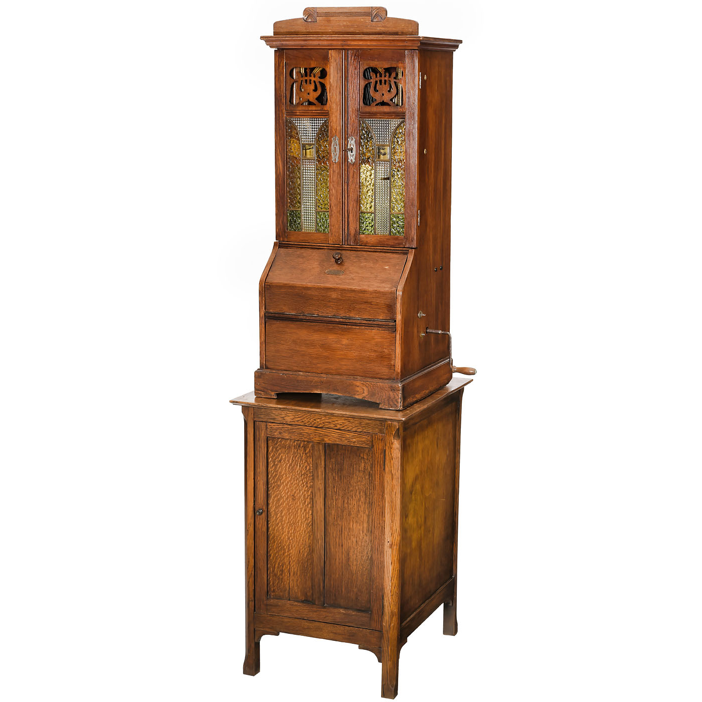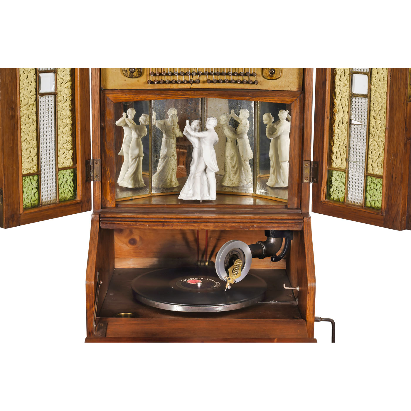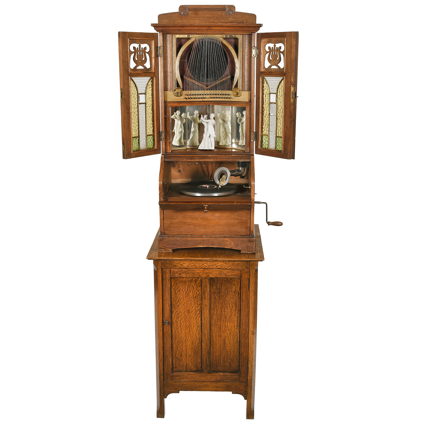 Krebs & Klenk, Hanau, Germany. Oak case with stained-glass doors (glass with minor damage), porcelain dancing couple gear-driven by gramophone motor, harp-like "Klingsor" soundboard, with base cabinet, overall height 67 in. Very good working condition, with one record.