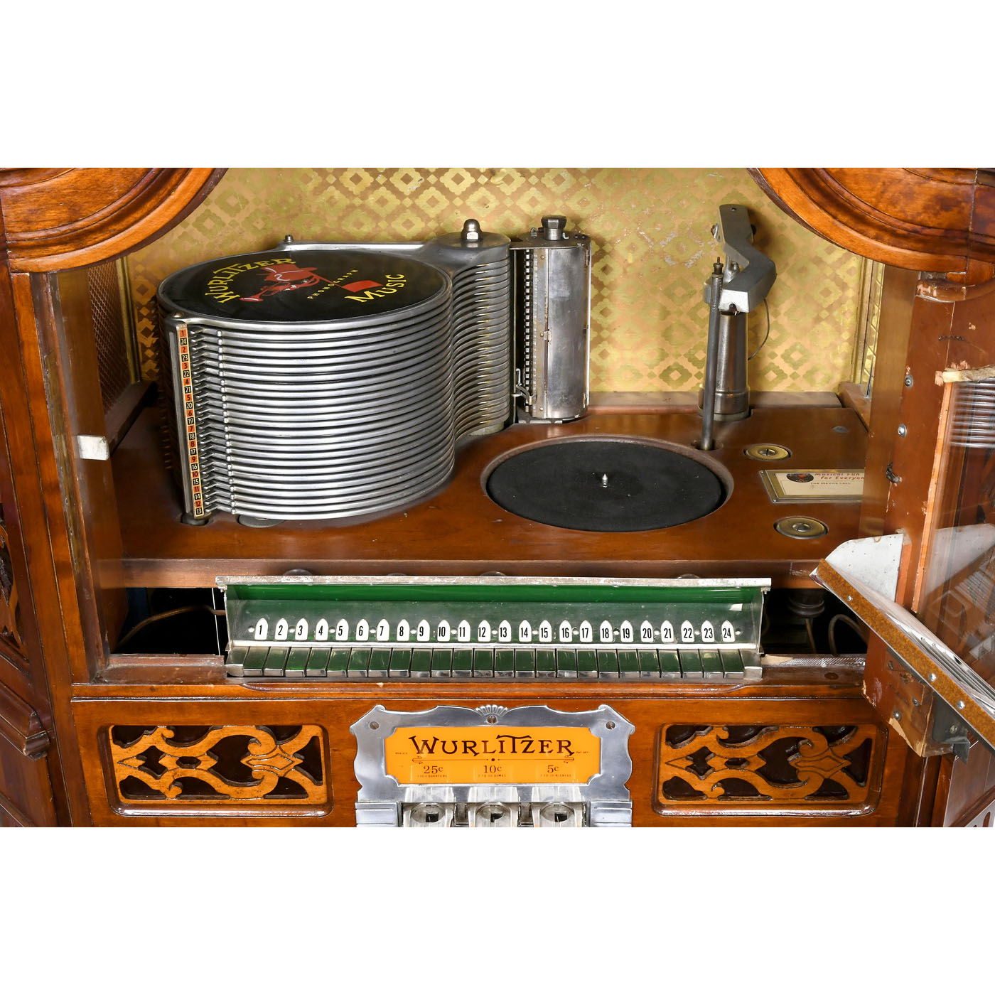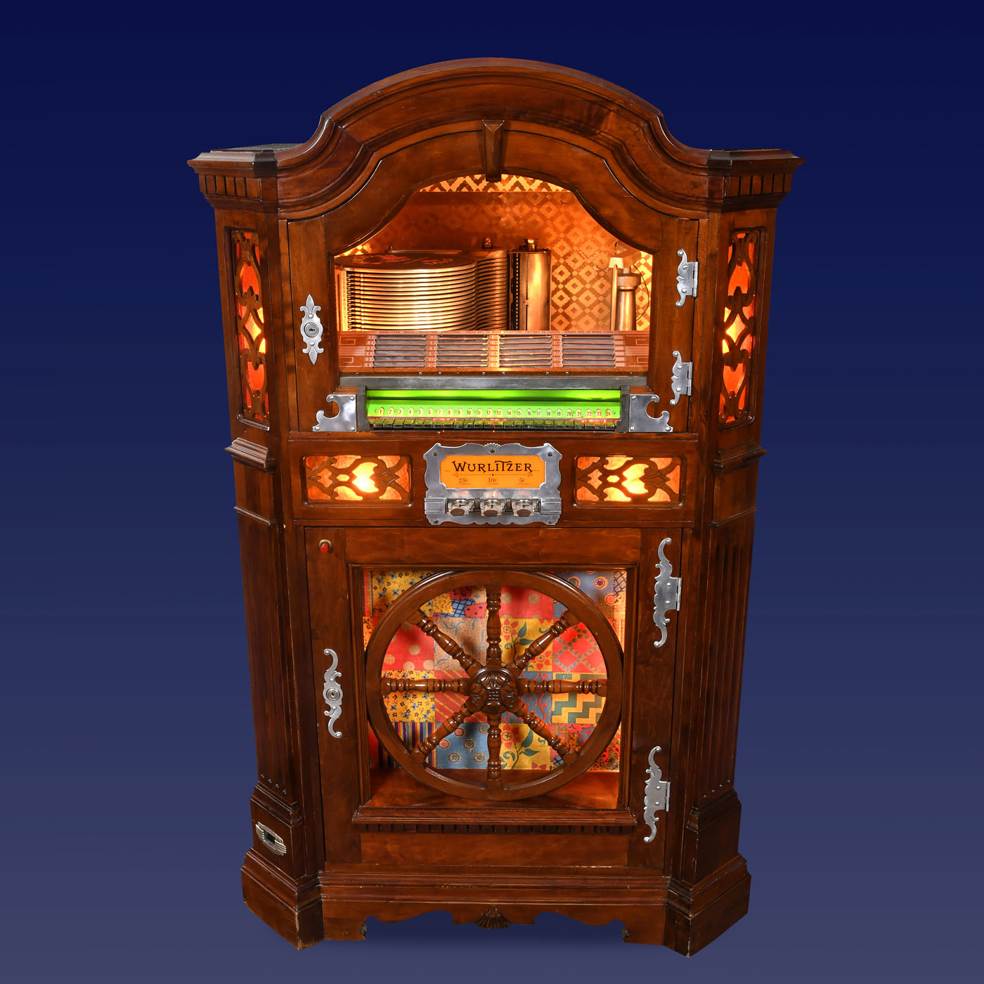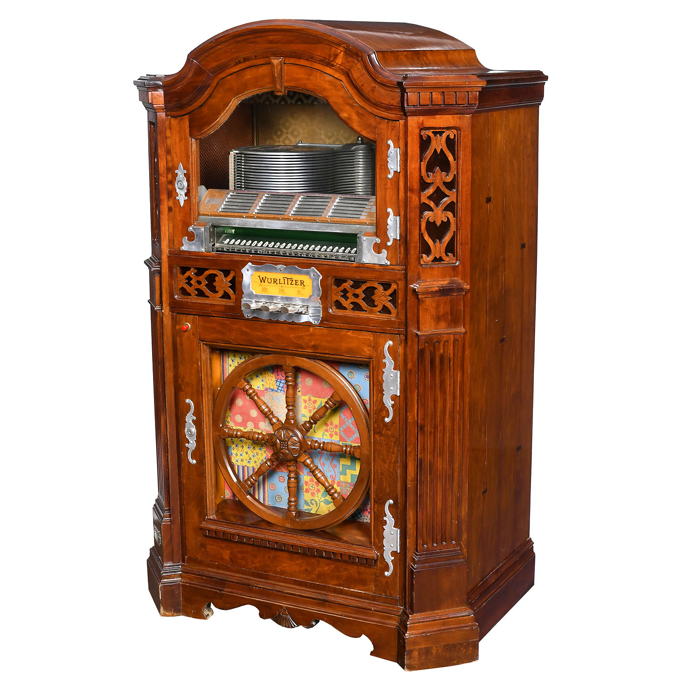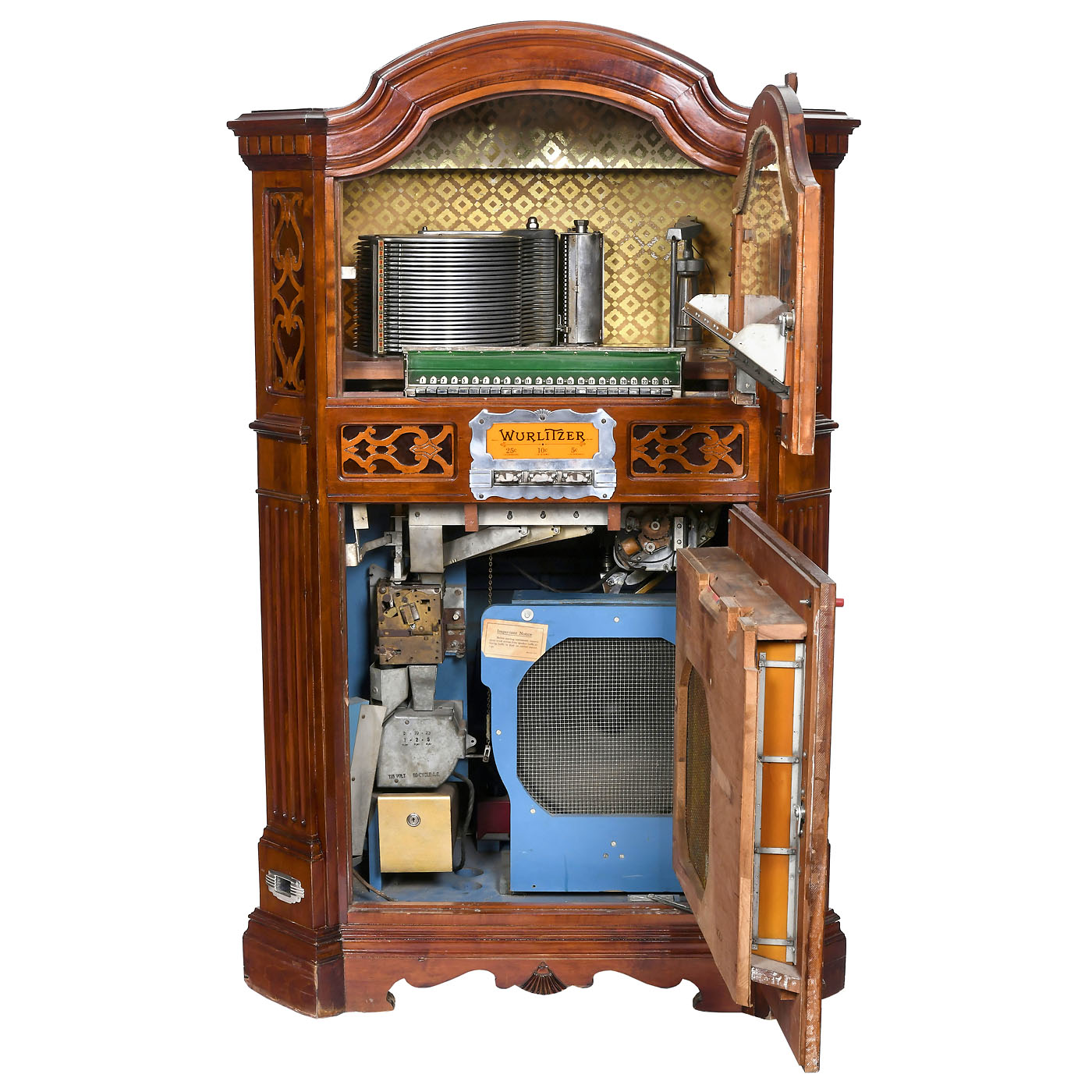 Rudolf Wurlitzer Co., North Tonawanda, New York, Paul Fuller design, with 24 selections, for 78-rpm shellac discs, size 61 2/5 x 37 4/5 x 24 1/2 in., 220 V, restored, mechanism needs minor repair. - Note: Only 2,800 of these classic jukeboxes were manufactured.
