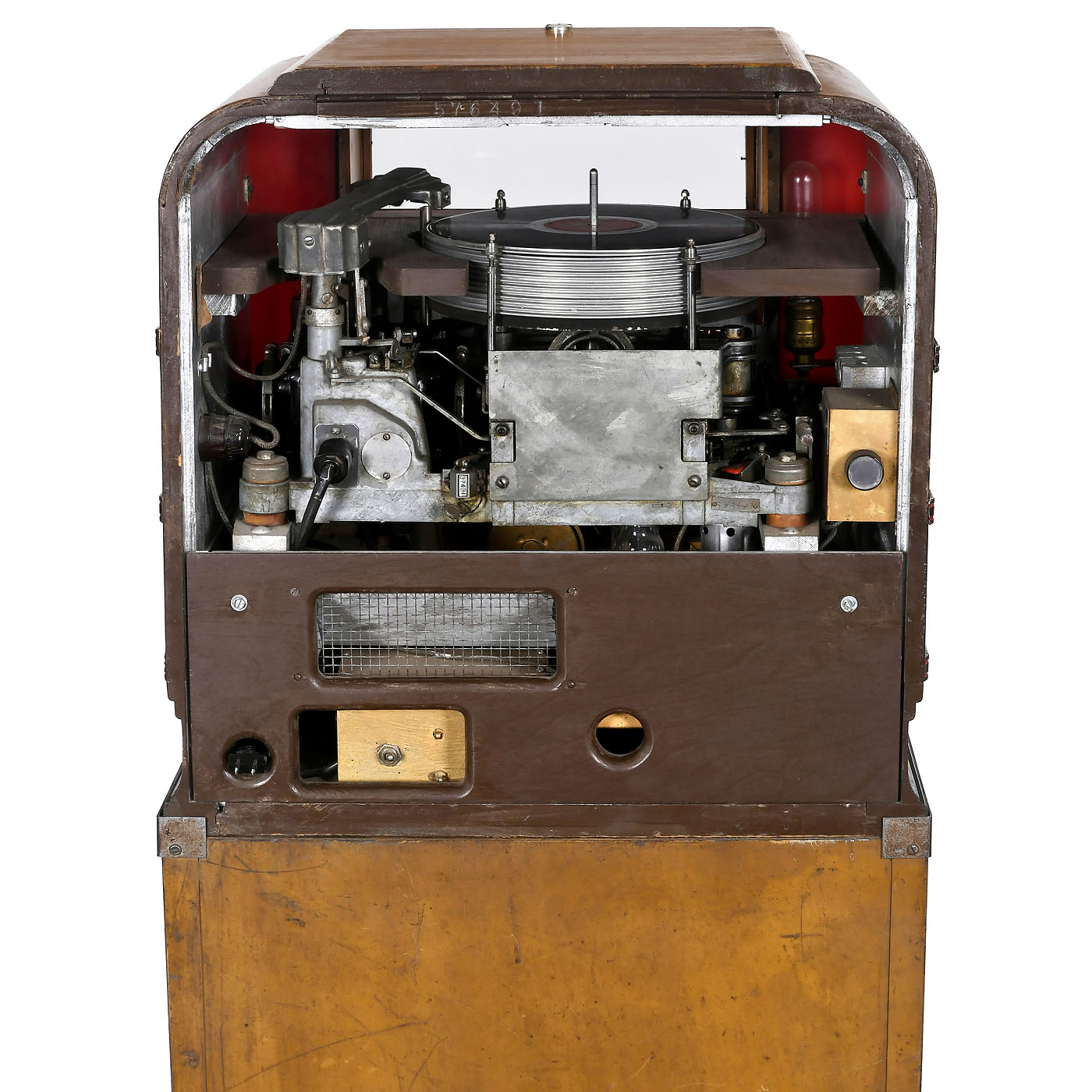 Chicago. 110 volts AC, 60 hertzs, for 78-rpm shellac records, 12 selections, playing one side only, coin-mechanism present, good original condition, lighting works, mechanism complete, needs repair, on accompanying base, dimensions without base 22 x 21 x 18 in. - Note: Due to the light weight, the ideal music box for small rooms or the bar top.