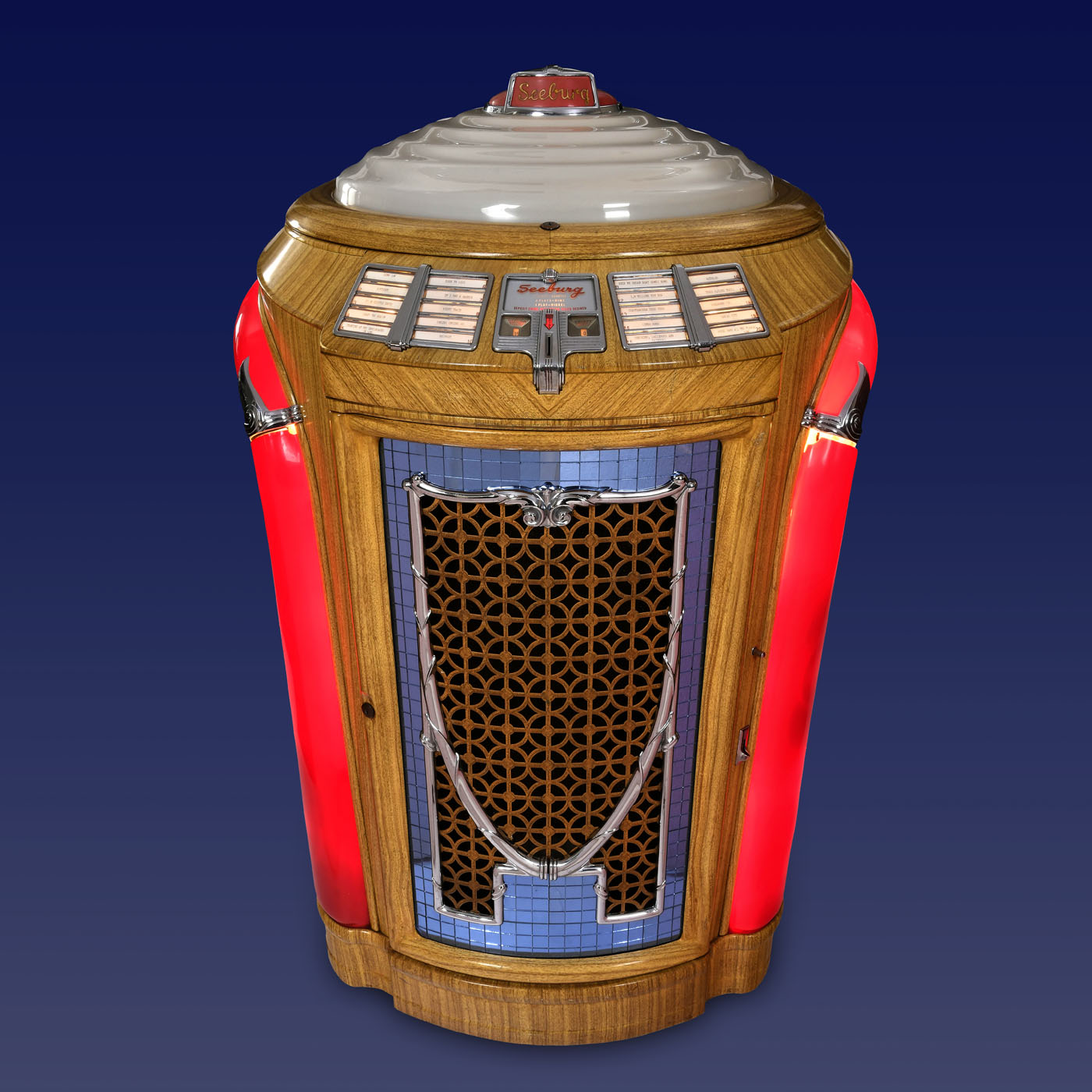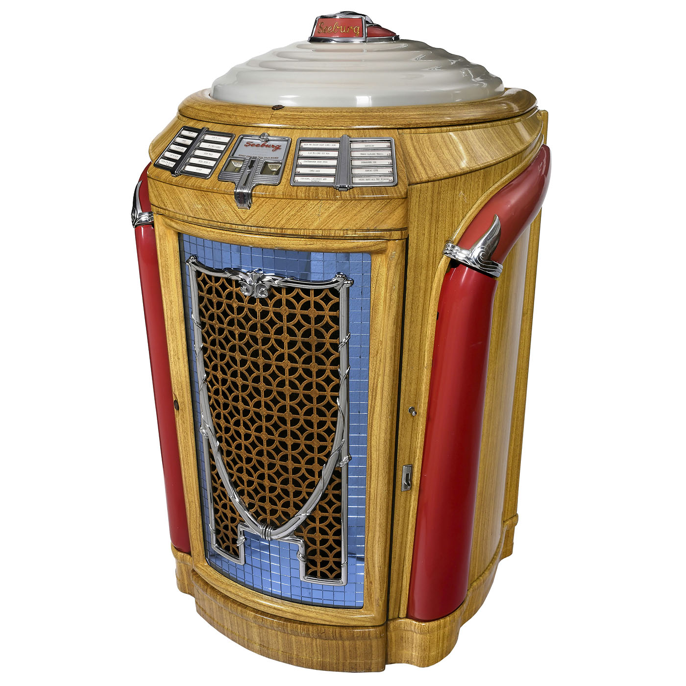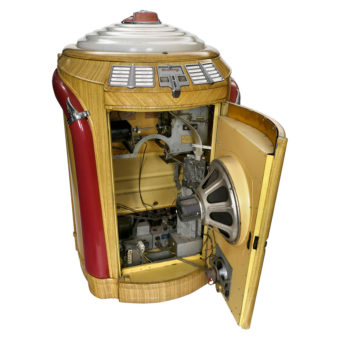 J.P. Seeburg, Chicago. For 20 78-rpm records, 20 selections, 220 volts, aluminum cabinet with faux wood finish, size 36 x 26 x 57 in., good optical condition, in need of minor repairs.