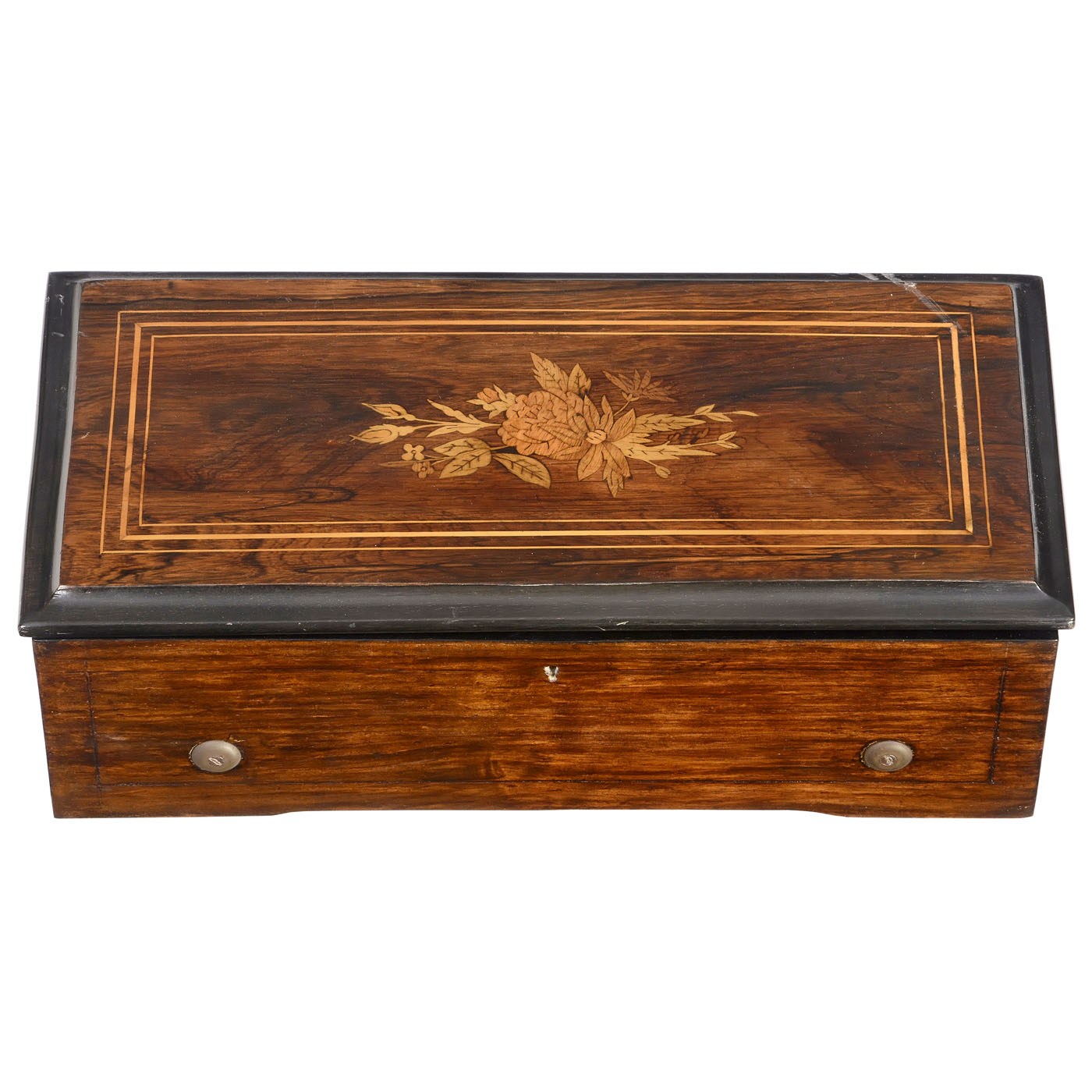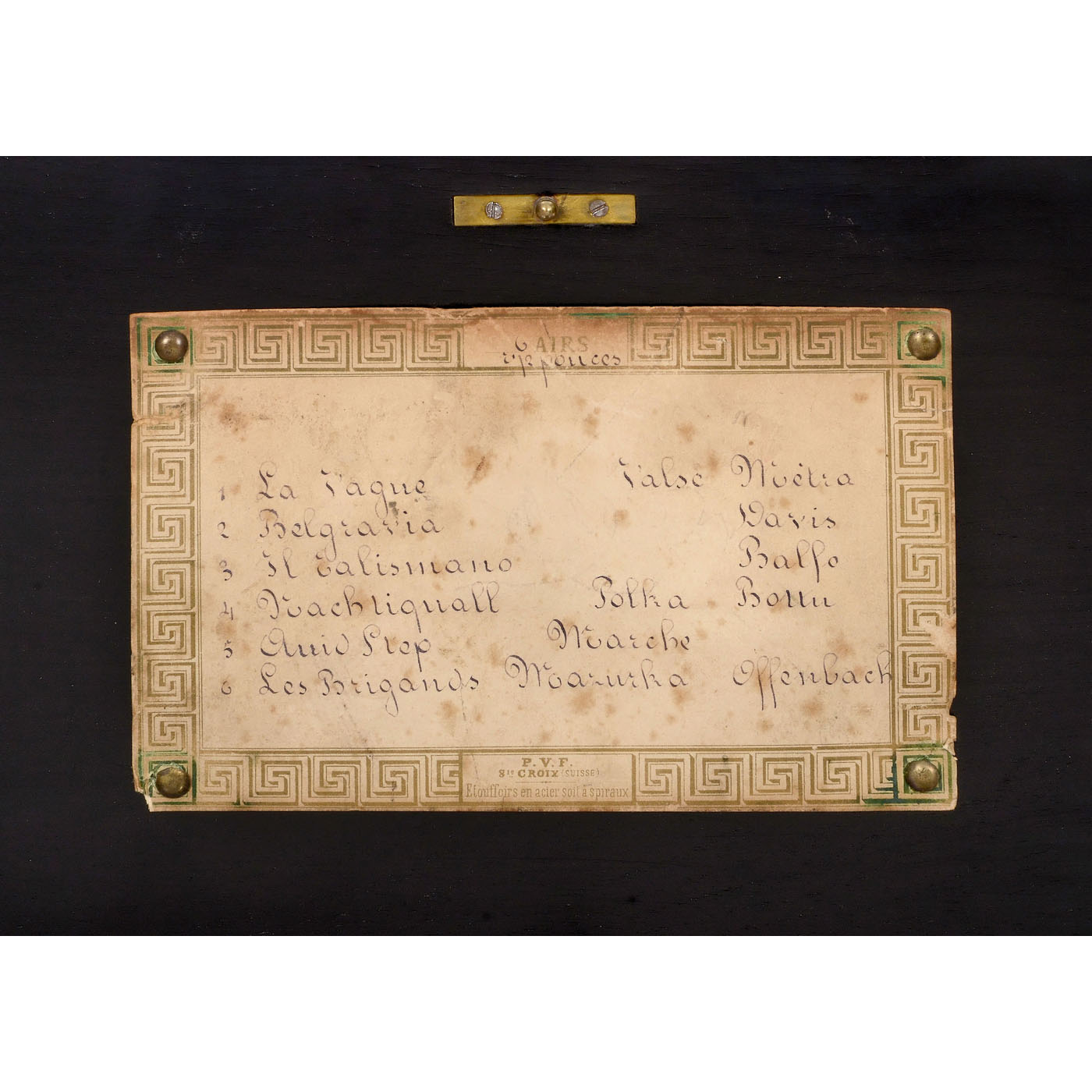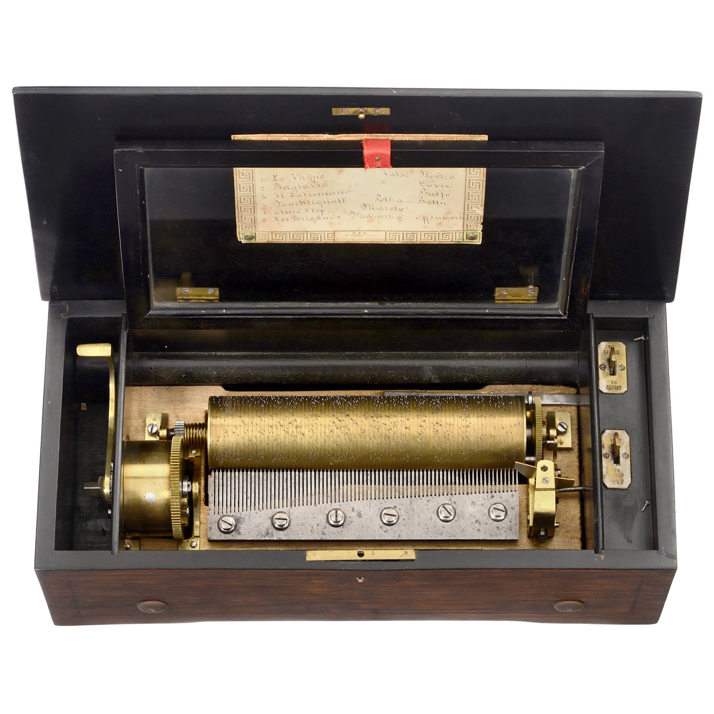Playing six dance airs, including "Belgravia" by Davis, with 77 teeth in steel comb (complete), flat-topped winding lever, tune-sheet and grained case with veneered and inlaid lid, wd. 16 ¼ in. (41 cm), cylinder 8 in. (20.5 cm), unrestored playing condition.