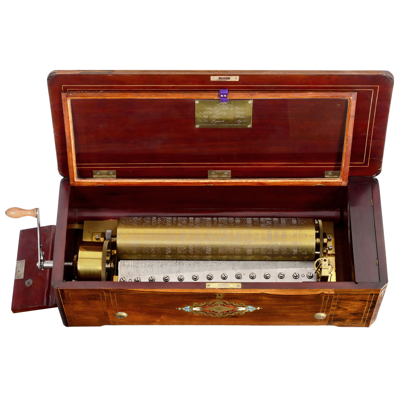 No. 31021, playing four overtures (Gamme no. 1396), with 232 teeth in two combs of 48 and 184 (complete, extreme treble tooth removed during manufacture), massive spring with wood-handled ratchet key stamped "28 IPIG", brass bedplate stamped "Nicole Freres a Geneve", the long comb stamped "Nicole Freres", compensated governor, instant-stop control, polished brass tune-plaque engraved "Fabqué. par Nicole Frères pour T. Cox, Savory & Co., 54. Cornhill, London", veneered case with red interior, rounded corners, hinged key-compartment, hinged endflap, brass stringing and inlay of brass, imitation tortoiseshell and colored enamels on front and lid, 26 ¾ in. (68 cm), cylinder 16 ¼ x approx. 4 in. diam. (41.5 x 10 cm), movement and case in good restored condition, movement slow-running, governor blades in need of tightening, one front section of rounded beading missing, small sections of brass inlay loose. - Note: The program presents the overtures to "La Gazza Ladra" by Rossini, "Der Freyschütz" by Weber, "Norma" by Bellini and "Les Huguenots" by Meyerbeer. Each overture plays for approx. 2 ¾ minutes.