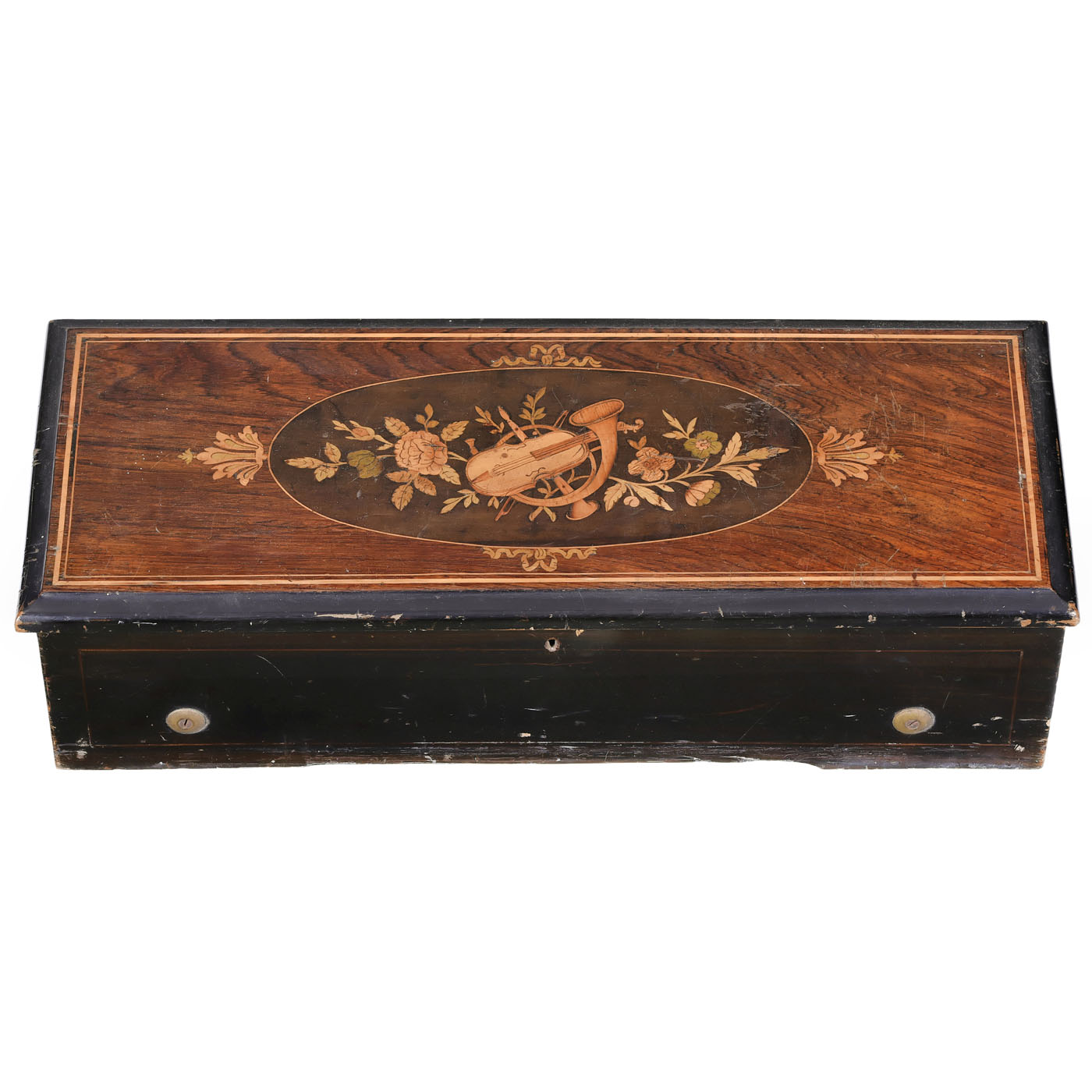 No. 7648, playing ten airs by Verdi, Flotow, Gounod, C. Faust and others, with 77 teeth in comb (complete, two or more neat bass tip repairs), tune-sheet, grained case with veneered and inlaid lid, wd. 22 ½ in. (57 cm), cylinder 13 in. (33 cm), governor missing one fan, stop / start mechanism in need of adjustment, glass lid loose, playing condition but movement would benefit from an overhaul.