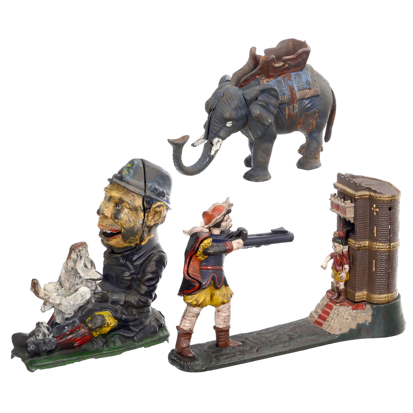 1) Pull Tail Elephant, USA, grey, length 8 ¼ in. - 2) Mason Bank, USA, base length 7 ¼ in. - 3) Jonah and the Whale, USA, base length 9 ½ in. - 4) Wilhelm Tell, USA, base length 10 3/8 in. - 5) Paddy and the Pig, USA, base length 6 7/8 in. - 6) Professor Pug Frogs Great Bicycle Feat, USA, base length 9 ¾ in. - And: 7) Jolly Boy Bank, GB, high hat, height 8 ¼ in. - In addition: 2 bulldogs, still money banks, cast iron, heights 4 ½ and 10 in.