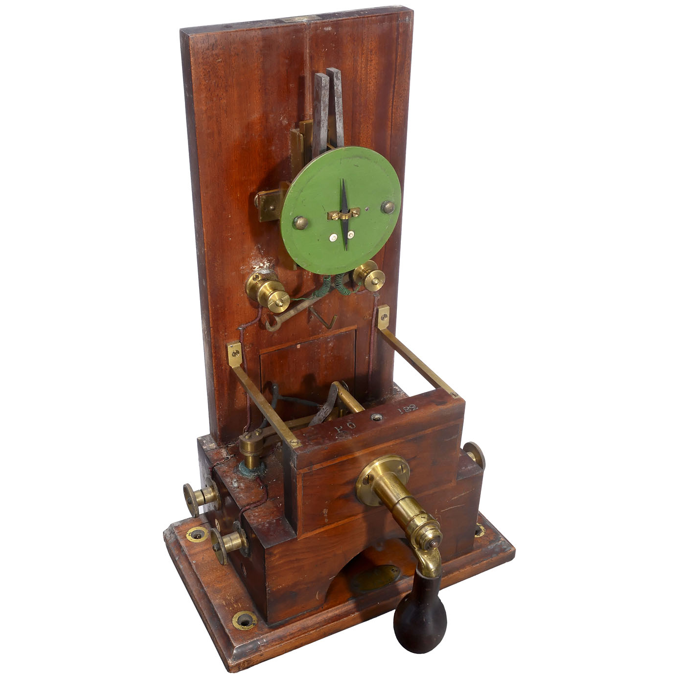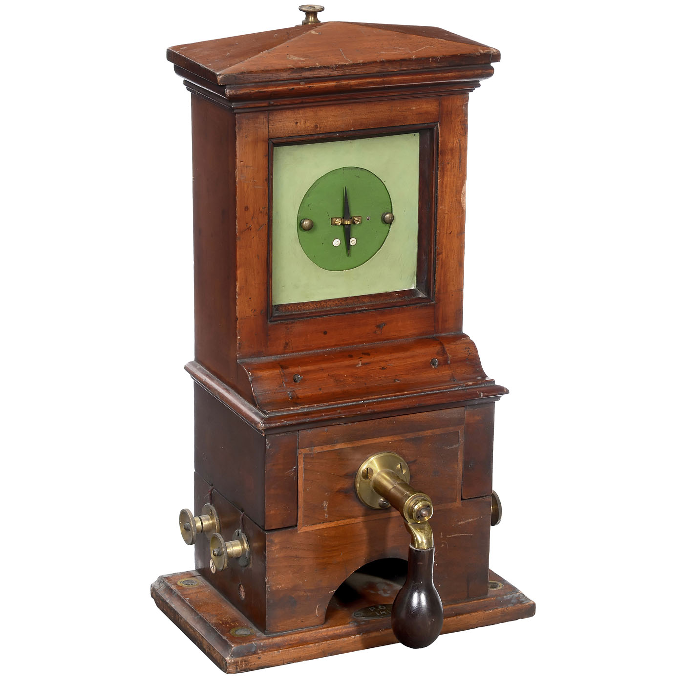 Patented by Cooke and Wheatstone in 1845, solid mahogany case, stamped "GPO 182", with large pump handle to control the needle deflection to the right or left, brass and steel internal mechanism, height 19 in. - Note: The needle telegraph was used by the British railways to transmit messages between stations along the train route. Single-needle telegraphs were used by the railway administration from the middle of the 19th century until the 1930s.