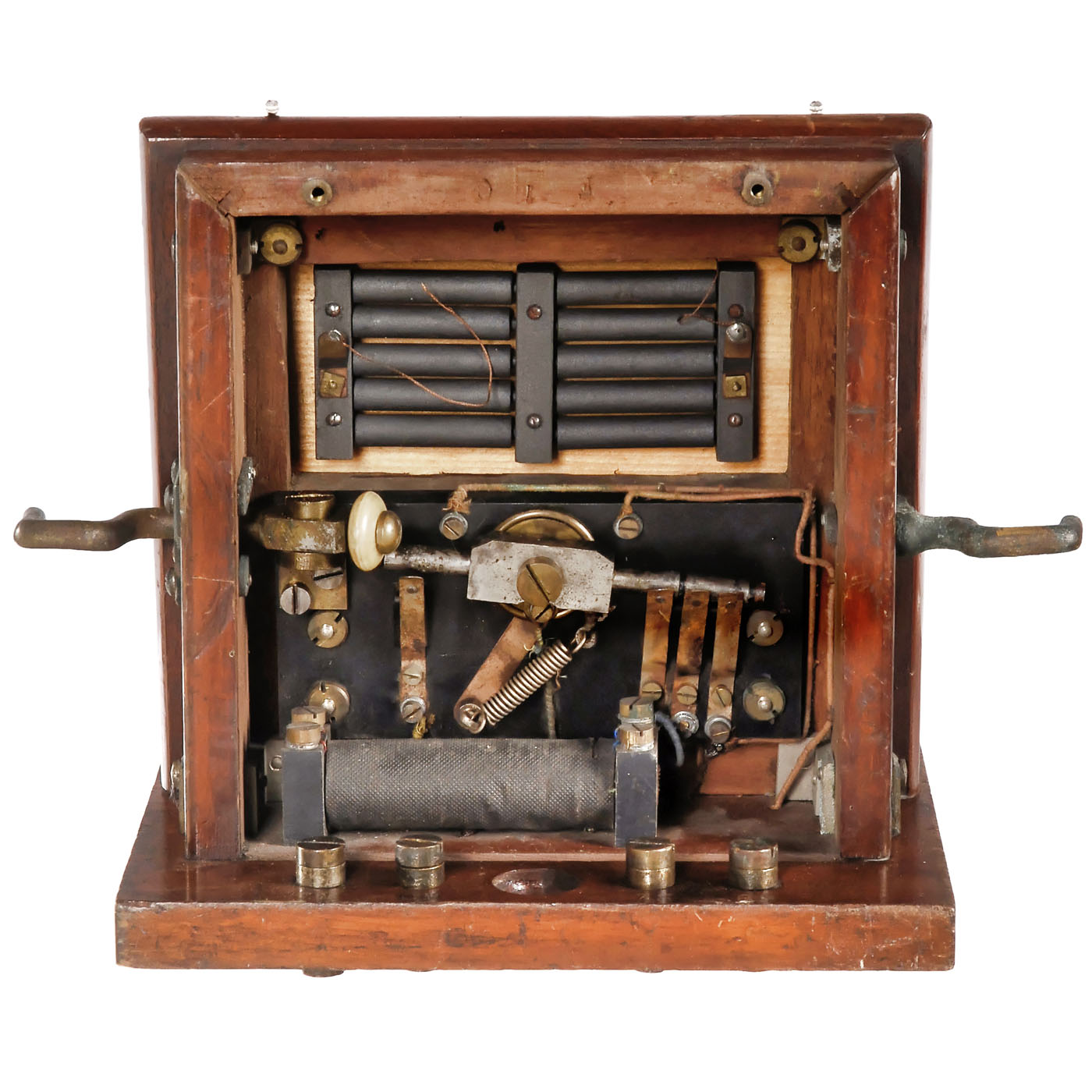 Marked on brass plate: "Societé Industrielle des Téléphones, Système Ader", serial no. 8429, 10-pencil carbon transmitter under thin wood membrane, 2 ring-shaped receivers. - A rare and very early model in telephone history!