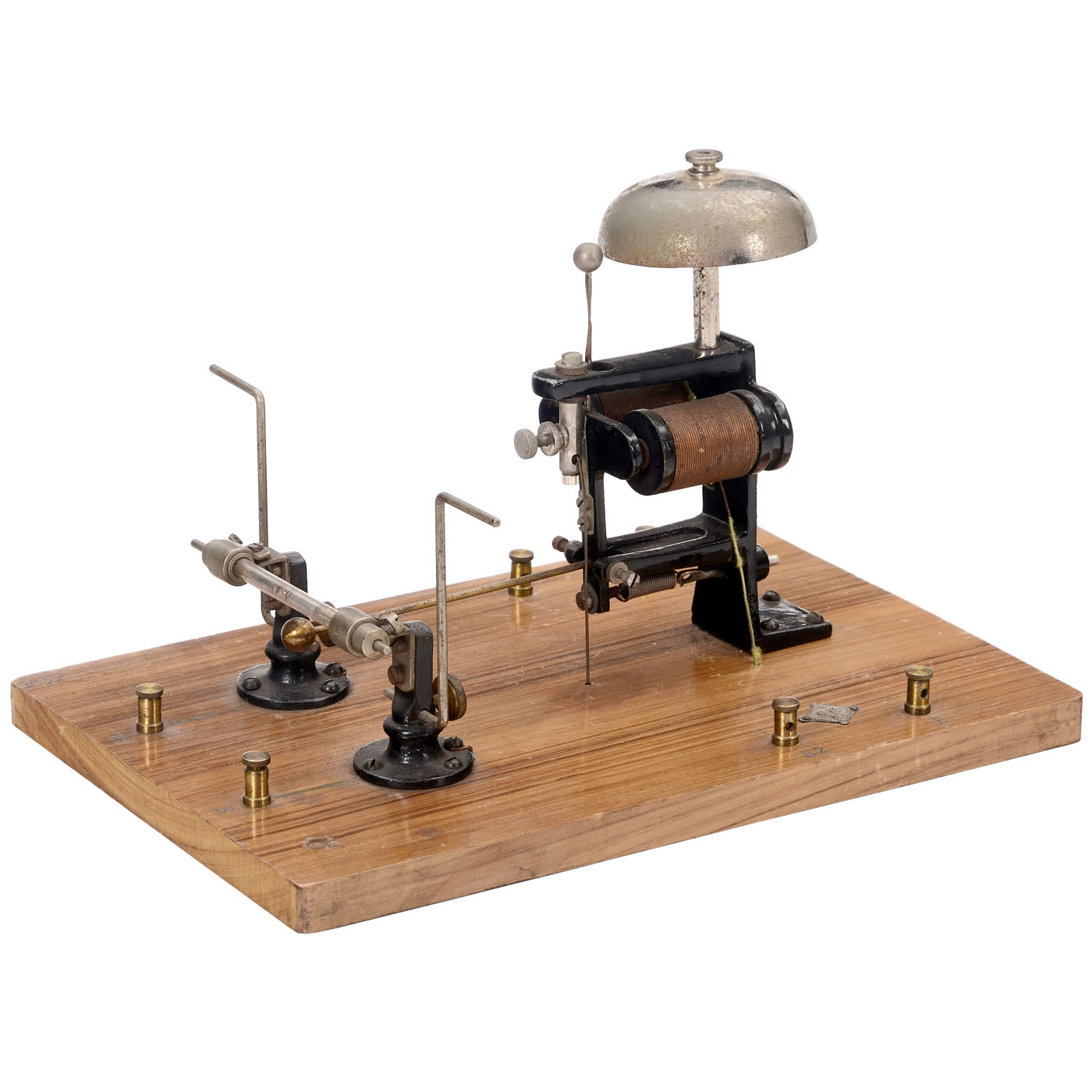 Gebrüder Bing, Nuremberg. Toy telegraph, catalog no. 14074, receiver, with coherer, decoherer (clapper), electromagnet and bell, on polished wood board with diamond-shaped "GBN" plaque, 9 ½ x 6 ¼ in. - Reference: Bing catalog 1909, p. 220. - An interesting toy for demonstrating wireless telegraphy.