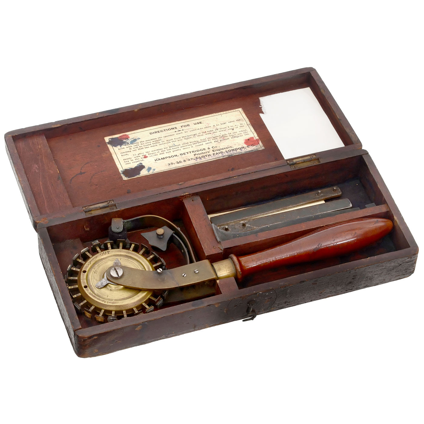 Hampson, Bettridge & Co., London. For account book and manufacturing stationers, designed to print two colors in one operation, variable length of index, in mahogany case.