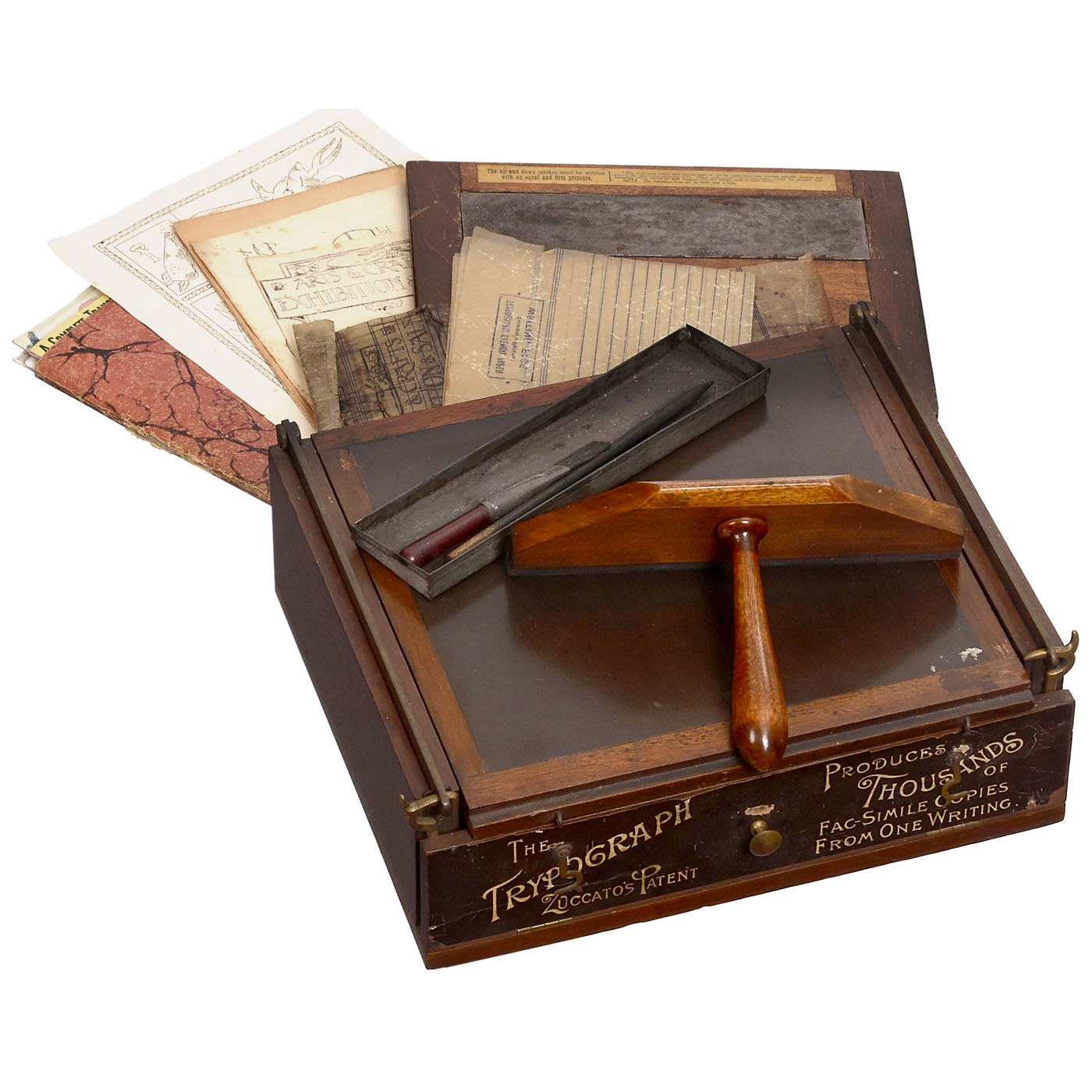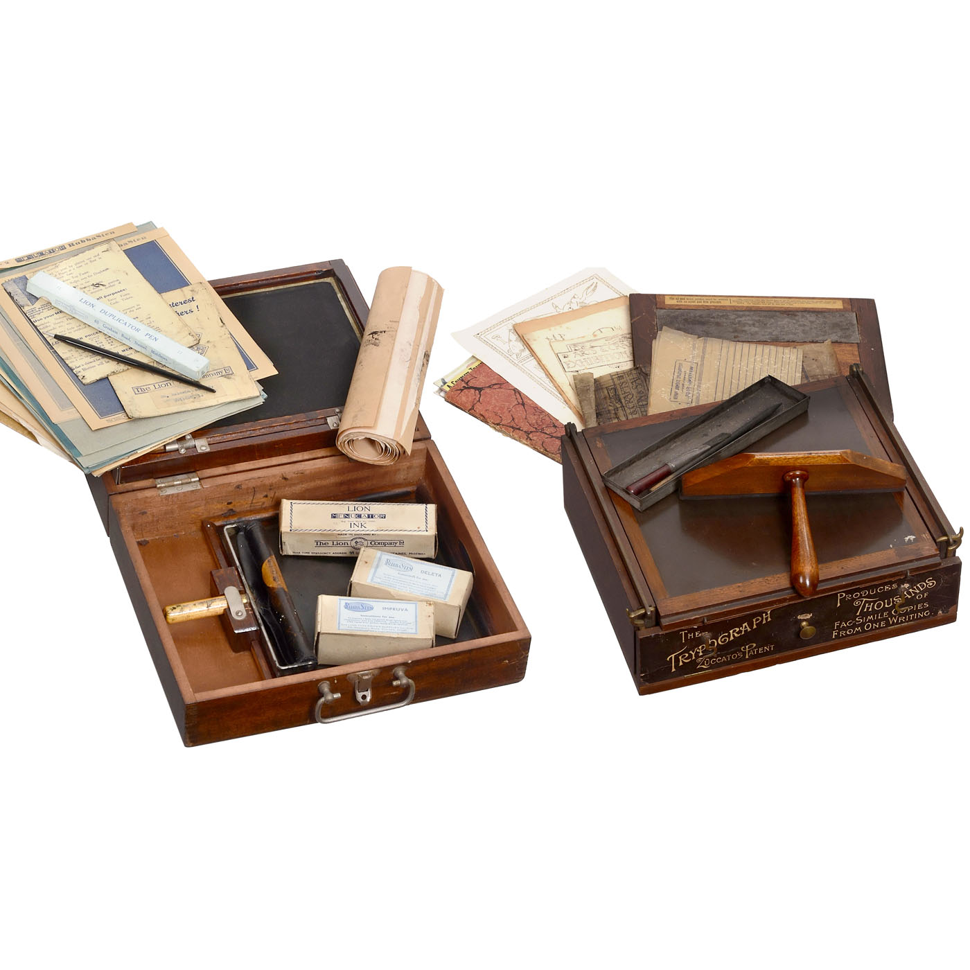 1) "The Lion Menucator", Model No. 2, c. 1930, The Lion Typewriter Supplies Company, London, screen printer with instructions and extensive accessories, in wood case. - And: 2) "The Trypograph", 1877 onwards, Zuccato's patent, by W.B. Perry London, Mimeograph, stencil-copying apparatus on perforated paper, with metal plate with sharp corrugations to pierce the paper, more than 1,000 copies were possible.