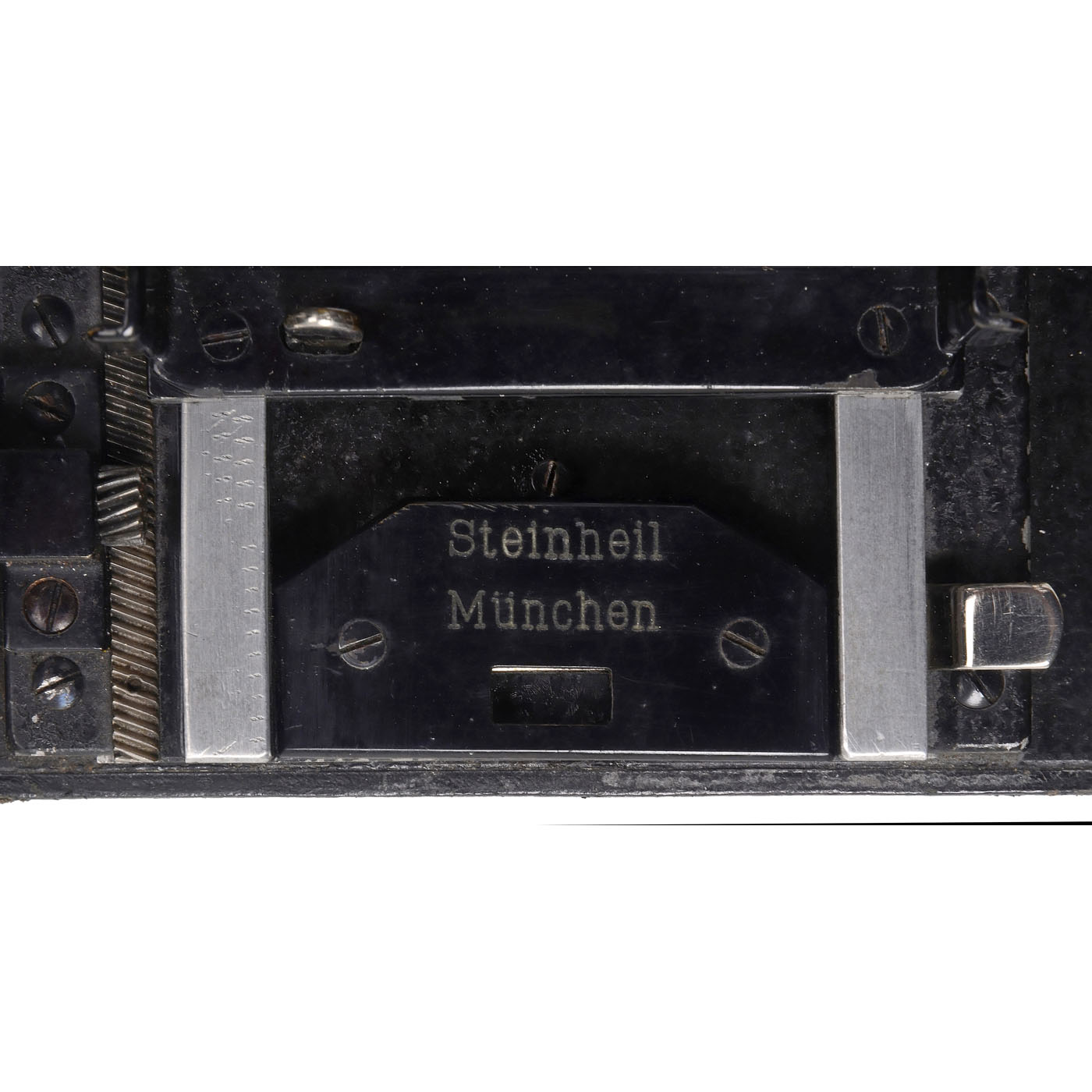 1) Steinheil, Munich. Square plate camera for 6.5 x 9 cm, resembling a Perka, triple-extension, focusing screw with distance scale, with Steinheil Unofocal 4.5/10.5 cm lens no. 114319 and inserted cassette, Compur sluggish at slow speeds, interchangeable plate is movable but not replaceable (unclear whether intentional), rotating back stuck. (3/3-) - 2) Steinheil, Munich. Folding-strut camera for 4.5 x 6 cm, Steinheil Triplet Anastigmat 4.5/7.5 cm, Compound working, swiveling brilliant viewfinder, with inset packing film cassette. (3-/3-) - And: 3) Spitzer, Berlin. Espi folding-strut camera, 6.5 x 9 cm, Meyer Citonar 6.8/90 mm no. 172175 in Derval, working, frame viewfinder with diopter, with focusing screen back. Note: The opening lever on the standard is identical to the Steinheil camera, a possible reference to the manufacturer. (3-/3)