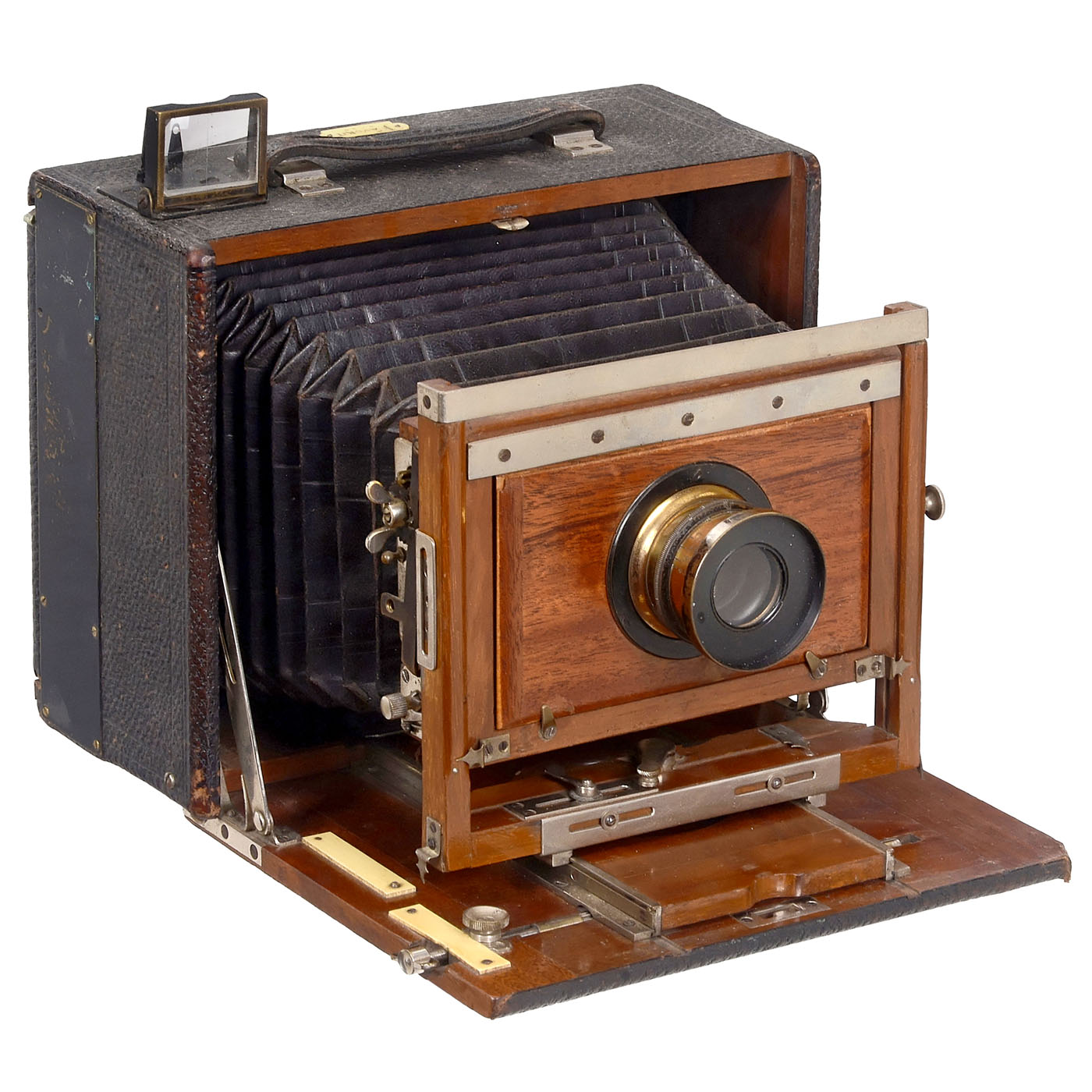 Wünsche, Dresden. 1) "Favorit Gebrauchsmusterschutz" (engl.: utility model protection), 13 x 18 cm, fine wood with brass fittings, double extension, with Voigtländer Collinear Set II 13 x 18 no. 52307, 350 mm lens and focusing screen back and original protective plate for transport, focal plane shutter cloth renewed, working with a fixed-width slit. - And: 2) "Favorit D.R.G.M.", 13 x 18 cm, black leather-covered body, later model, standard with rear stereo shutter, with aplanat lens of approx. 8/20 cm and focusing screen back, one screw on standard missing, working, interchangeable plate replaced. - Both cameras offered for the first time in our auctions, good display pieces for comparison.