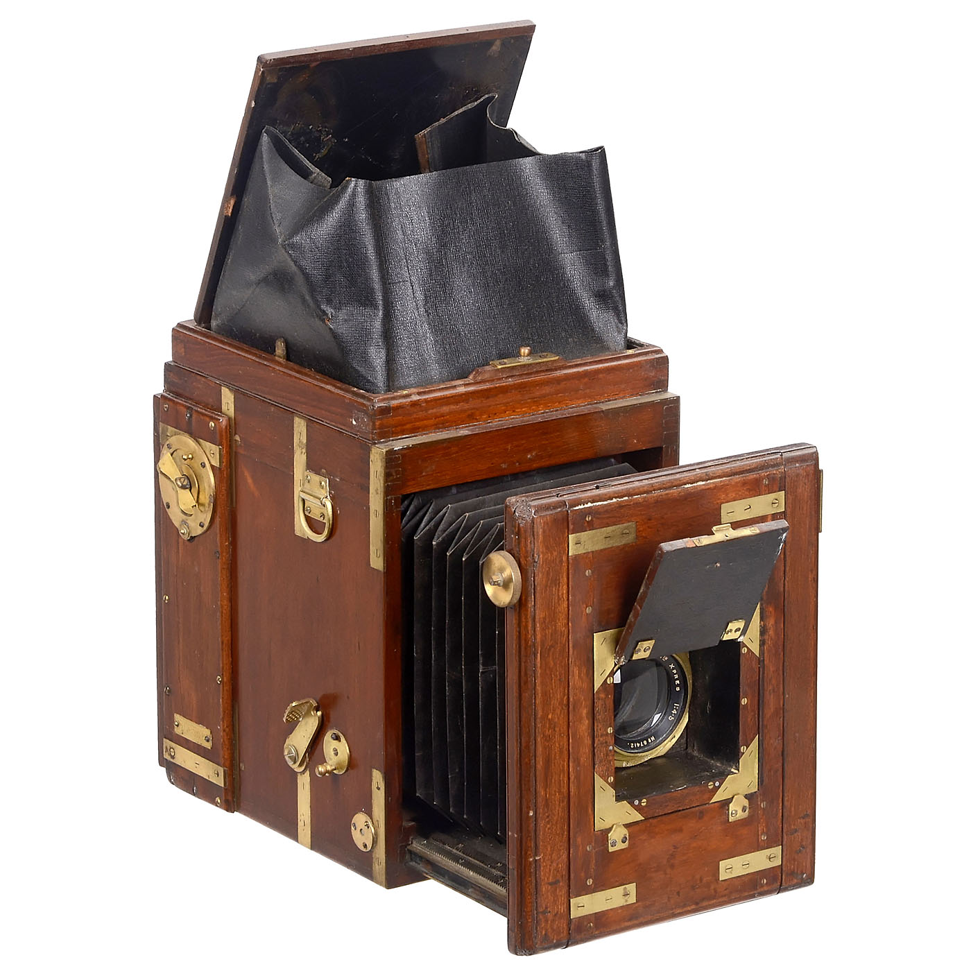 Thornton Pickard, Altrincham, England. 13.5 x 13.5 cm but recording format 12.5 x 18.5 cm, tropical wood with brass fittings, patent no. 6283.12, with a Ross London Xpres 4.5/7 ¼ in. lens and original support for heavy lenses on the left side, focal plane shutter inoperative, lower cloth present, leather covering on viewfinder hood loose, back modified for larger formats, with additional ground-glass back for 12.5 x 18.5 cm. - Very rare and very early version of the "Duplex Ruby Reflex".