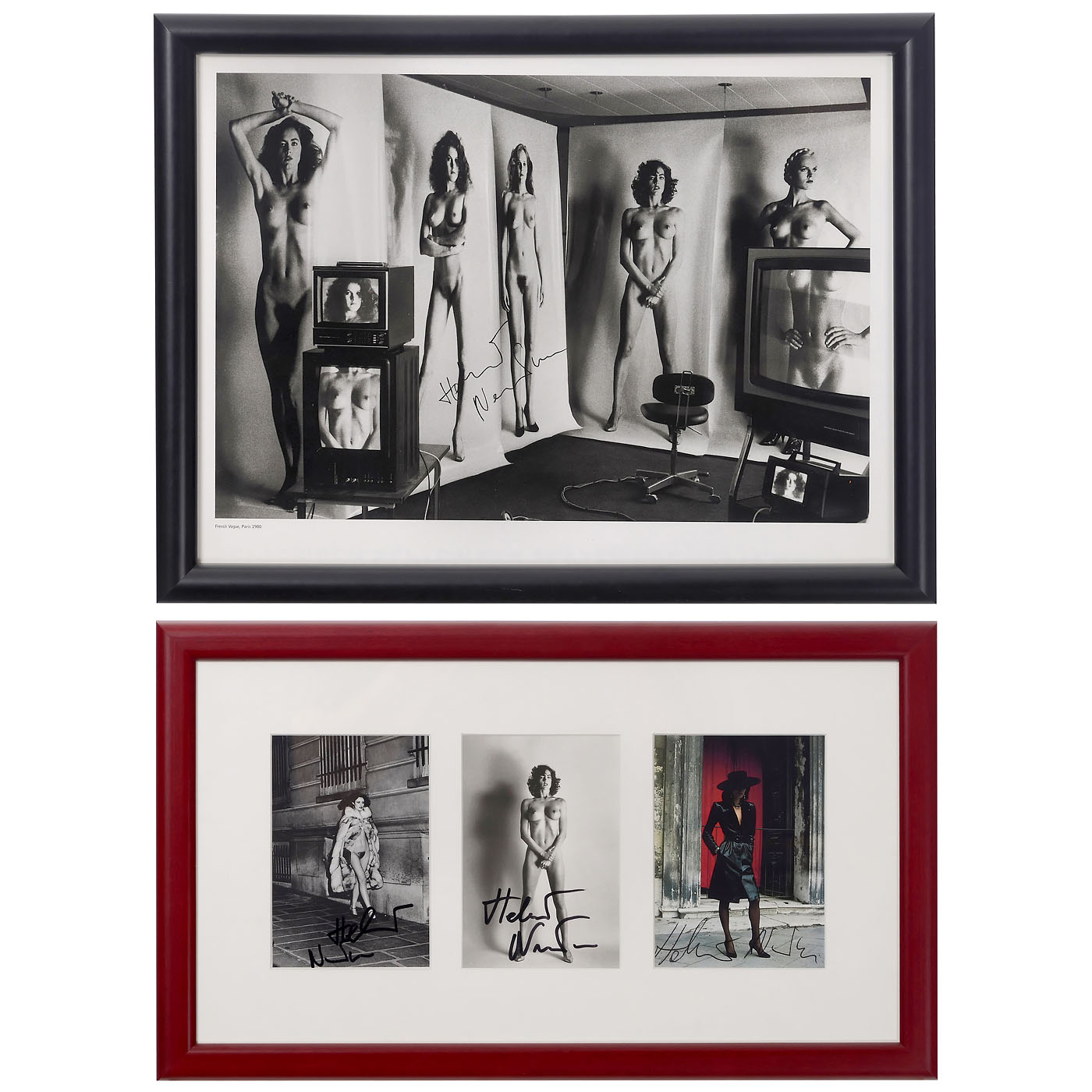 1) 3 exhibition art postcards, "Big Nude III, Henrietta", "Nude in a Fox" and "Saint Laurent rive gauche", with passe-partout, glazed and framed, 17 ¾ x 10 5/8 in. - And: 2) "French Vogue", Paris 1980, glazed and framed, 15 x 11 2/5 in. - All original signatures by the artist, not prints.