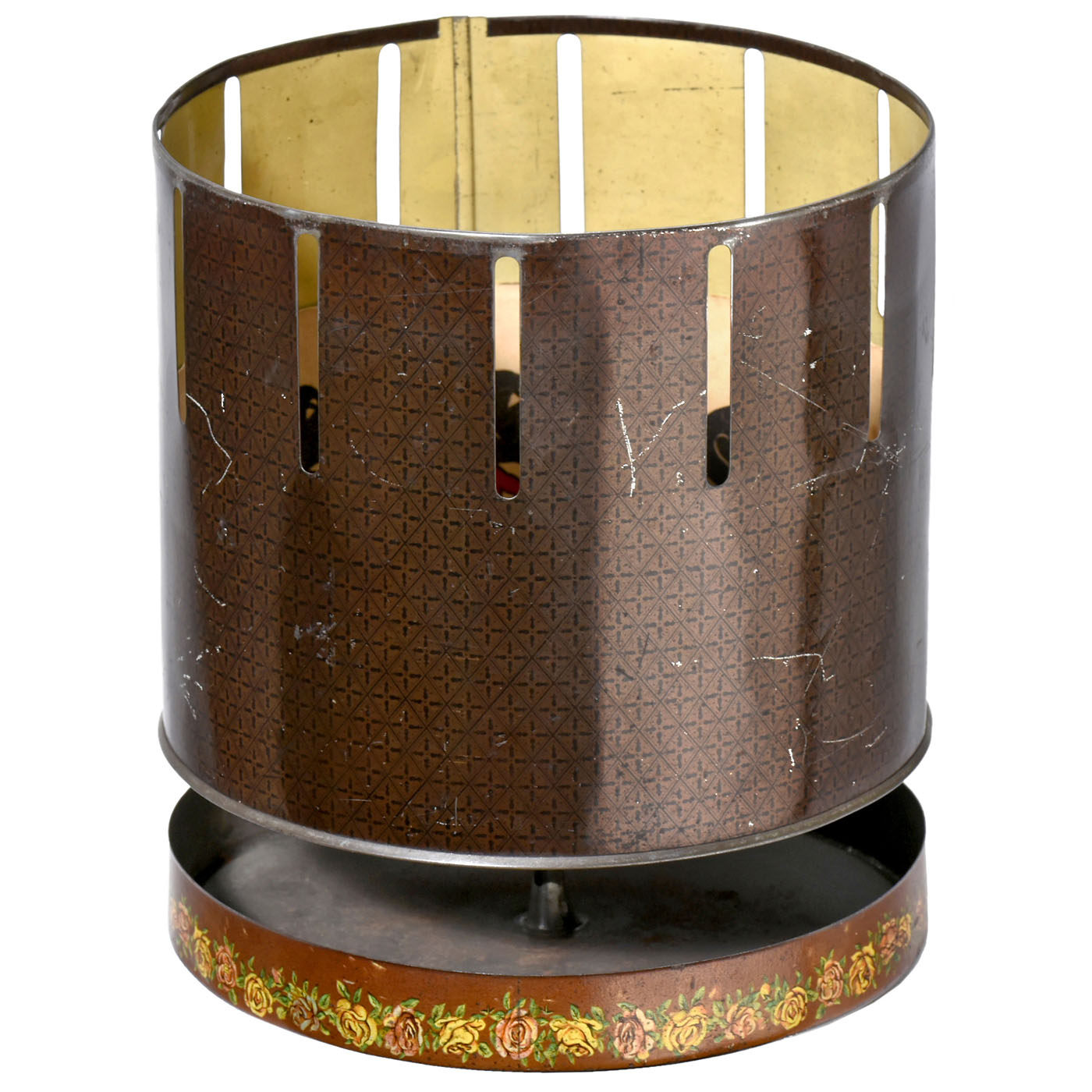 Germany, with 6 ½-inch chromolithographed tin depicting children playing with the zoetrope, the lid serving as the base / stand, height 7 in., with 5 original double-sided paper strips numbered 1-10. - An extremely rare zoetrope!