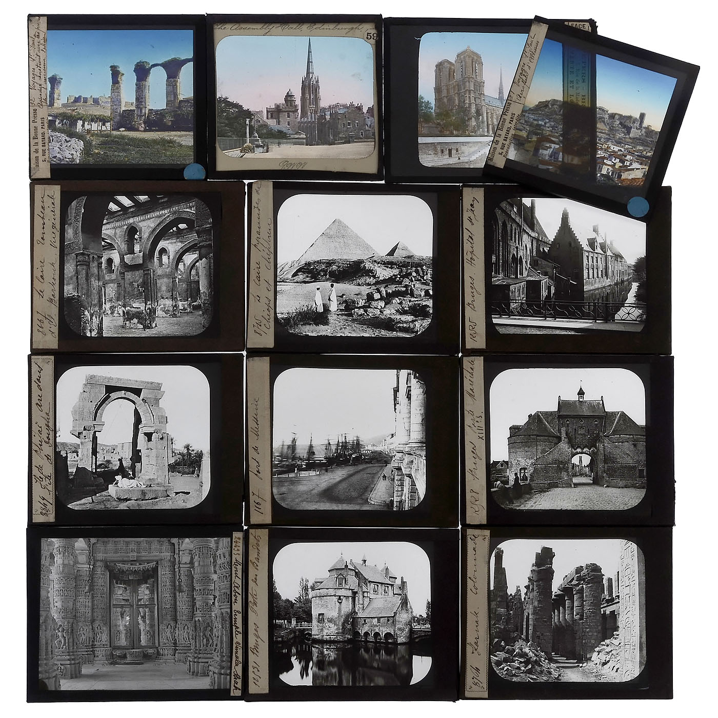 1) 3 boxes with approx. 130 slides, 8.5 x 10 cm, showing journeys to East Asia, Belgium, Ceylon, Messina, Algeria and Egypt, many tinted. - 2) 4 boxes and 2 small boxes of approx. 400 slides, 8.5 x 8.5 cm, including "Series XXX Cairo", no. 1-48 complete, "Series 67" on India, no. 1-48 complete, series on Australia, "Scotland and its history", "Life and Death of Queen Victoria 1-12", "General Gordon War at Soudan 1-24", as well as some hand-painted and comical slides - And: 3) German magic lantern slide series in 3 small wood boxes, c. 1910-12, 31 double-glazed slides, 7 x 28 cm and 7 x 21 cm, and a series of transfer-decorated German romantic scenes, a trip through America, with printed text, and daily life in Germany, some with minor glass defects.
