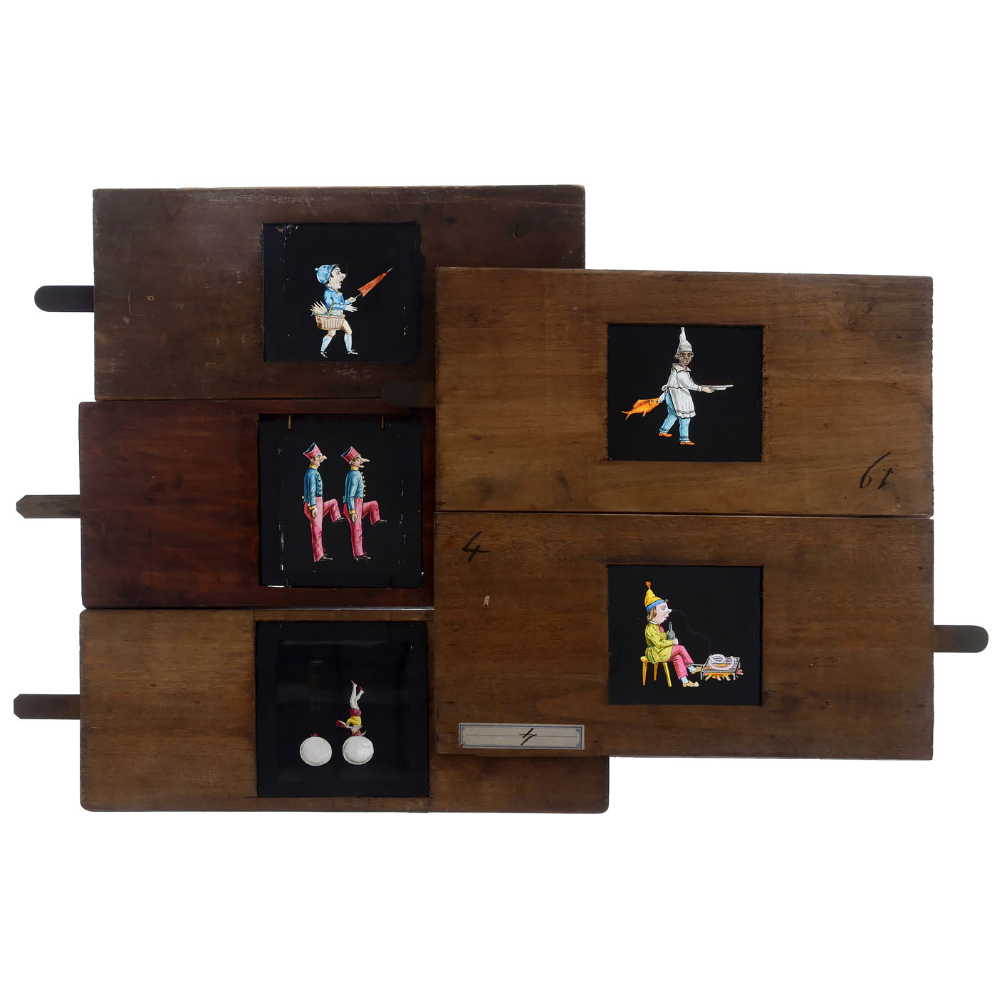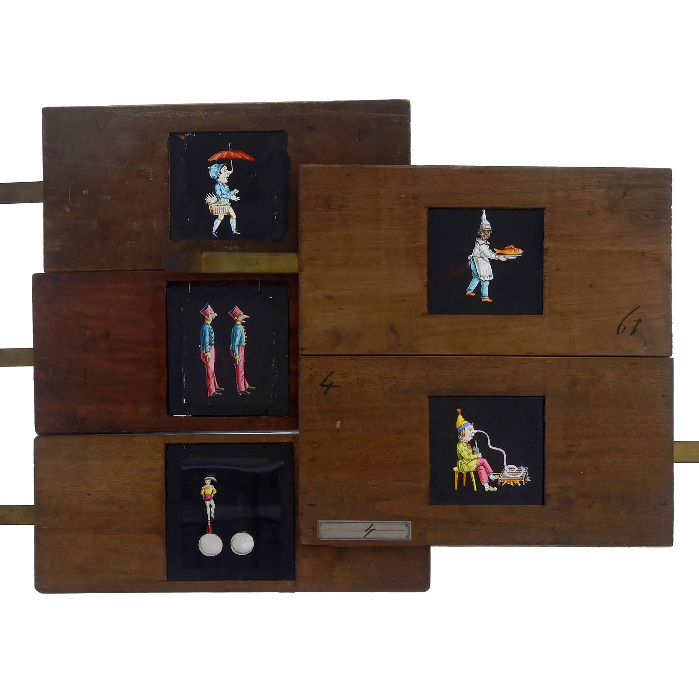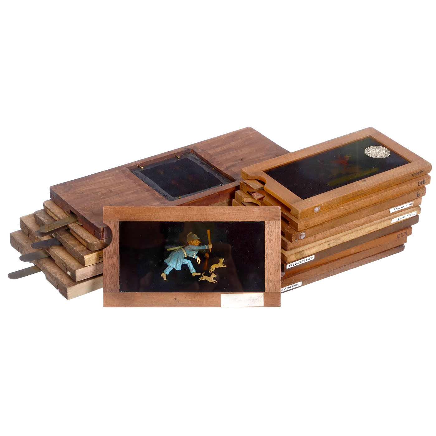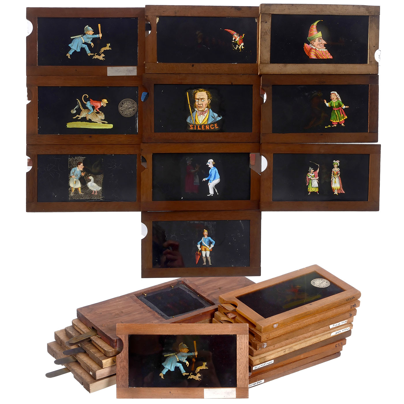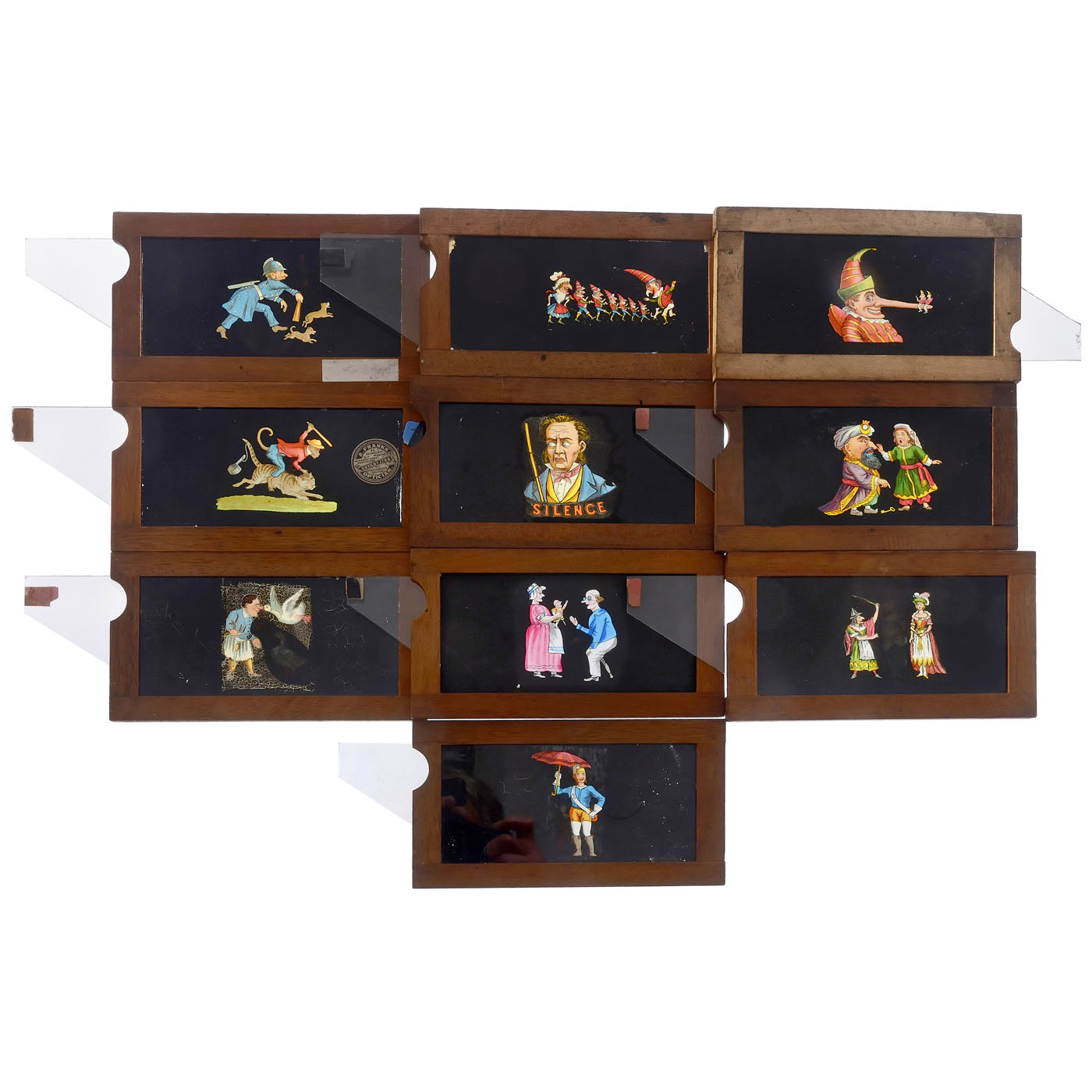 1-5) Hand-colored French lantern slides, 11.2 x 25 to 12.8 x 26 cm, with brass sliders, rare motifs: ball juggler, cook and fish, umbrella and nose, the long fried sausage and drilling soldiers. - 6) Wood frame, 10 x 17.8 cm, hand-painted transfer: "The inherited wood leg", good condition. - And: 7-15) Wood-framed printed slides, 10 x 17.5 cm, clown with a long nose, teacher "Silence", child and pascha, maid turning into a princess, Kaspar and his family, and others.