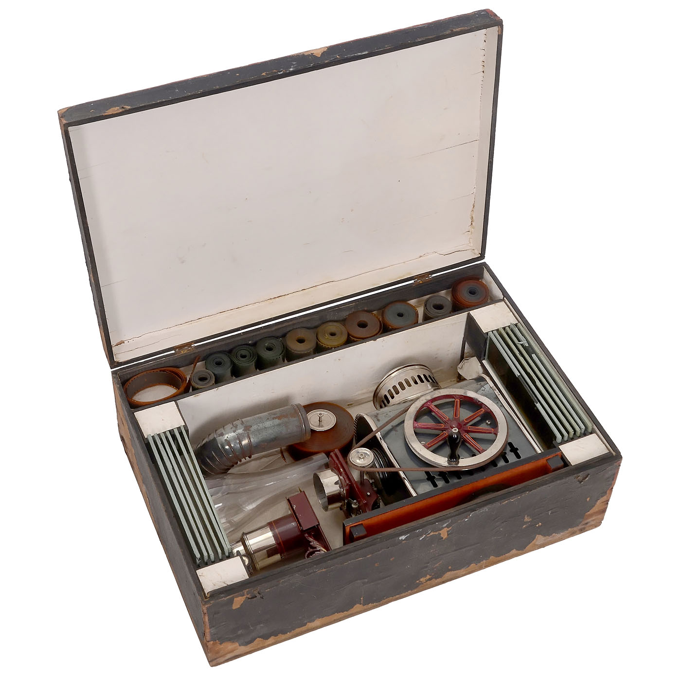 Jean Schoenner, Nuremberg. For 35mm film strips or 6 x 20 cm glass slides, blued sheet-steel case with nickel-plated fittings, three-part lens, rack-and-pinion focusing, petroleum duplex burner, height with chimney 17 in., well-preserved original working condition. - In addition: Approx. 10 short 35mm film strips of different lengths and colors, twelve glass slides of 6 x 20 cm showing childhood motifs and the original fitted wood transport box, box worn on the outside but Schoenner label complete.