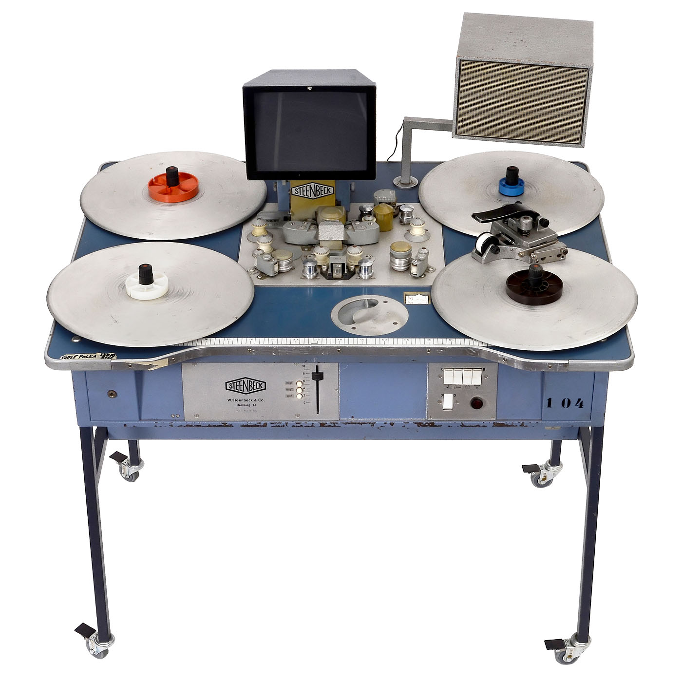 Steenbeck, Hamburg. 16mm film cutting table for viewing and listening to silent, light and magnetic sound films, with quarter-plate for two-lane synchronous operation. - In addition: 16mm adhesive press, cover, folder with instructions and circuit diagrams as well as two boxes of coil cores and spools. - Note: The device has been tested and is ready for use.