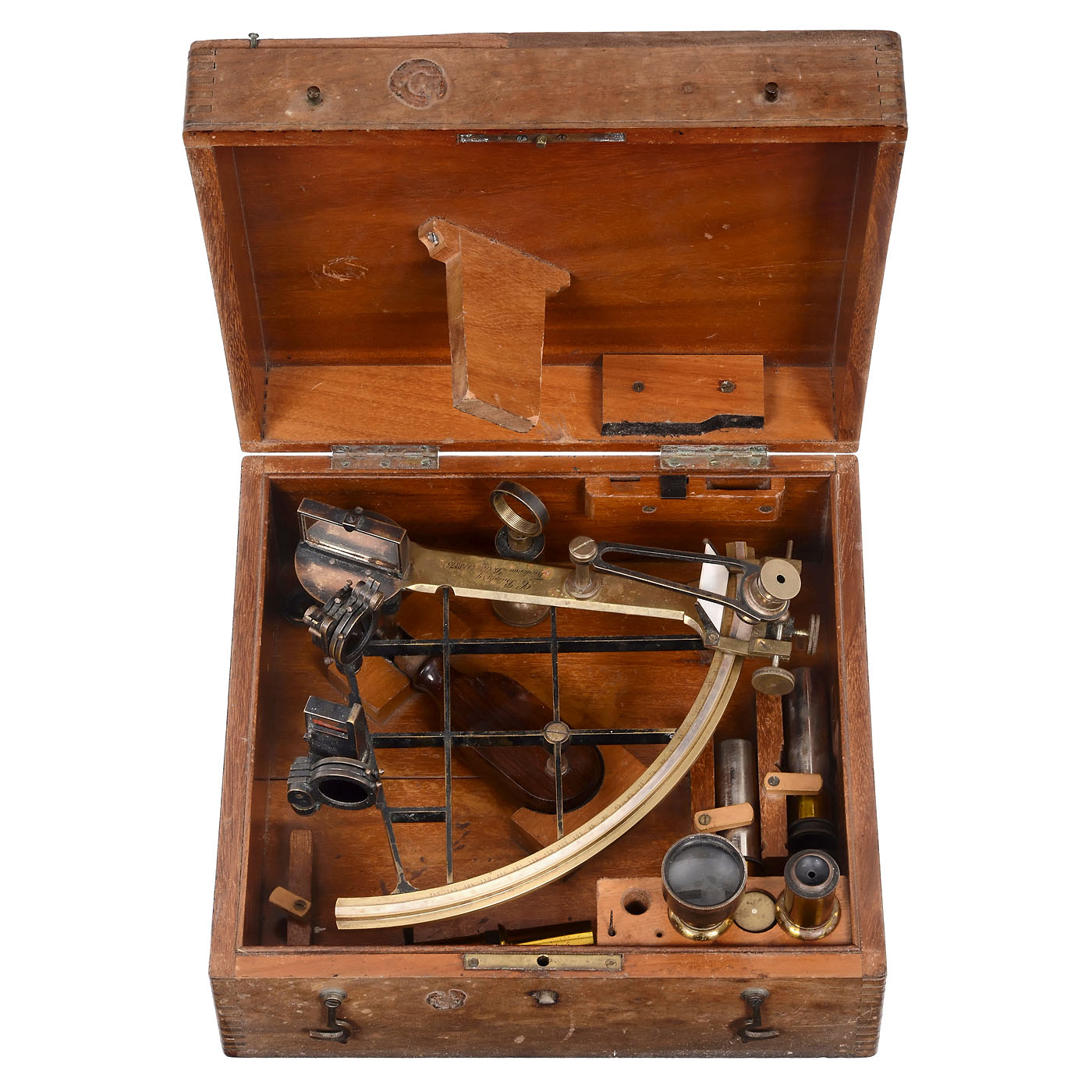 No. 8374, engraved "C. Bamberg, Friedenau-Berlin", lacquered and burnished brass, silver scales, 7 filters, magnifying glass, 2 telescopes, in original mahogany case, good original condition.