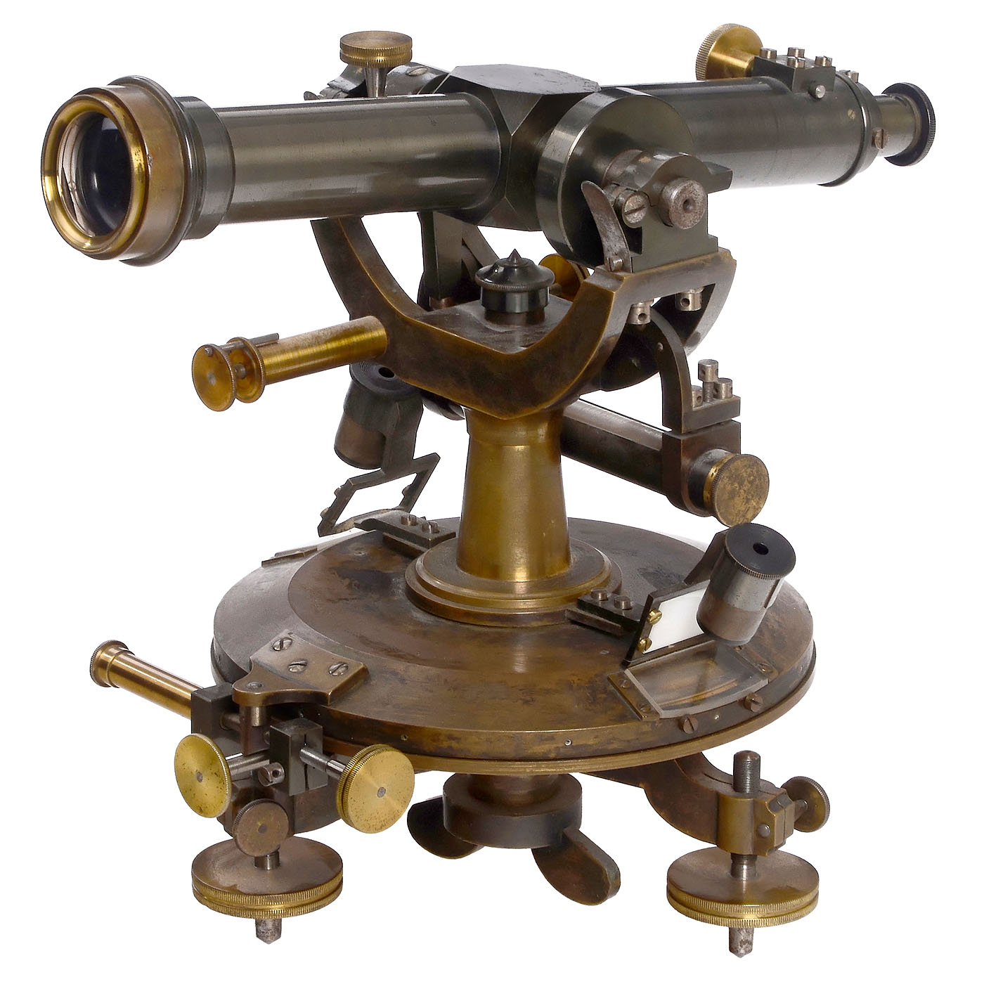 Engraved "Carl Bamberg, Berlin", original lacquered and burnished brass, 11-inch telescope with rack-and-pinion focussing, length 11 in., with 2 reading magnifiers (one bent) and a bubble level, on tripod with leveling screws, height 10 in.