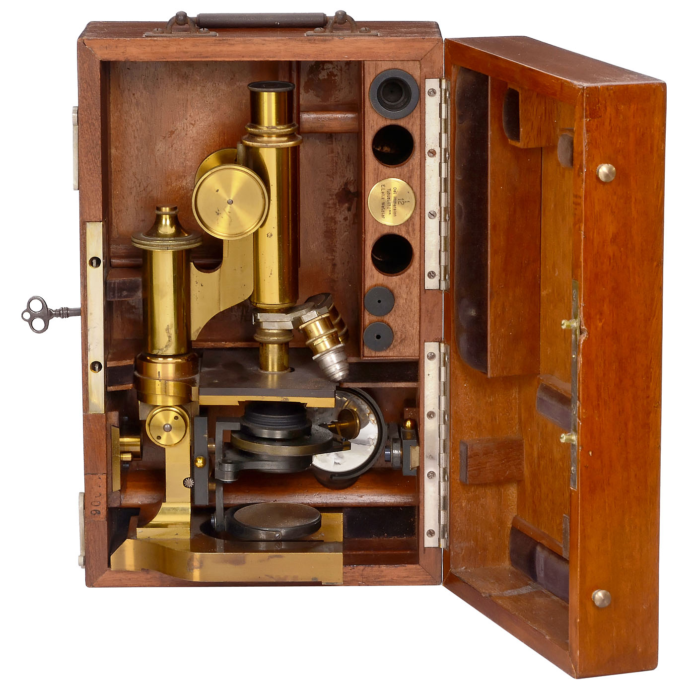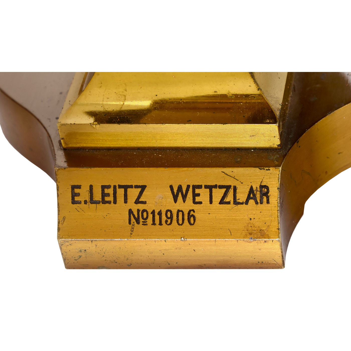 Engraved on the front: "E. Leitz - Wetzlar - No. 11906", original lacquered brass, double-mirror, iris diaphragm, condenser, coarse and fine adjustment, 1 eyepiece, 4 objectives, height 11 in., in fitted case with matching serial number.