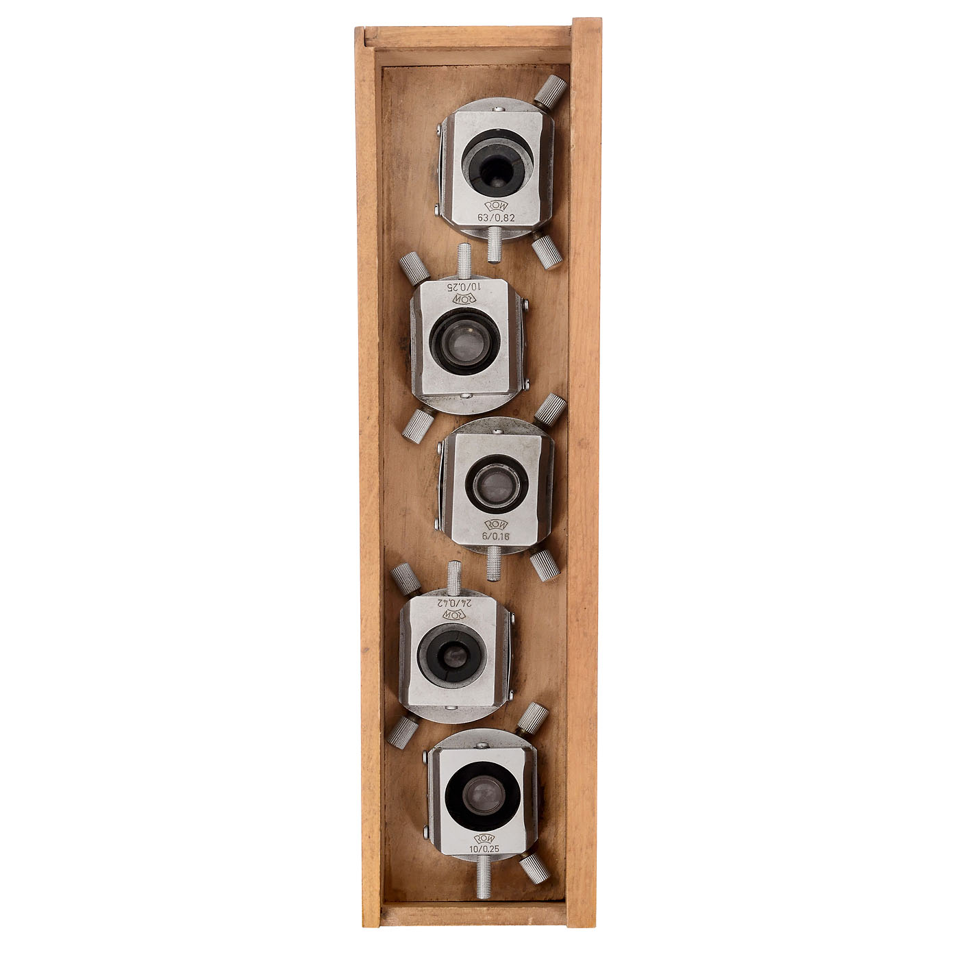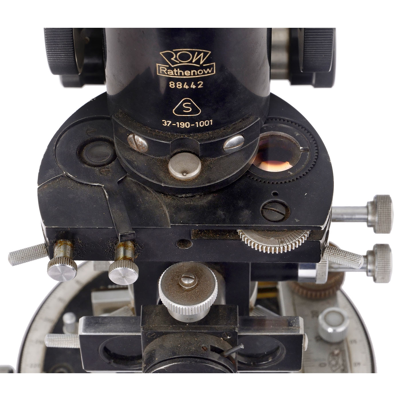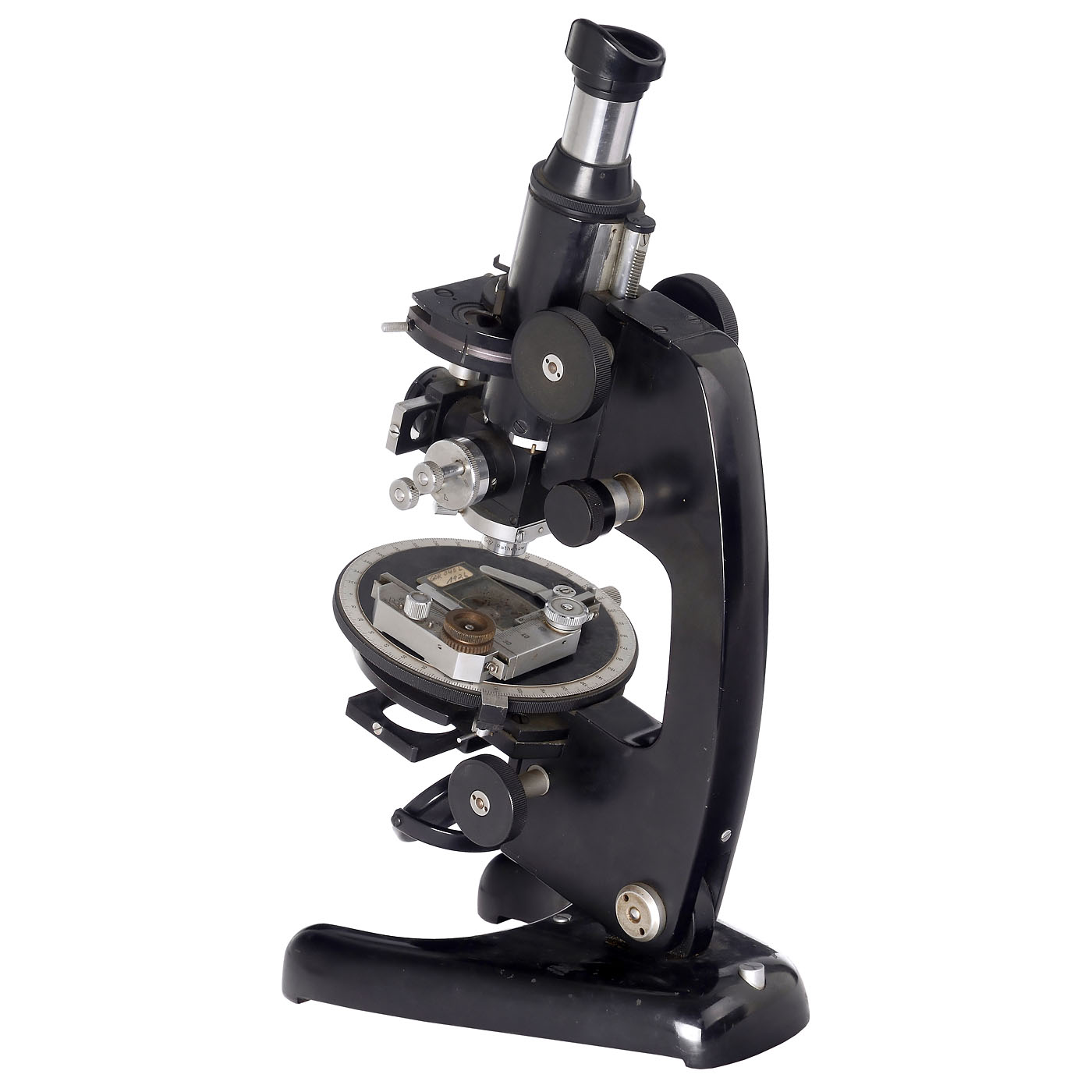 ROW Rathenau, Germany. No. 88442, black lacquer, tube with swing-in Bertrand lens in revolver mount, coarse and fine adjustment with knurled screws on the right and left, tilting stand, round cross-stage with 360˚ graduation, object guide with millimeter graduation adapted for the stage, height-adjustable iris diaphragm, plane single mirror, height 13 ¾ in., with illumination unit and 5 objectives in matching wood case.