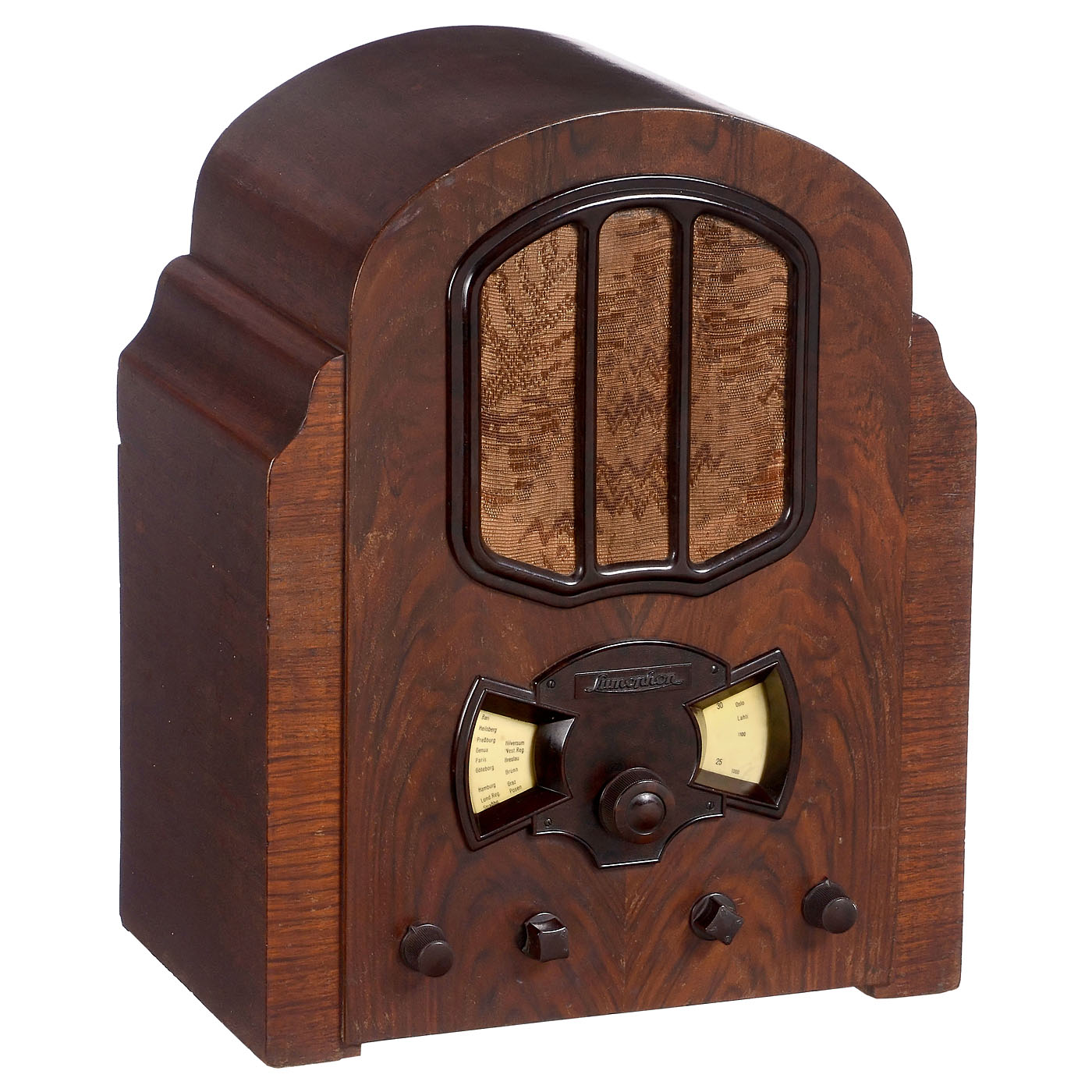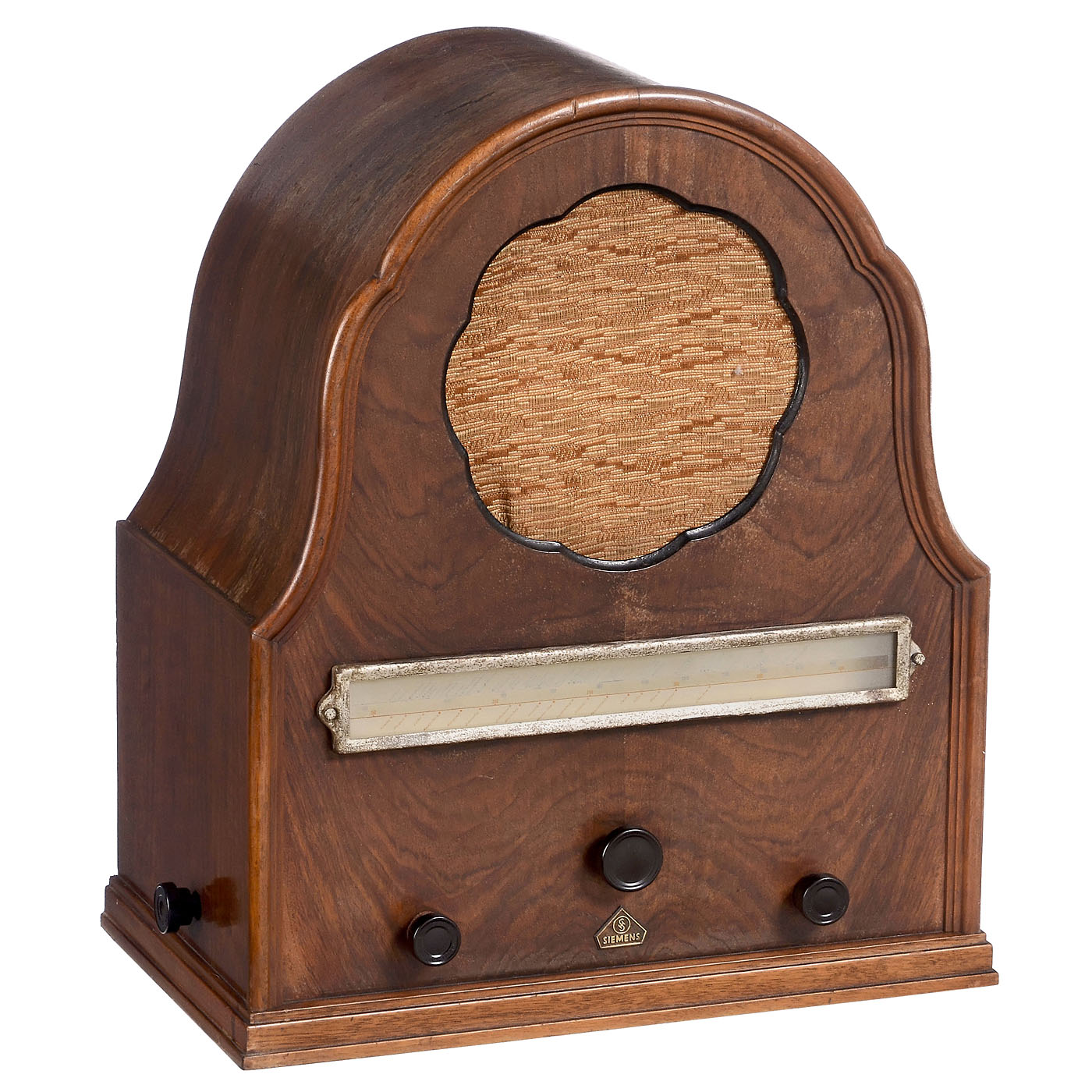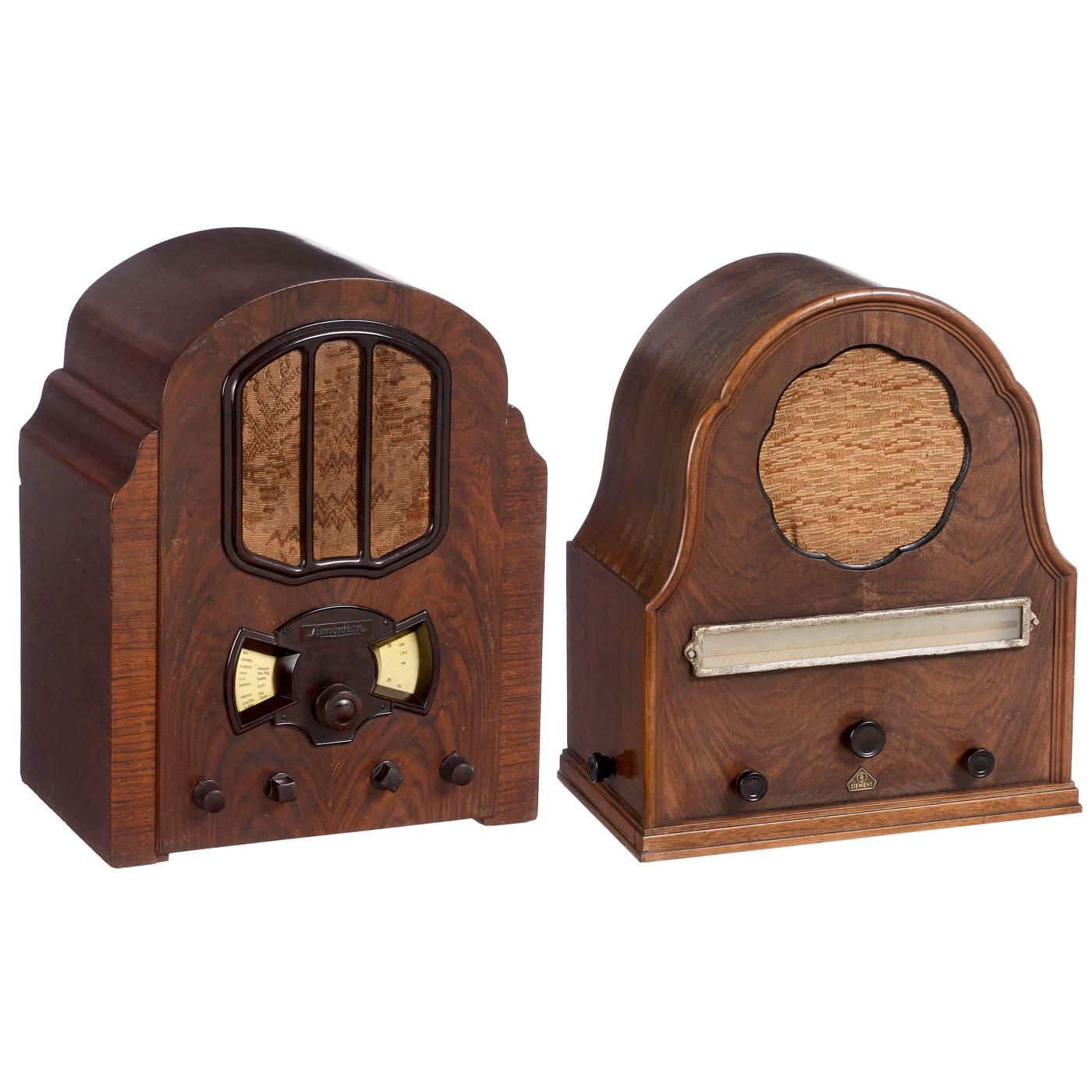 1) Siemens 46WL, 1932, Siemens & Halske, 5 tubes, long wave and medium wave, 110-240 volts AC, dynamic loudspeaker, wood case, complete with tubes and rear panel, untested. - And: 2) Lumophon WD 3200 II, 1933, Bruckner & Stark, Nuremberg, 5 tubes, long wave and medium wave, 110-240 volts AC, dynamic loudspeaker, wood case, complete with tubes and rear panel, works.