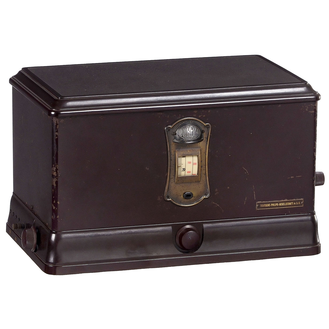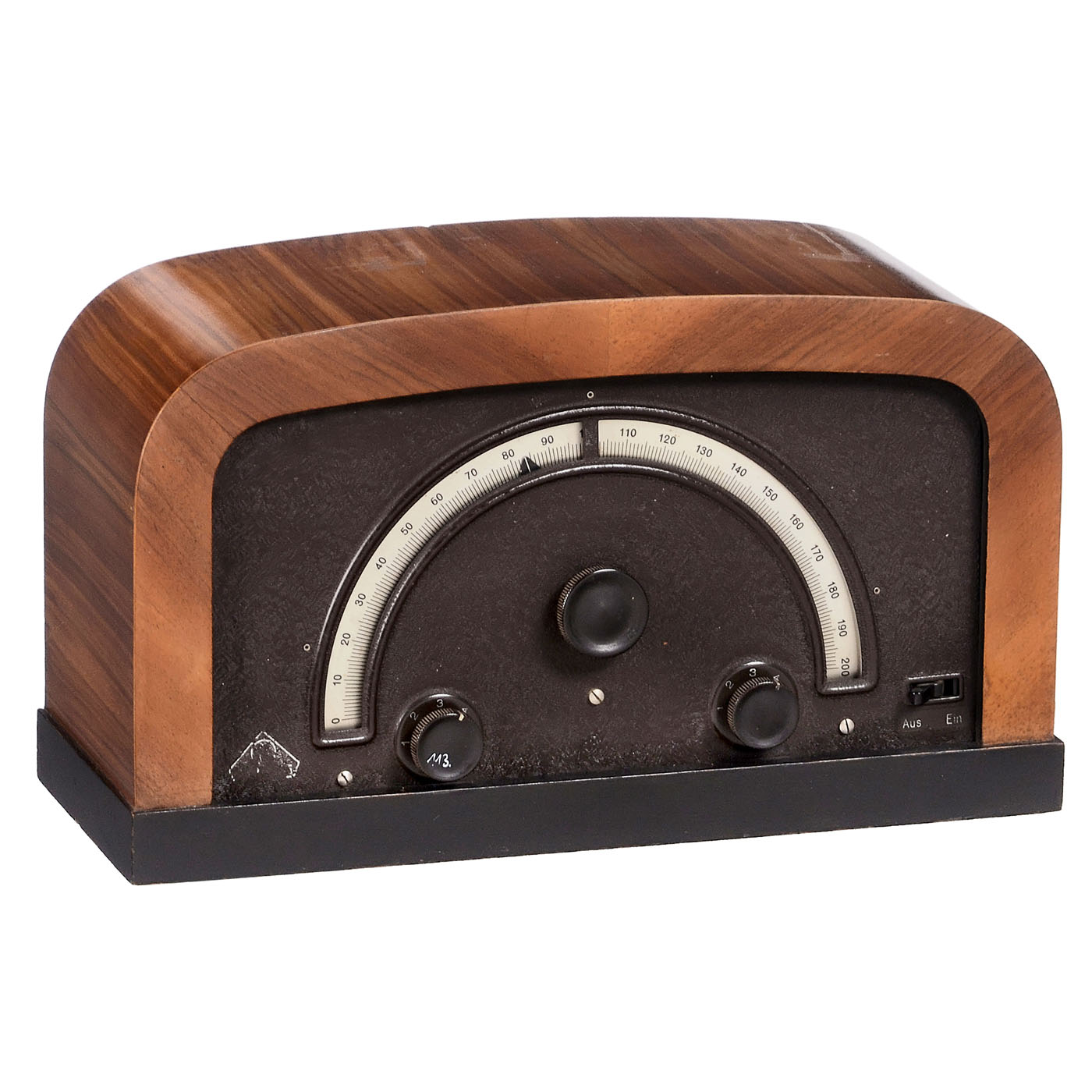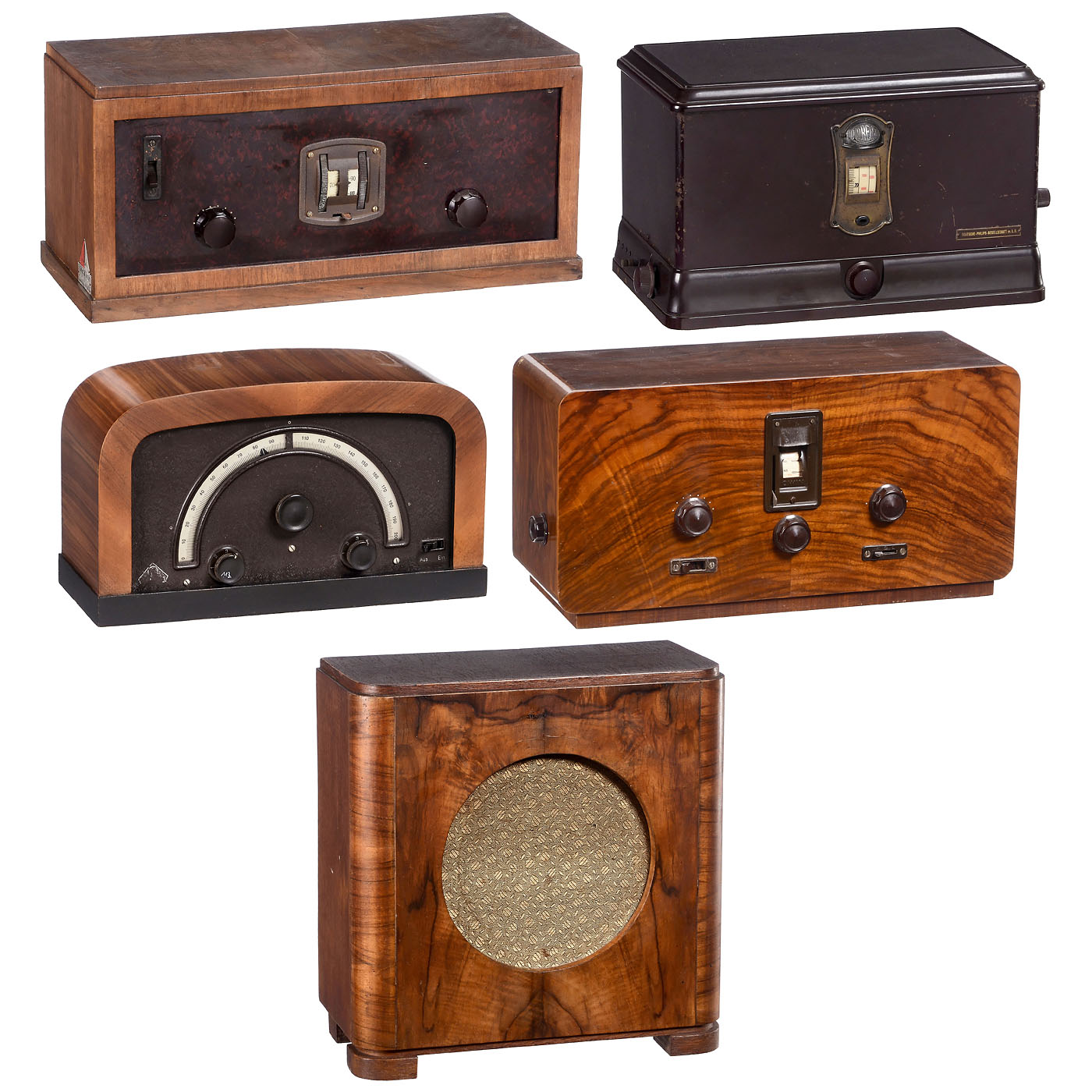 1) Owin E11W, 1930, 5 tubes, long wave and medium wave, 90-240 volts AC, wood case, complete with tubes, all components and rear panel. - 2) Owin, c. 1929, loudspeaker, wood case. - 3) Siemens 31 W, c. 1930, Siemens & Halske, 4 tubes, long wave and medium wave, 110-220 volts AC, wood case, complete with tubes, all components and rear panel. - 4) Owin E42W, c. 1929, 5 tubes, long wave and medium wave, 110-220 volts AC, wood case, complete with tubes, all components and rear panel. - And: 5) Lorenz Völkerbund NETV429W, c. 1930, 5 tubes, long wave and medium wave, 110-220 volts AC, metal case, complete with tubes, all components and rear panel.