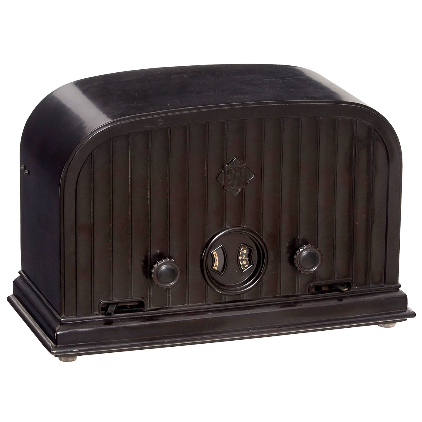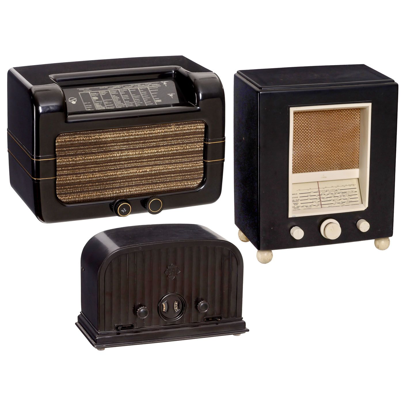 1) Blaupunkt 4W29, c. 1939, Ideal-Werke AG, Berlin, 3 tubes, long wave and medium wave, 110-240 volts AC, dynamic loudspeaker, untested. - 2) Siemens Standard 62W "Gentleman in tailcoat", c. 1936, Siemens & Halske, Berlin, 3 tubes, long wave and medium wave, 110-240 volts AC, dynamic loudspeaker, untested. - And: 3) "Small cat head" model 230W, c. 1931, Telefunken Germany (TFK), 4 tubes, long wave and medium wave, 107-220 volts AC, for external speaker, untested. - All bakelite cases in good condition, complete with tubes, all components and original rear panels.