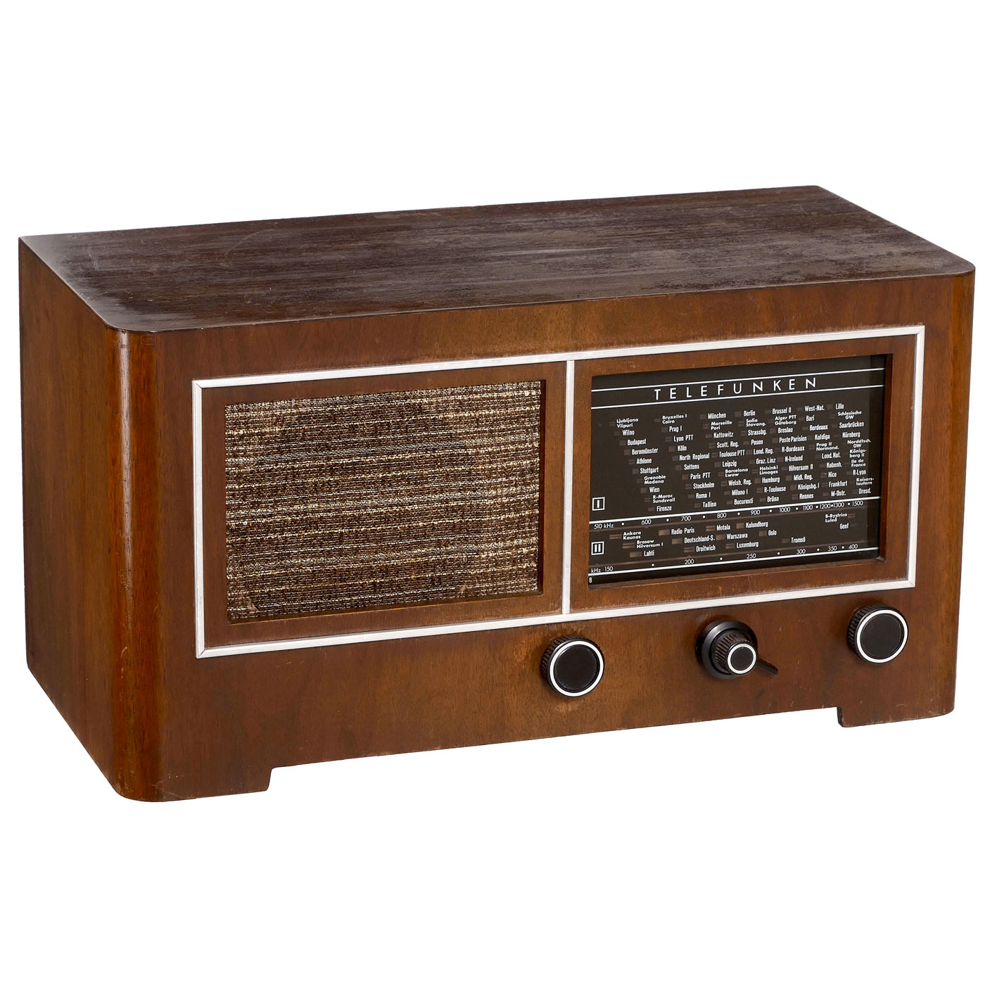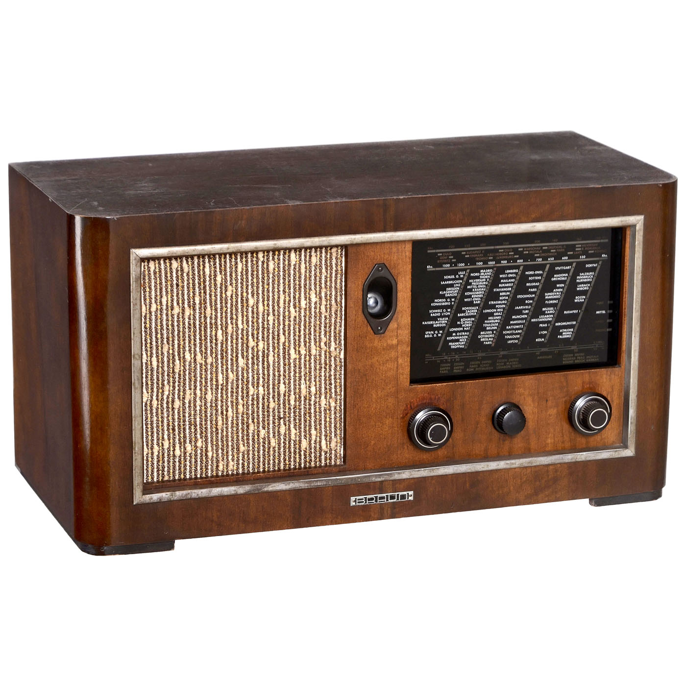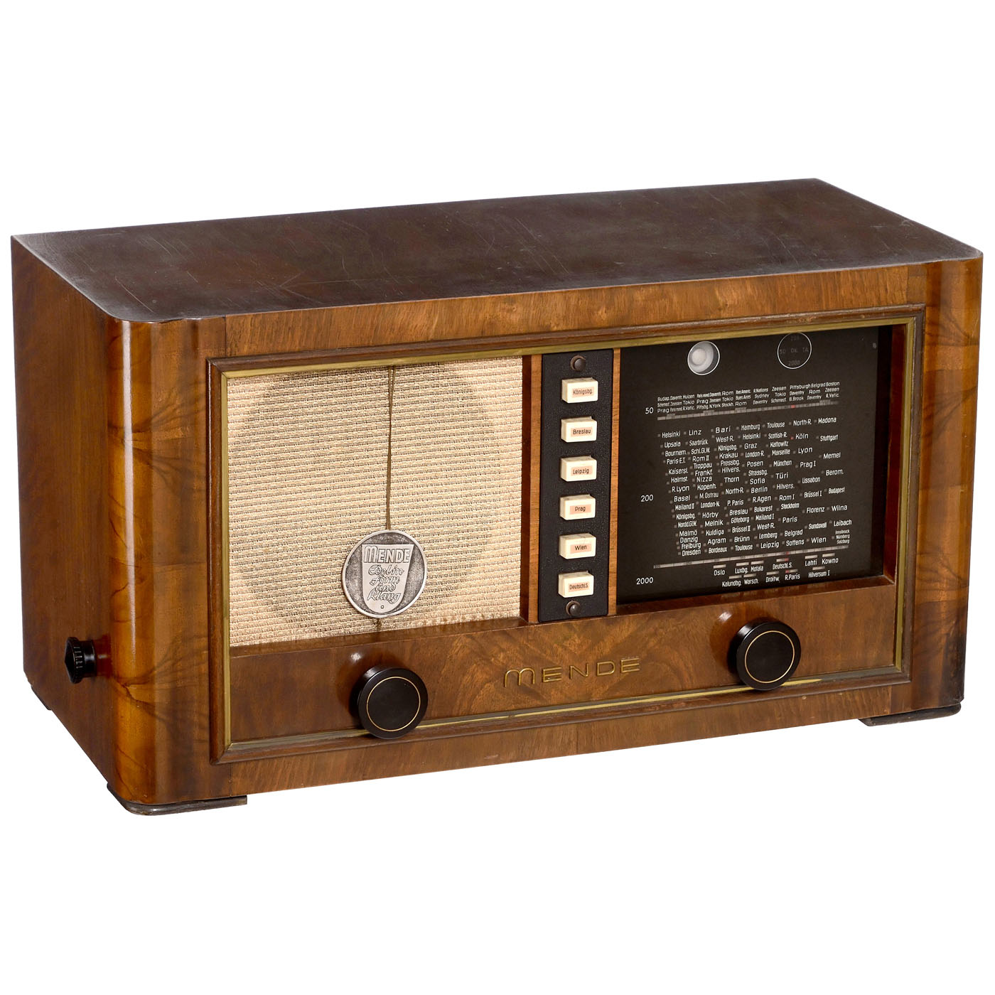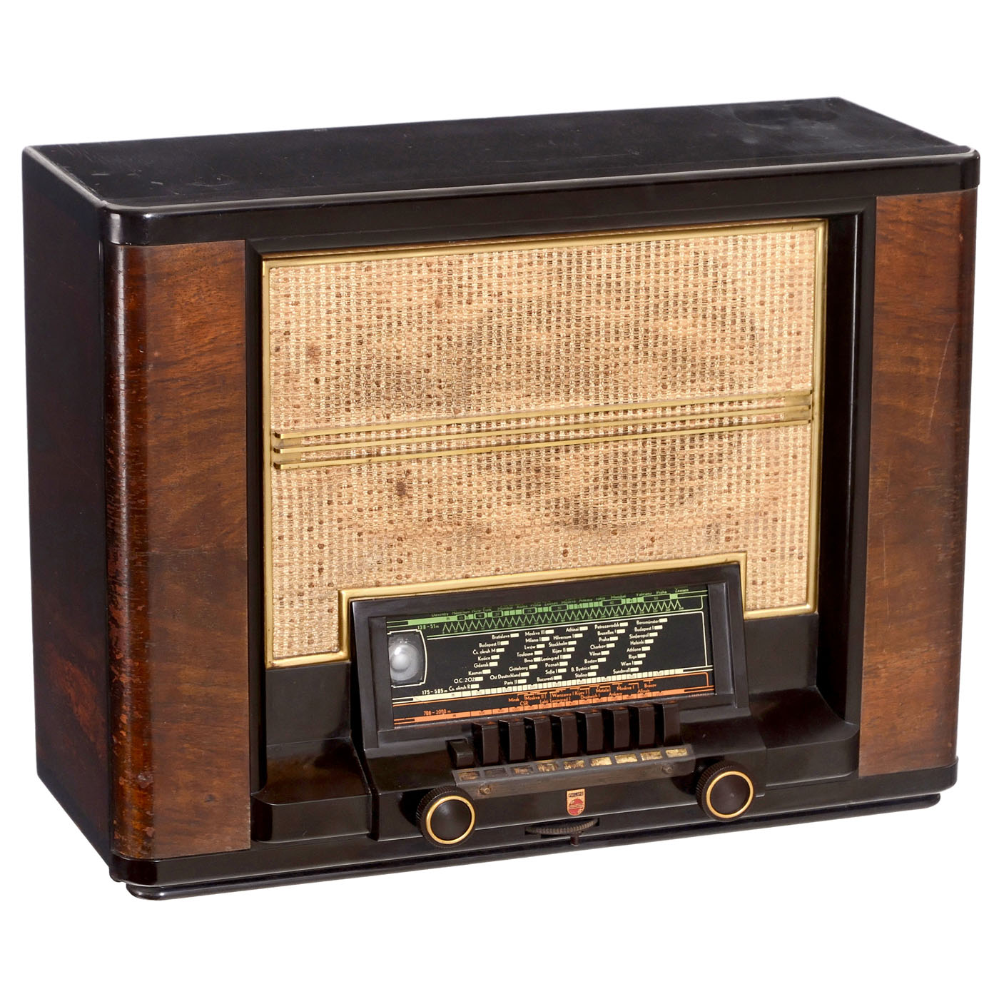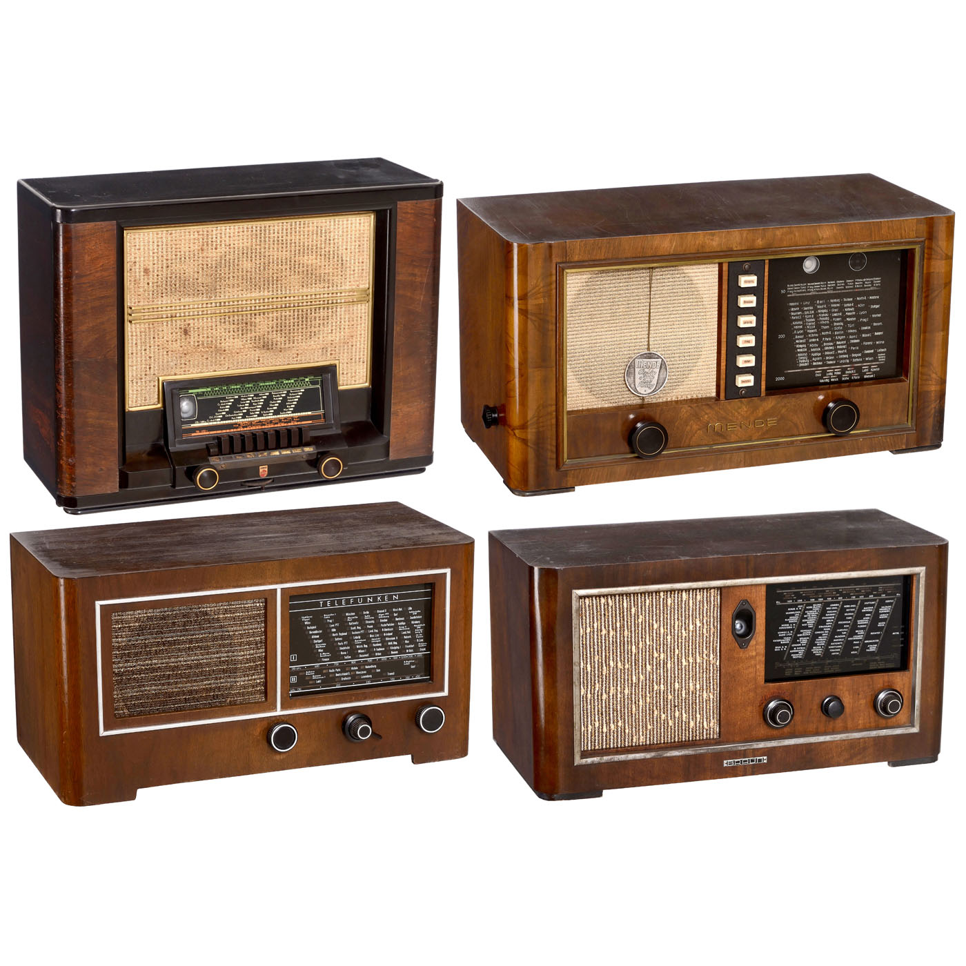 1) Philips 735A-14, c. 1939, Philips, Prague, 5 tubes, long wave, medium wave and short wave, 110-245 volts AC, dynamic speaker, 9 push buttons, works. - 2) Mende Super MS240-WDK, c. 1939, Radio H. Mende & Co. GmbH, Dresden, 6 tubes, long wave, medium wave and short wave, 85-240 volts AC, dynamic loudspeaker, 6 push buttons, works. - 3) Braun 5640 W, c. 1939, Frankfurt, 5 tubes, long wave, medium wave and short wave, 110-240 volts AC, dynamic loudspeaker, wood case, works. - And: 4) Telefunken 855W "Markstein Super II", c. 1938, 5 tubes, long wave and medium wave, 110-240 volts AC, dynamic loudspeaker, wood case, works. - All complete with tubes, all components and original rear panel.