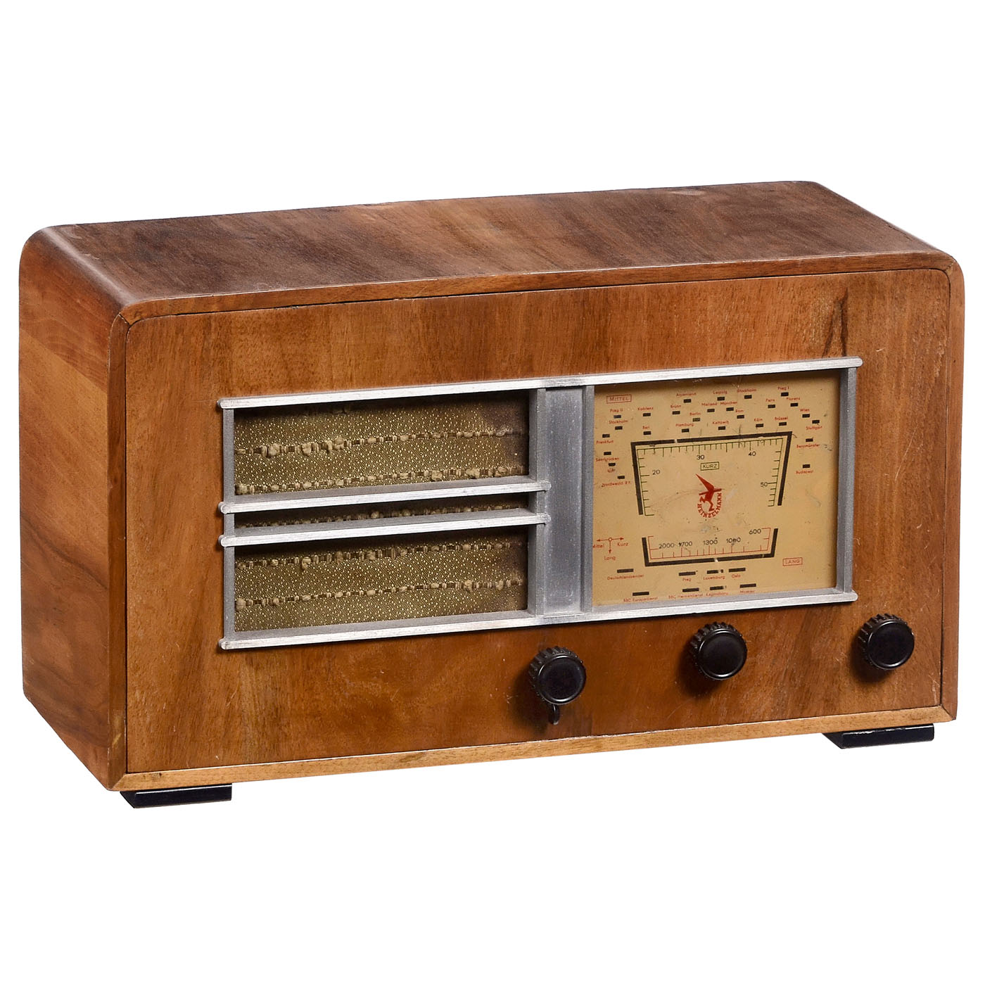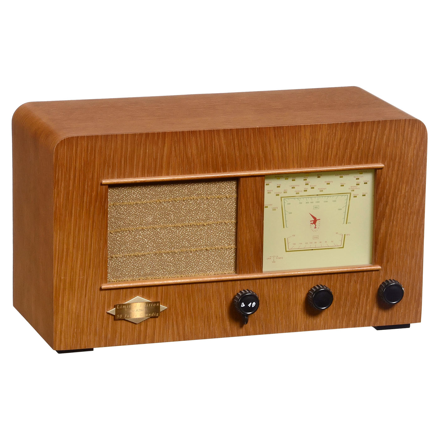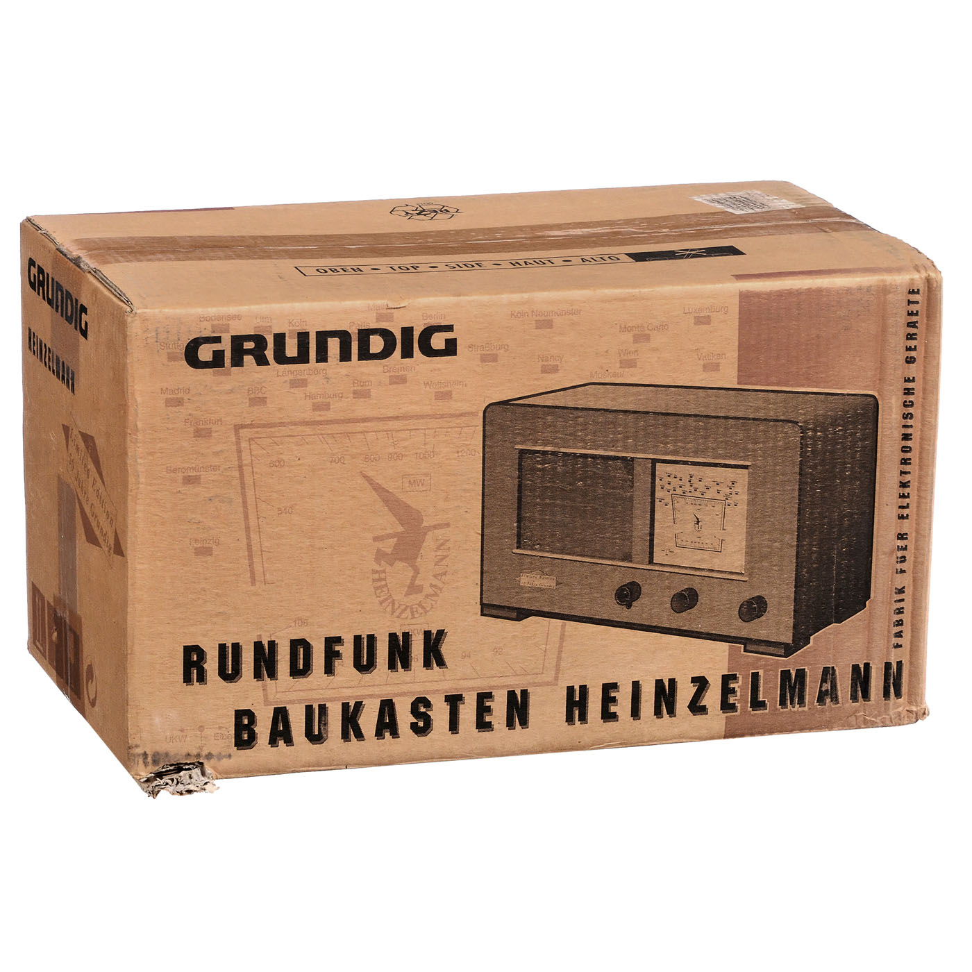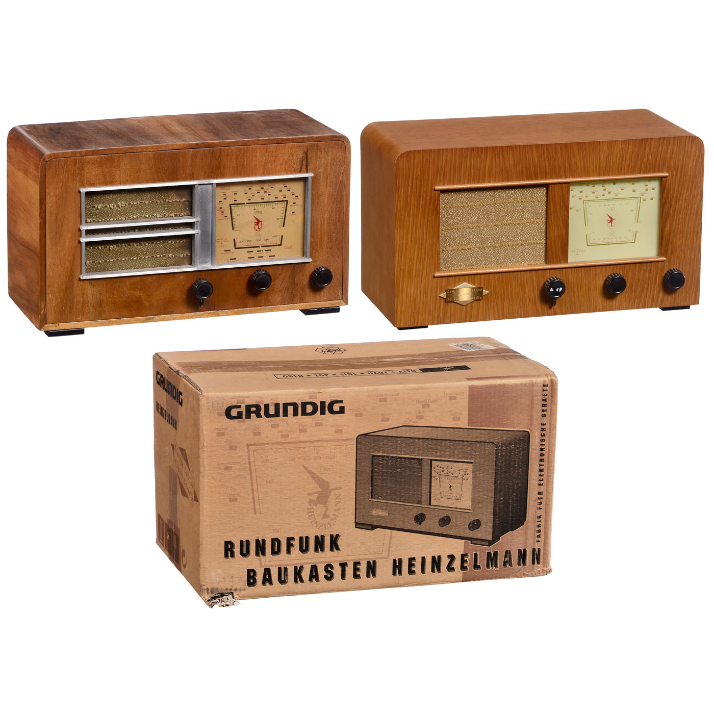 1) The 1st Grundig radio after WWII, sold originally only as a kit, 2 tubes (2 x RV12P2000), all-current set, very rare! - And: 2) Replica Heinzelmann, 50 years Grundig, transistor receiver in original box.