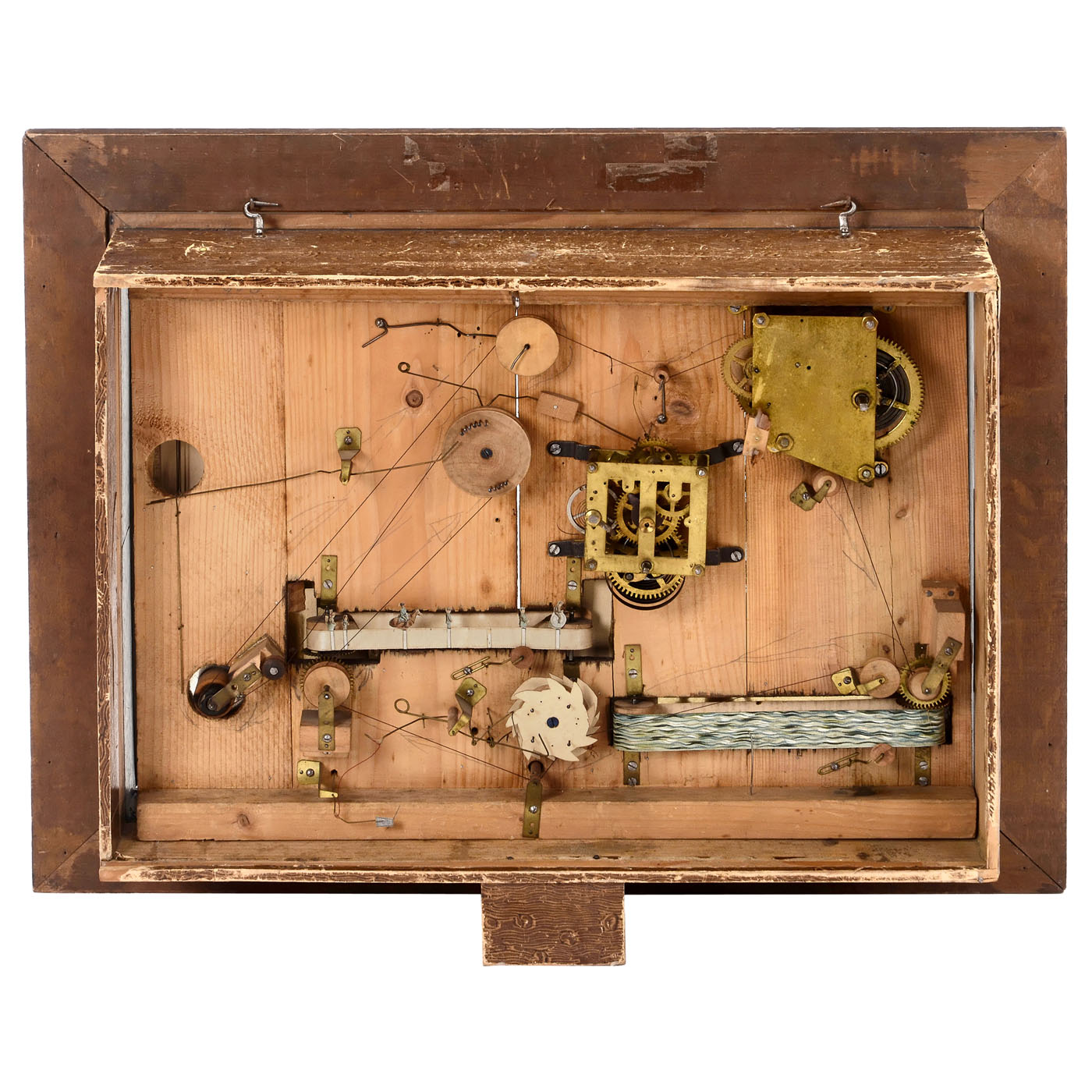 Germany, chromolithographed paper on card, depicting a town on the river with moving water and windmills, moving stream, figures crossing a bridge, a bell tolling in church tower and a smith repairing a wagon wheel while two children swing on the shaft like a see-saw, with one movement for the timepiece and another (with cut-card cams, pinned wheels and pulleys) for the automaton, in grained-paper-covered case with wood-and-gesso frame, wd. 16 x 20 ½ in. (41 x 52 cm), backboard split, governor missing fans (fast-running), would benefit from sympathetic restoration. - Note: The successor of Ernst Holzweissig of Leipzig offered a very similar piece in his 1898 wholesale catalog in the category of mechanical pictures without music: "No. 126. Rheinlandschaft mit Uhr".