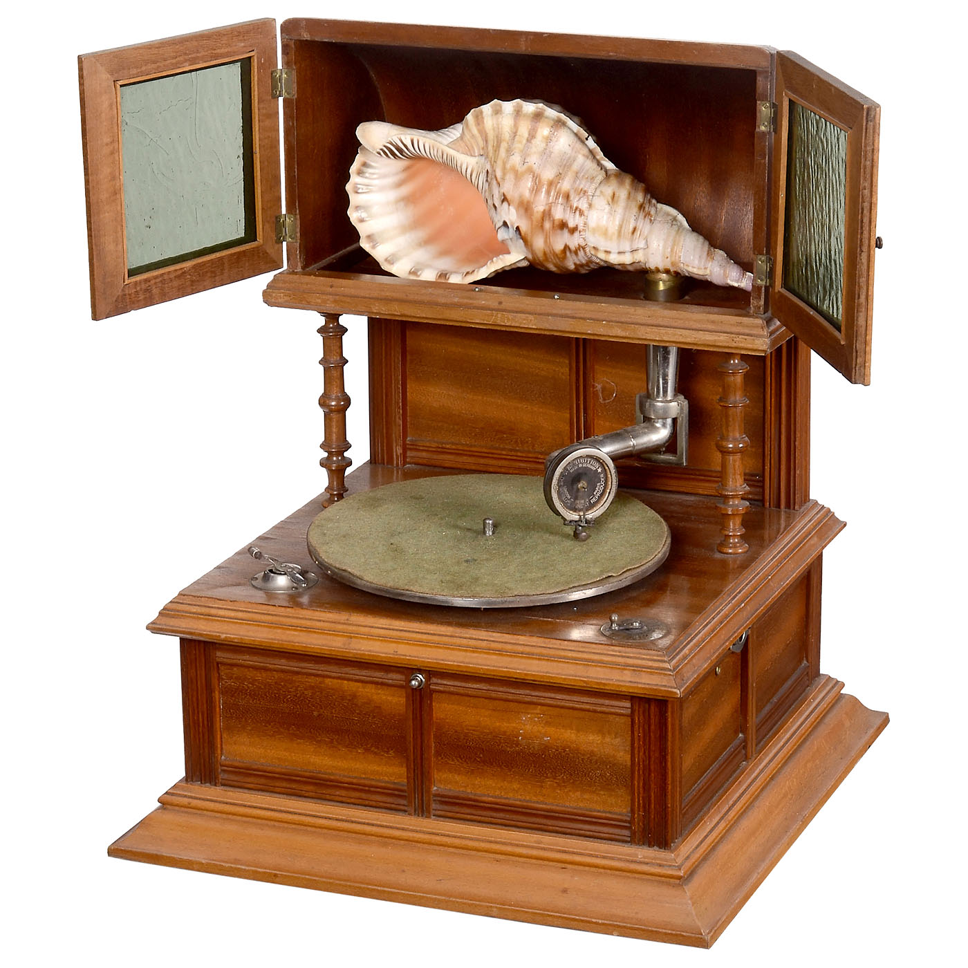 Unmarked, table model, top with large seashell as horn, 10-inch turntable, exhibition mica reproducer, double-spring motor, walnut case, motor running but sticks, without crank. - A rare and unusual gramophone.