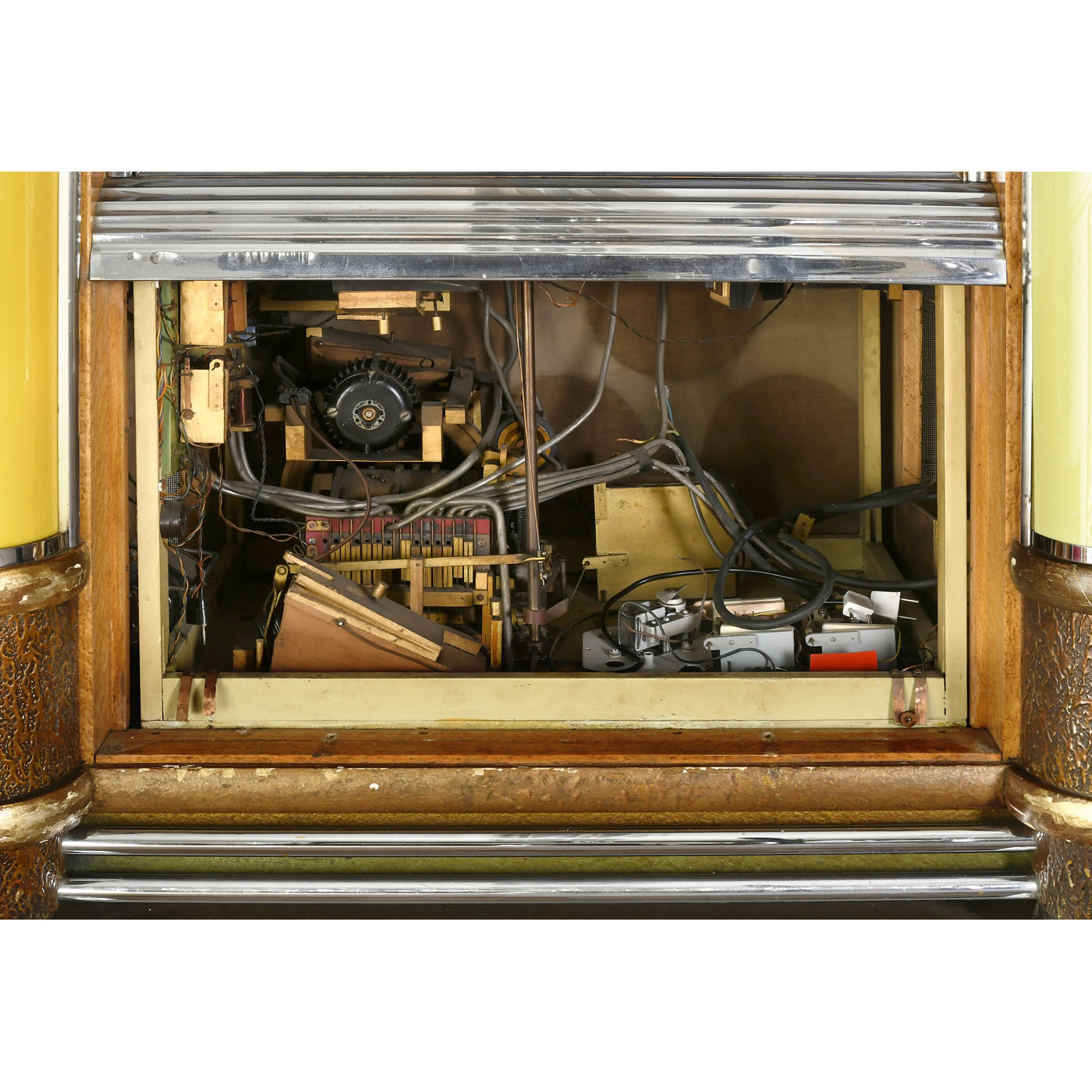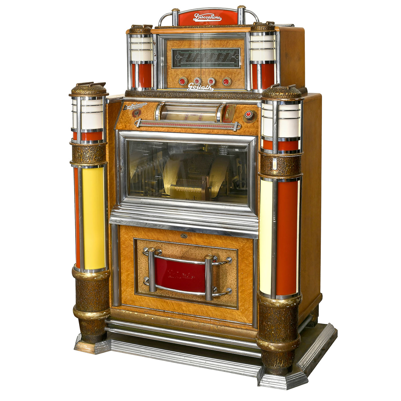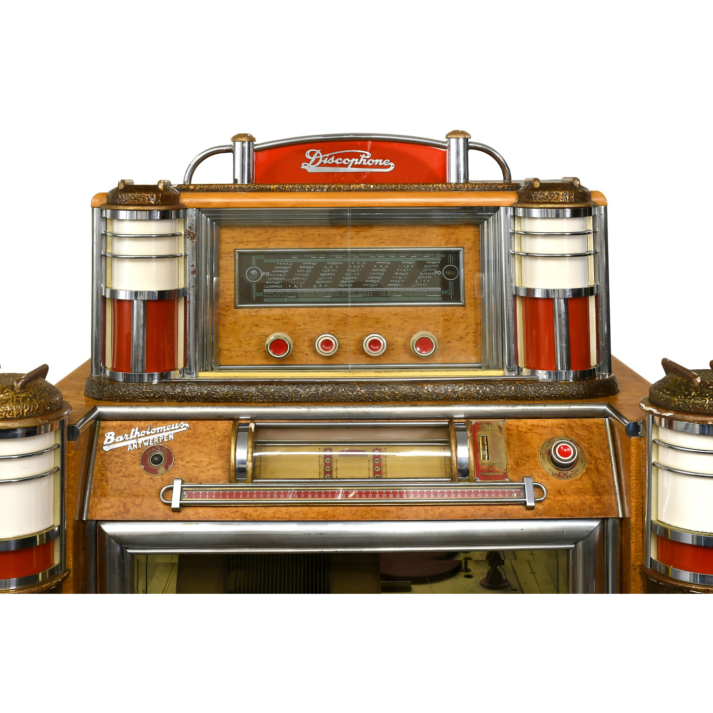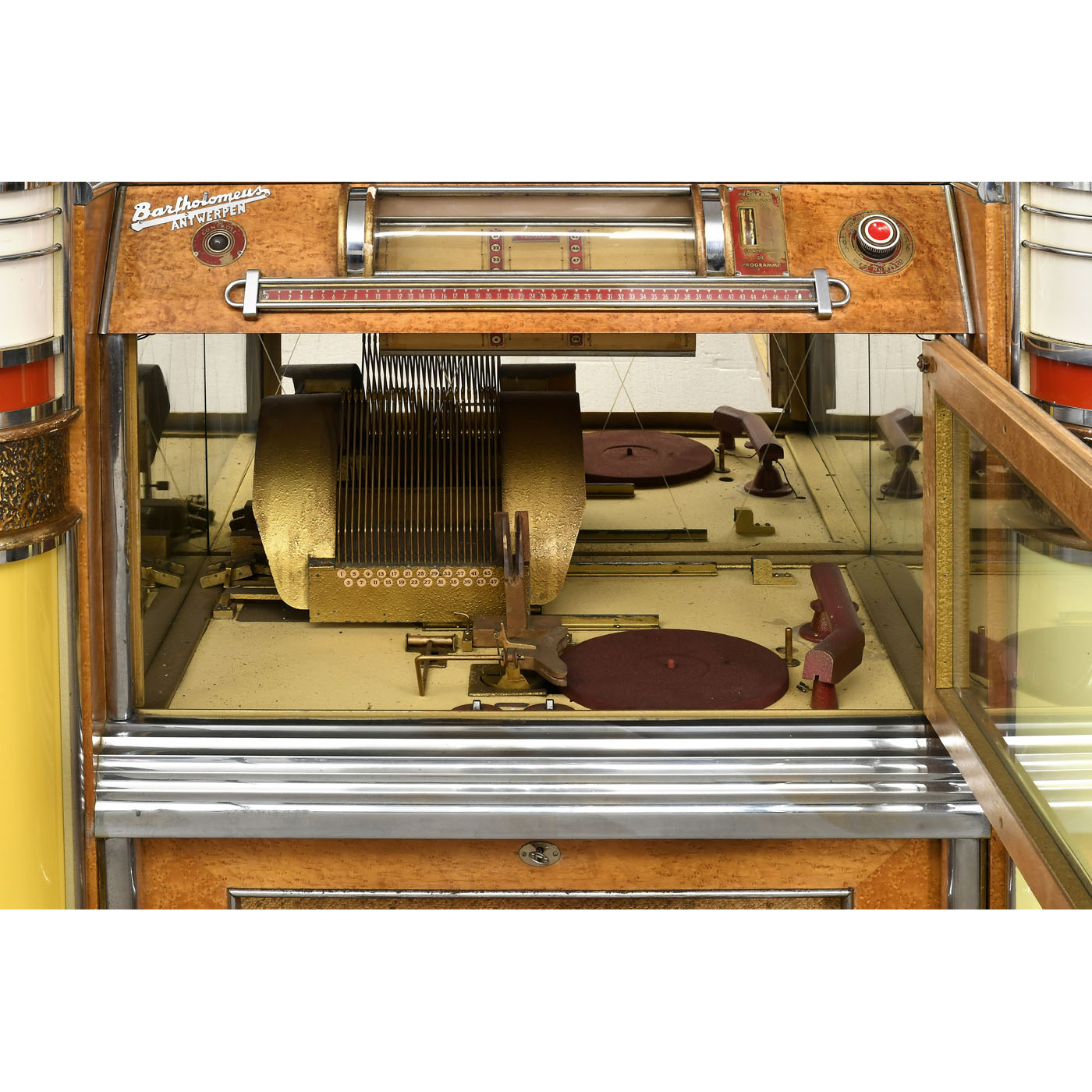 Pierre Eich & Bartholemus Cie., Belgium. For 78-rpm shellac records, 48 selections, pneumatic control, a similar system to pipe organs, coin-slot, headboard with inbuilt radio, 220 volts, elaborately designed case with illuminated columns, dimensions 47 x 29 x 70 in., weight approx. 400 kg, good original condition, in need of restoration.