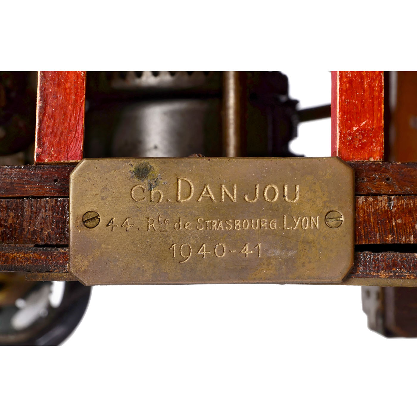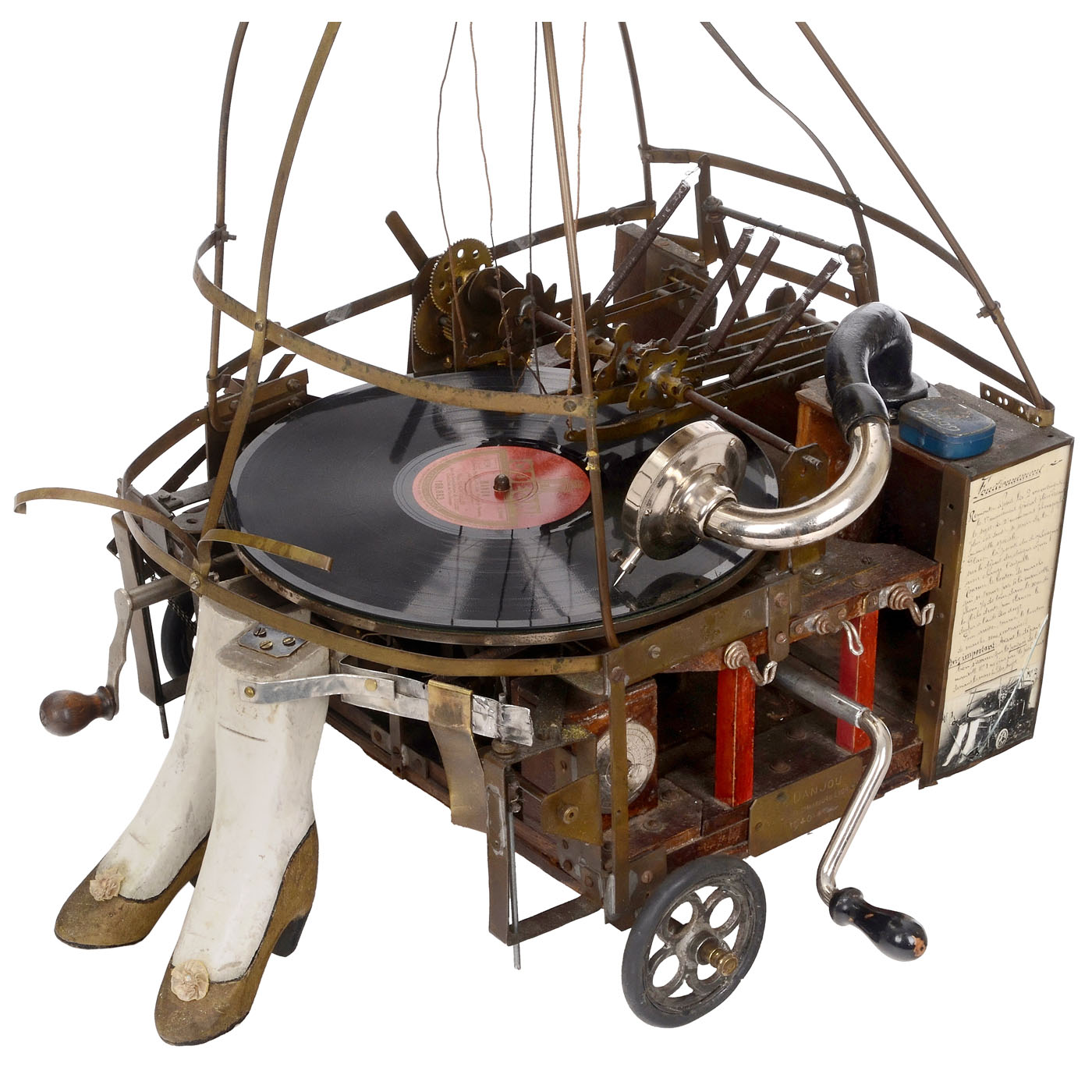 Place de Strasbourg, Lyon, with German bisque socket head impressed "1909, 2" (c. 1900), open mouth, fixed blue glass eyes, brown hair wig, composition shoulder-plate, articulated papier-mâché lower arms, carved wood feet, brass strap-form torso and skirt concealing the 78-rpm gramophone with spring motor, a second spring motor with four cams for the automaton movements, a double chain-drive and two eccentric wheels for the walking motions, with glazed manuscript operating instructions, in lace-edged silk brocade dress, ht. 33 ½ in. (84 cm), with both cranks, wig not removed, working condition. - Note: A remarkable audio-visual automaton by a hitherto undocumented maker. The piece was evidently a small-scale production, possibly unique, using commercial components ingeniously combined together. - The figure rolls forwards while turning her head, raising flowers in her right hand and lifting and twisting her left arm. Her feet move alternately as though taking steps. The gramophone mechanism functions separately.