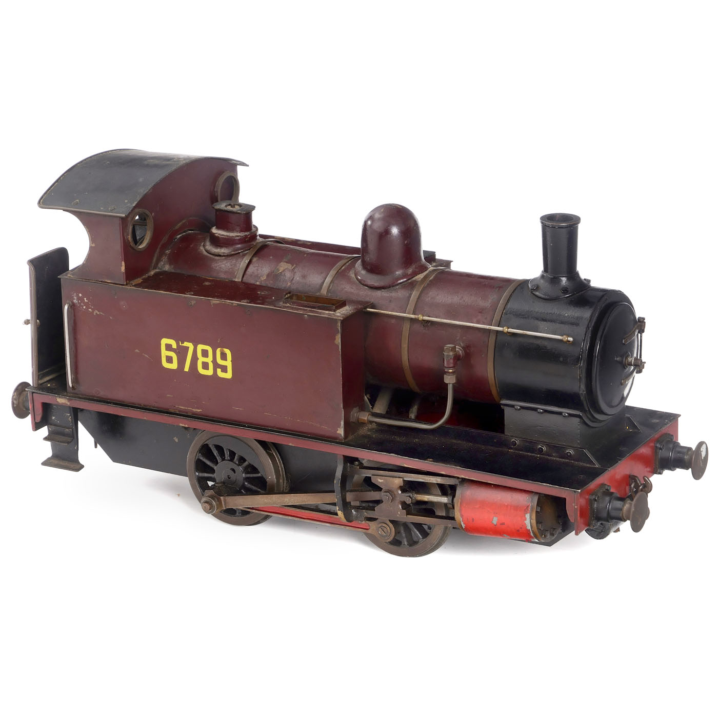 British Railways tank locomotive, no. 6789, 1:16 scale, 3 1/2 in. standard gauge, finished in black and maroon, 0-4-0 wheel arrangement, two outside cylinders, coal-fired soldered flame-tube copper boiler with fittings, including steam regulator and boiler pressure gauge, spring-loaded cast-metal spoked wheels, sturdy metal frame, spring-loaded buffers, two water tanks on the side (missing one lid), total length 20 ½ in. - Note: This model is built as a working engine but has not been tested under steam prior to the auction.