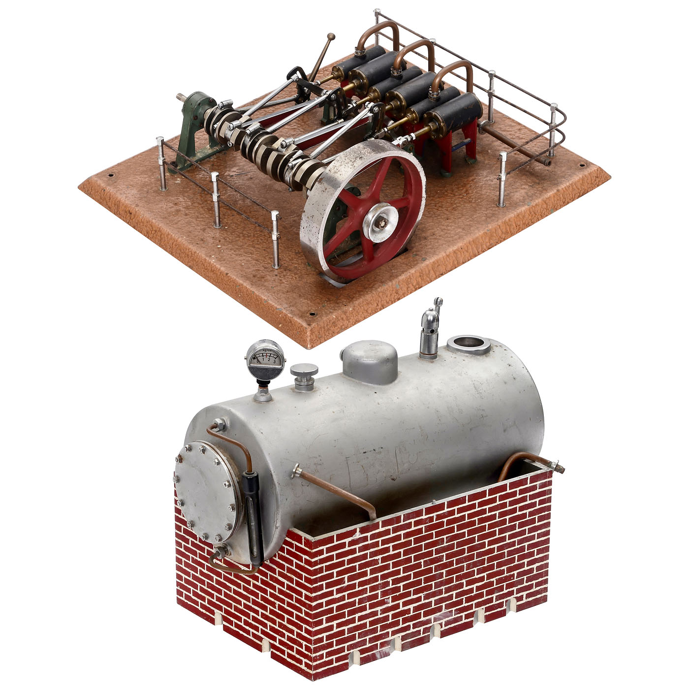 3 double-acting cylinders, reversible, with eccentric rings and counter-eccentrics, crankshaft with counterweights, 4 ¾ in. flywheel, on painted metal baseplate, 11 ¾ x 14 1/5 in., smooth-running, but untested. - In addition: Incomplete steel boiler, length 13 1/3 in.