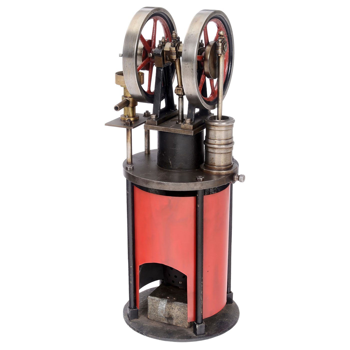 Working and displacing cylinders arranged side-by-side, overhead crank, air-cooled, spirit burner, two flywheels, Ø 5 3/5 in. each, overall height 19 1/3 in., smooth-running but untested.